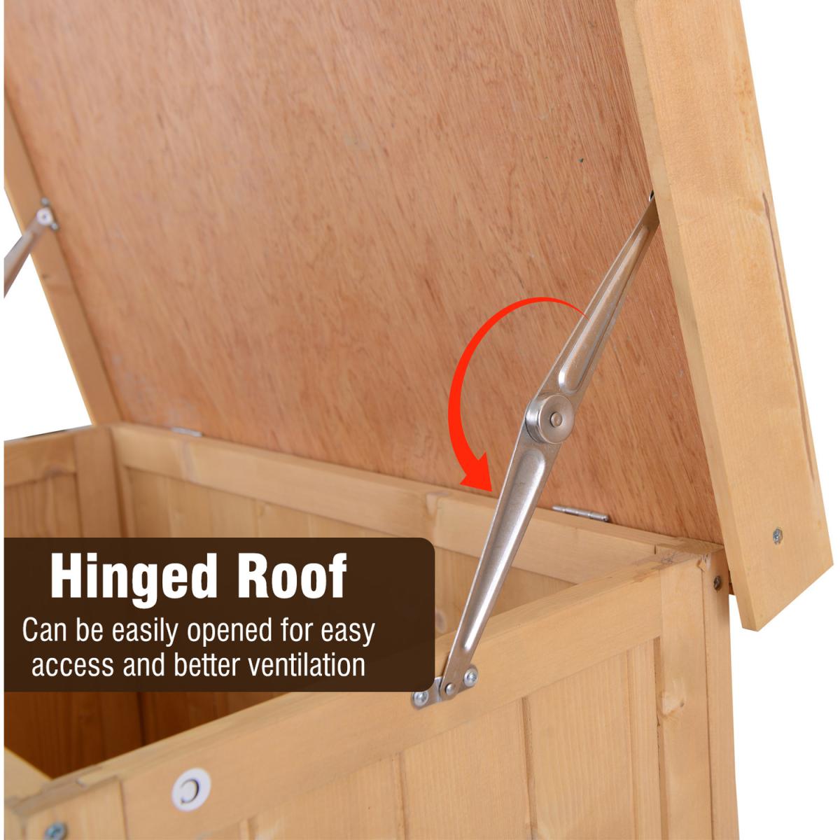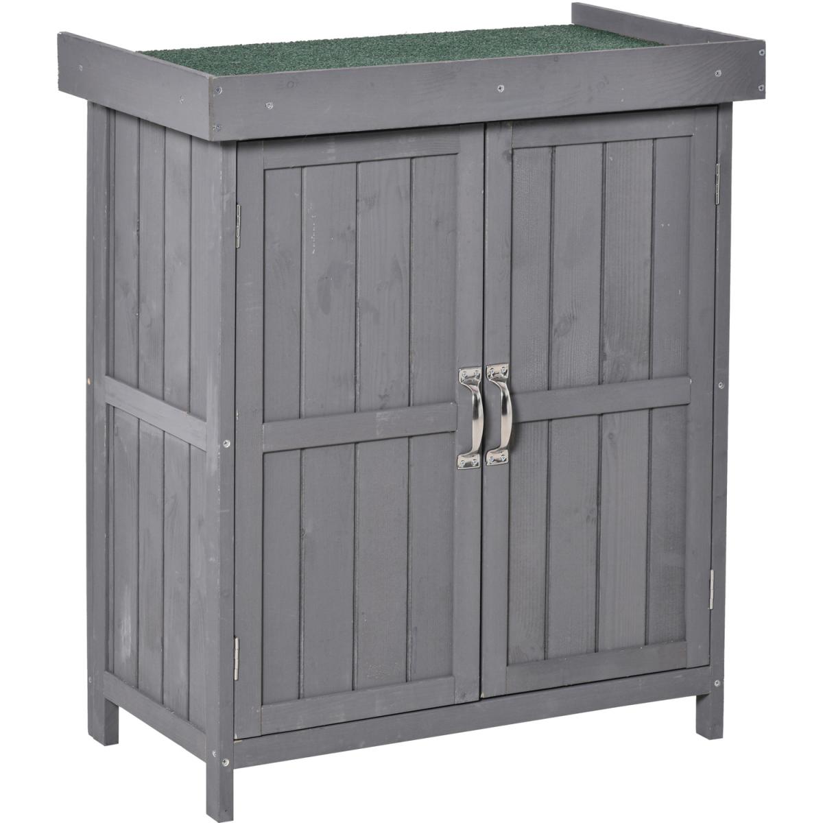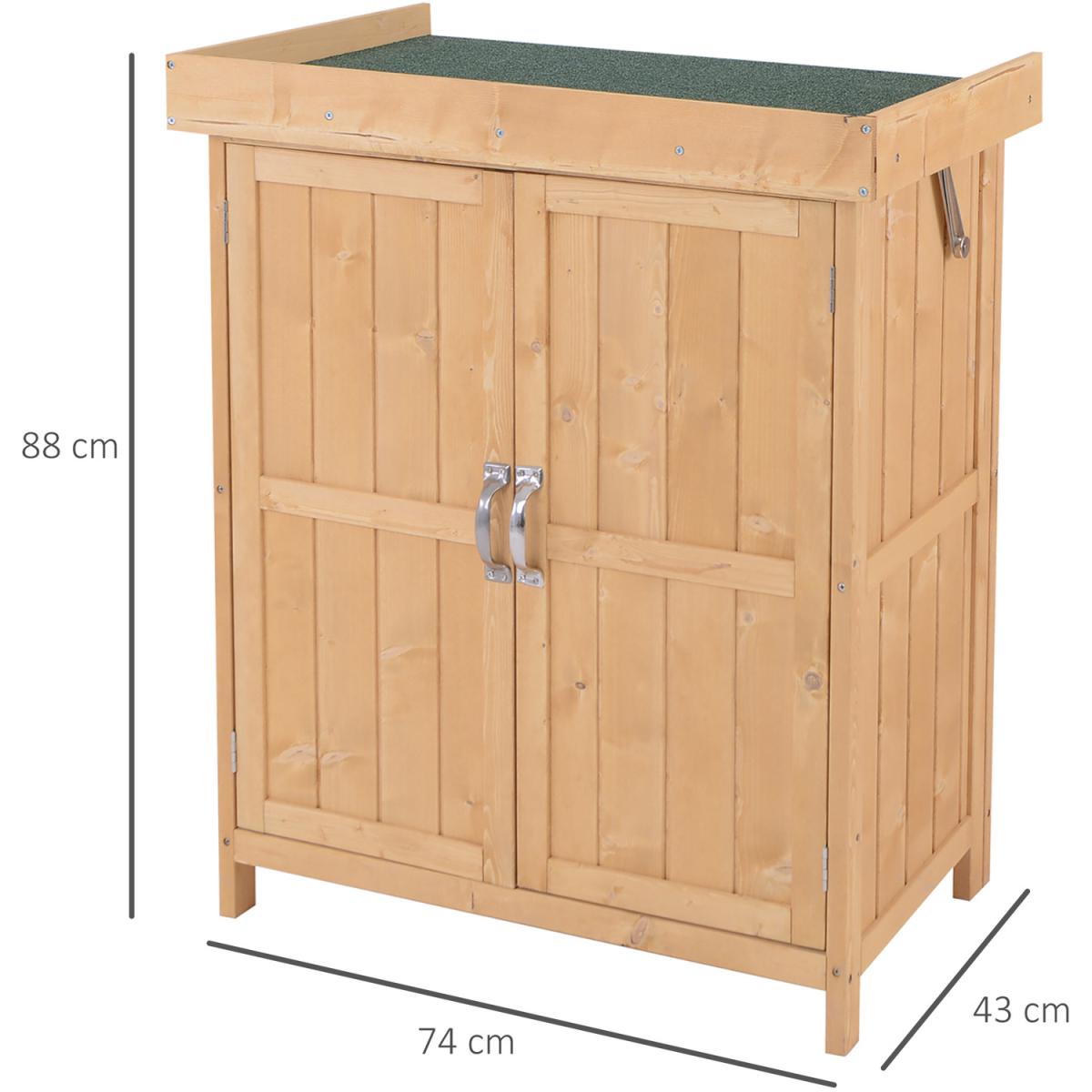 This Outsunny garden storage shed with a 2-tier shelf is an ideal storage solution for storing various tools and garden accessories. The unit has multiple accesses from the double doors in the front and a top lid opening. Water-resistant asphalt roof and painted wooden surface offer durability for outdoor use. Add the compact-size and functional storage shed to your garden and keep all your supplied tools handy for convenient access. Water-resistant asphalt roof and painted wooden surface offer durability for outdoor use.