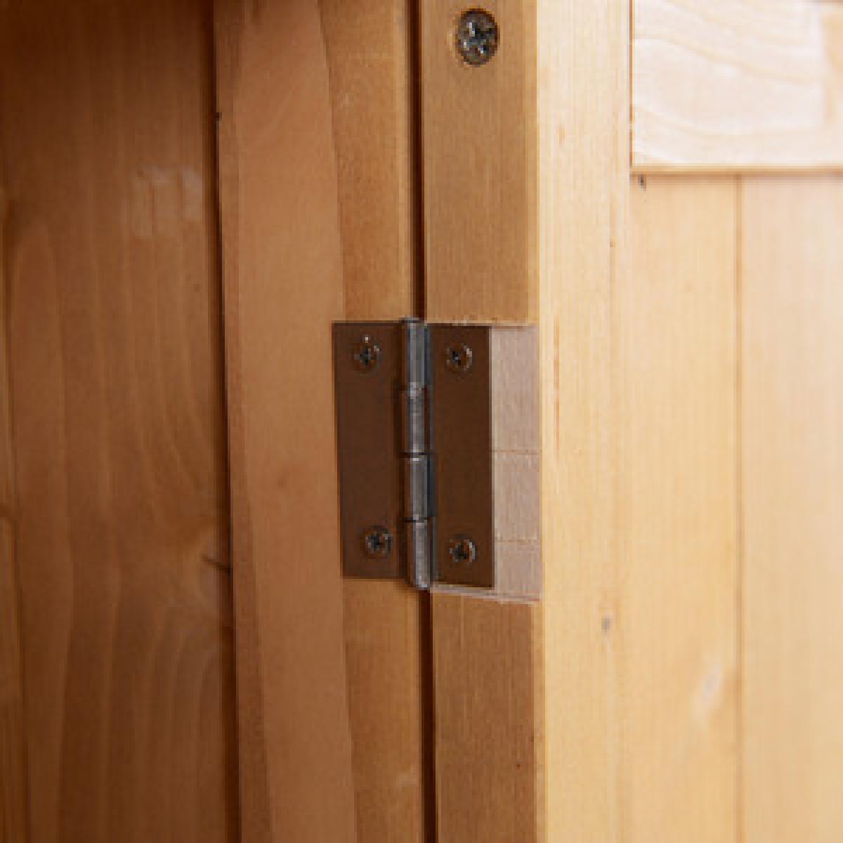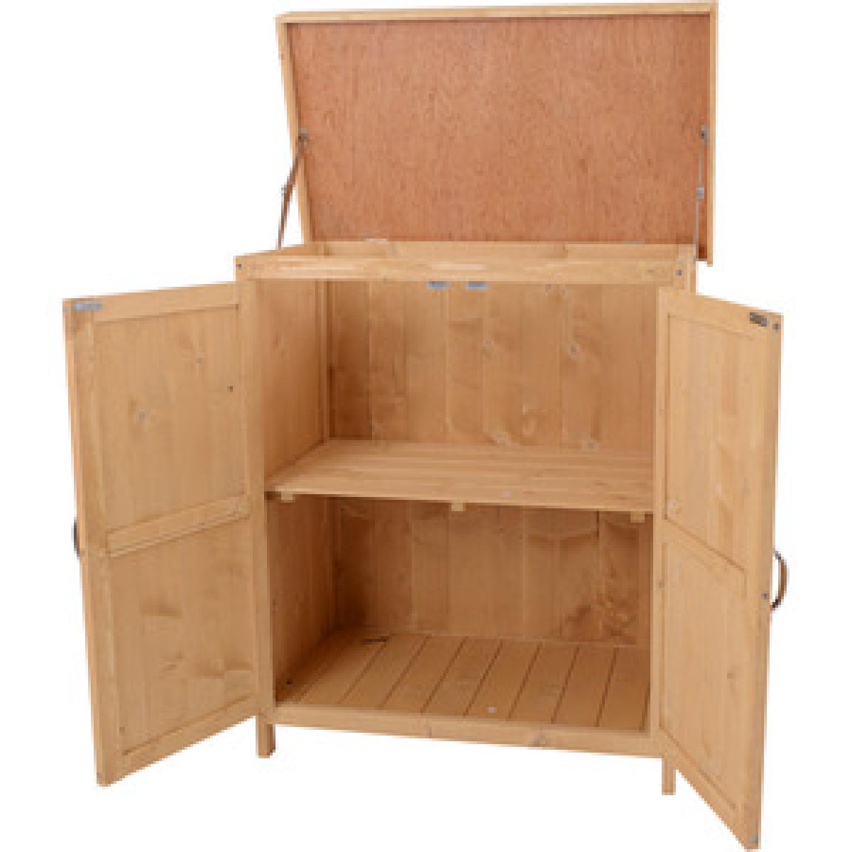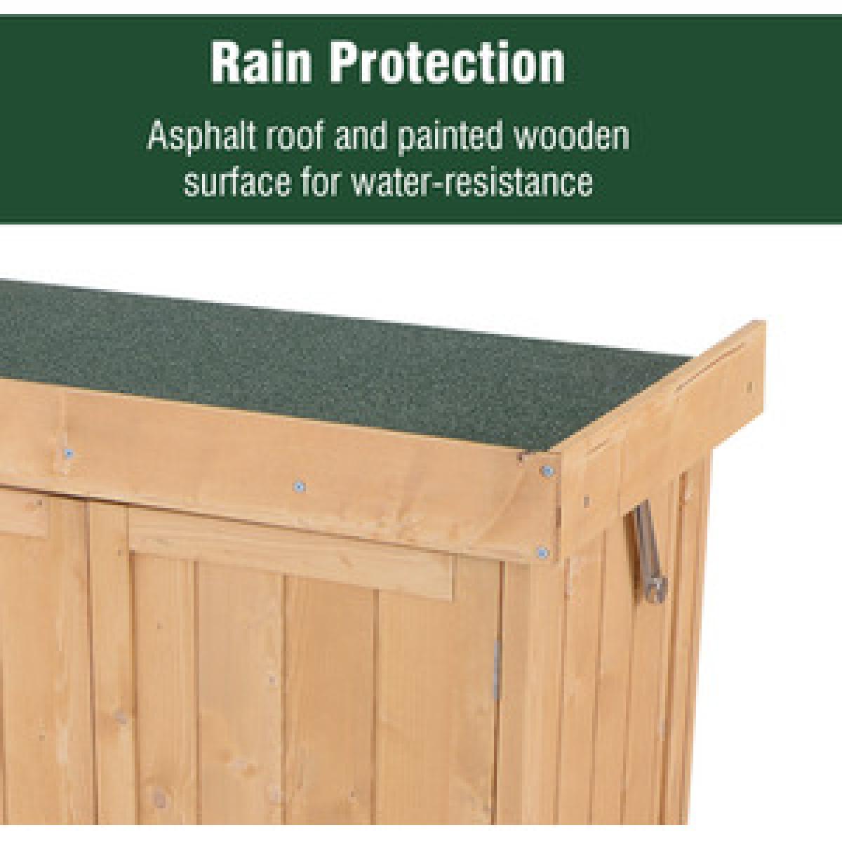This Outsunny garden storage shed with a 2-tier shelf is an ideal storage solution for storing various tools and garden accessories. The unit has multiple accesses from the double doors in the front and a top lid opening. Water-resistant asphalt roof and painted wooden surface offer durability for outdoor use. Add the compact-size and functional storage shed to your garden and keep all your supplied tools handy for convenient access. Water-resistant asphalt roof and painted wooden surface offer durability for outdoor use.