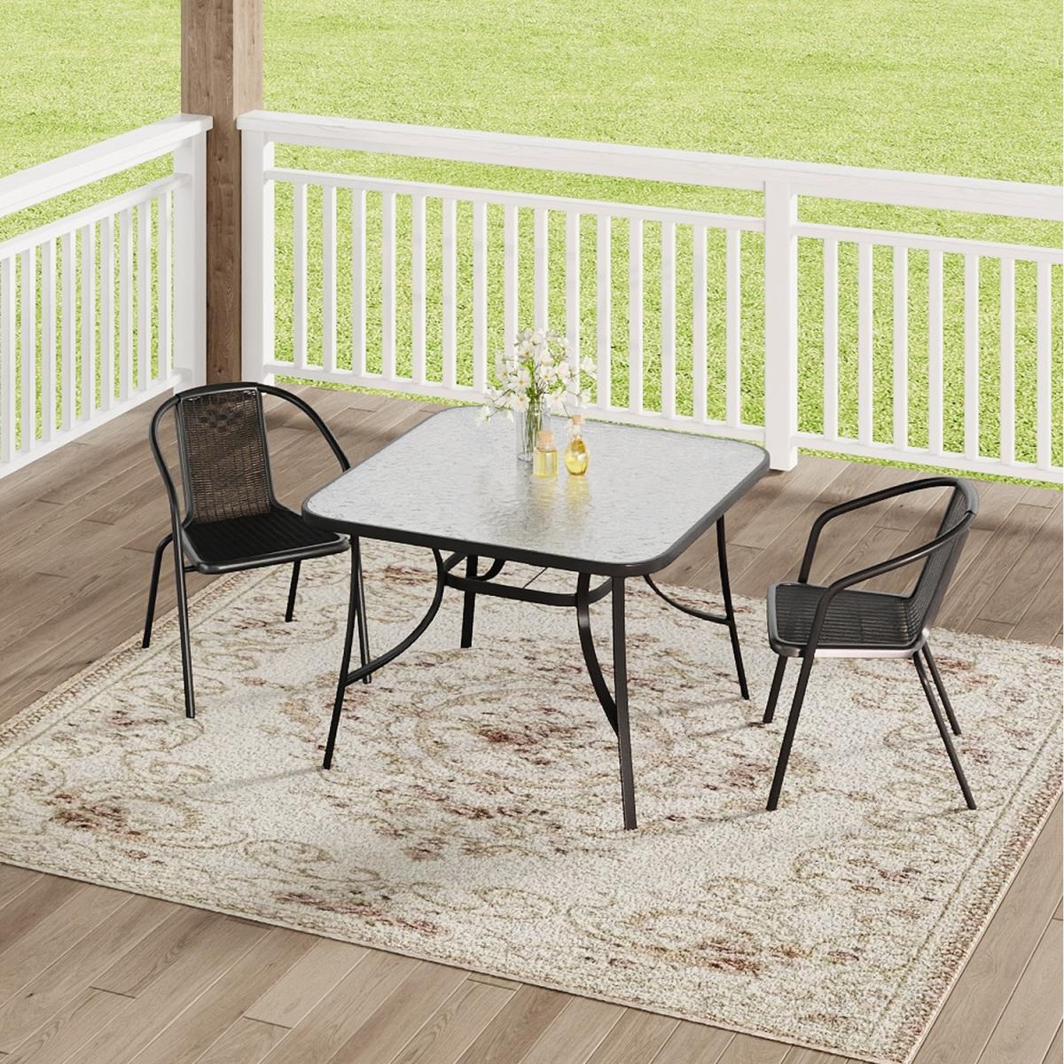 Inspired by classic wrought-iron furniture, this Komore garden table adds a romantic charm to your outdoor space. With a timeless black finish and a sleek, simple design, the screen-printed table complements any garden or terrace beautifully. It combines attractive aesthetics with quality craftsmanship and a practical tabletop designed for long-lasting use. Suitable for both sunny and wet weather, it features a central hole for an umbrella. The set also includes two rattan chairs, made from weather-resistant PE rattan and supported by a rustproof metal frame, ensuring durability and stability for outdoor dining.