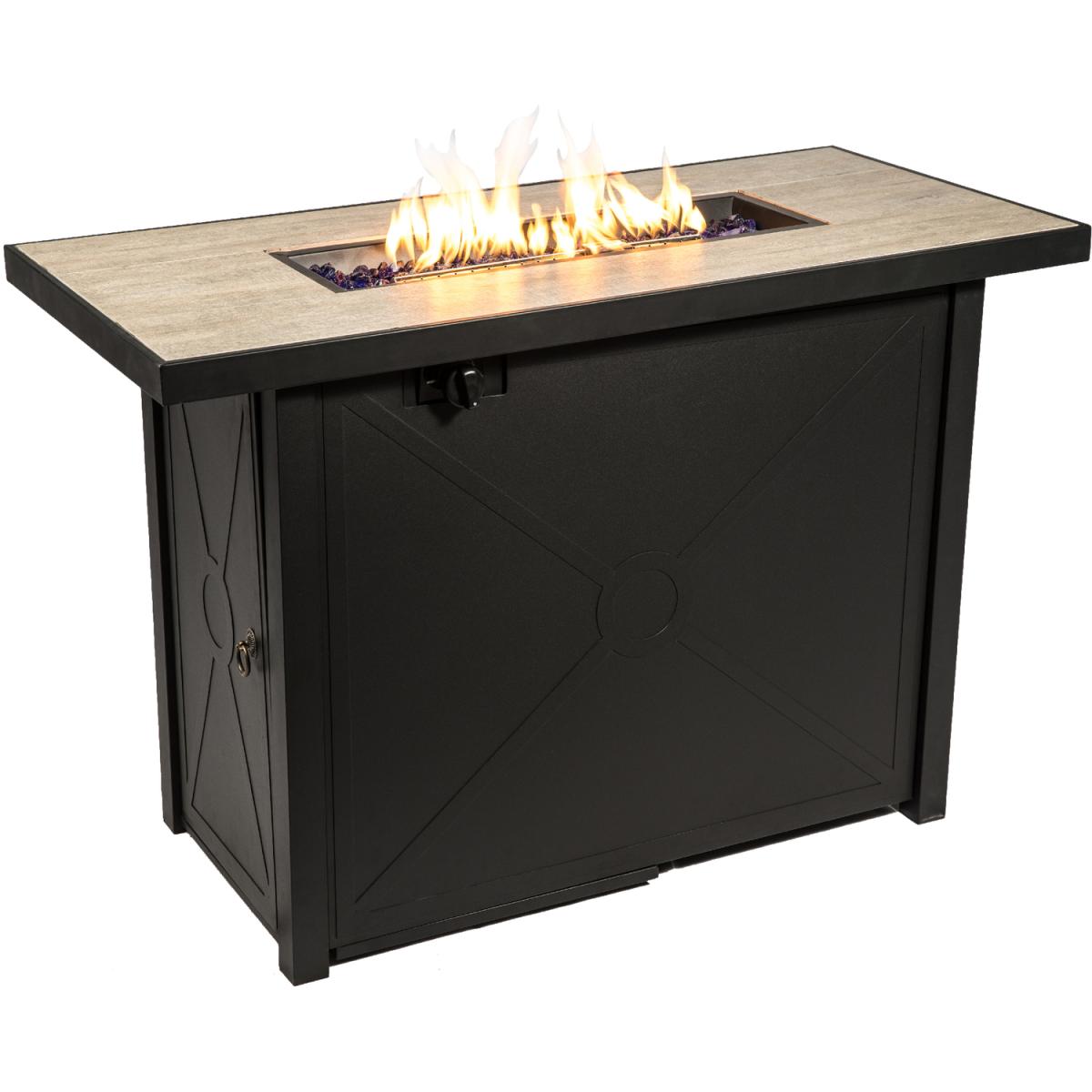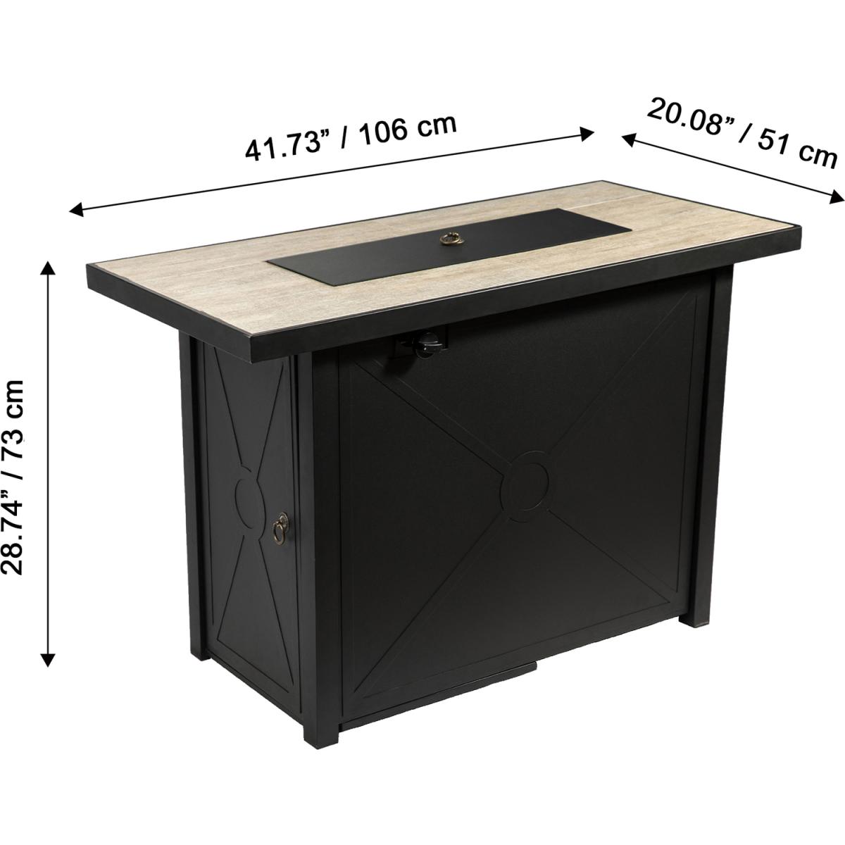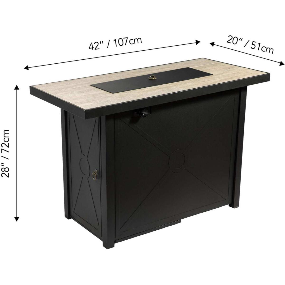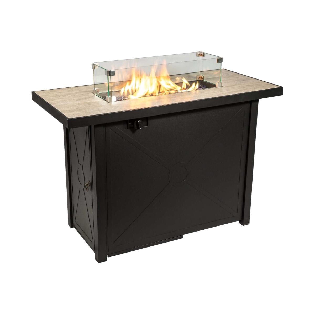 The Teamson rectangle gas firepit is a classic versatile gas heater and is a wonderful addition to any patio garden area and is sure to provide you and all of your guests with warmth in an outdoors space. This durable, lightweight metal outdoor gas firepit is easy to use with any propane gas bottle source. You don't have to worry about building a fire at an instant once its hooked up to the gas bottle. This outdoor gas burning fire pit comes with lava rocks and easy ignition for quickness. Adjustable flames are the perfect addition to light up the garden. This tall, metal firepit is beautifully made and is the perfect companion to a garden sofa set which will add to the intimate feeling for a family night in or friends are gathered.