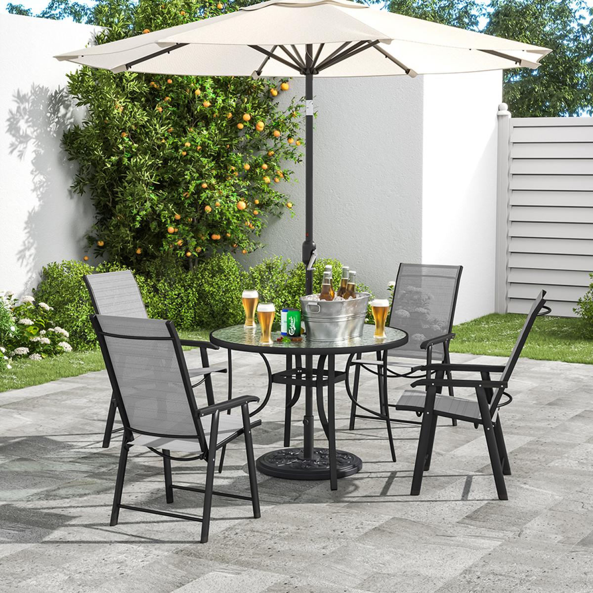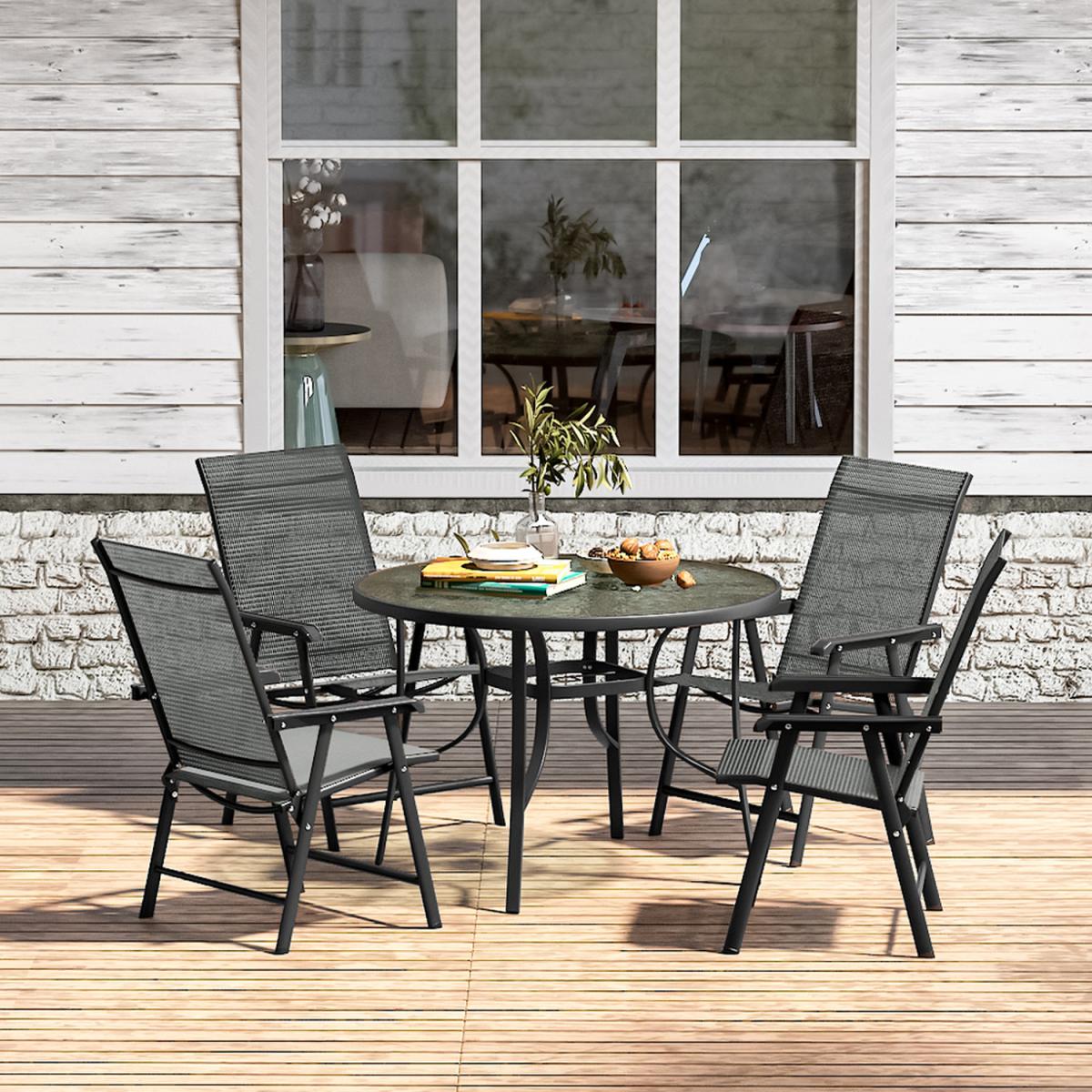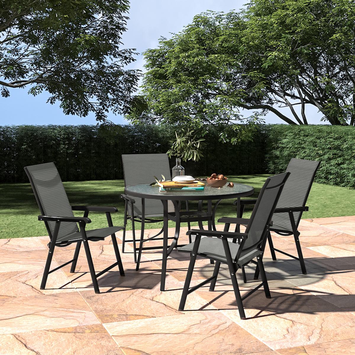 Outdoor Glass Table Bistro Set - Black / Round / 4 x Folding Chairs; 1 x Table