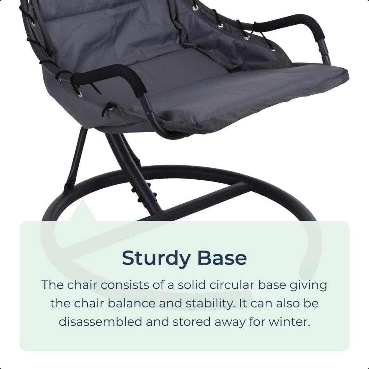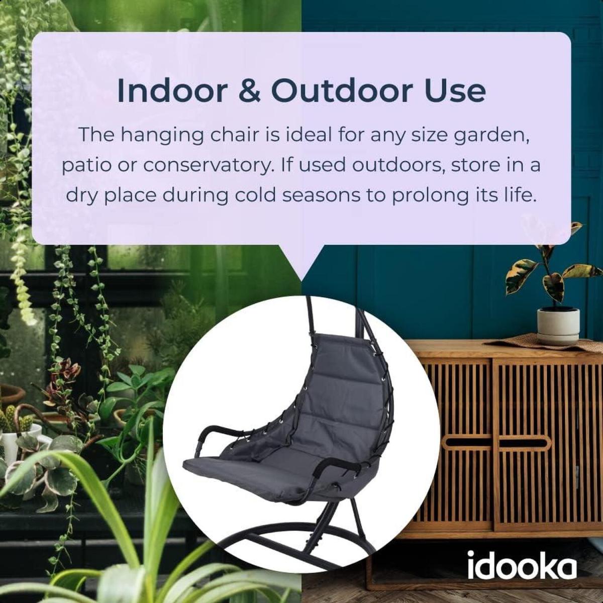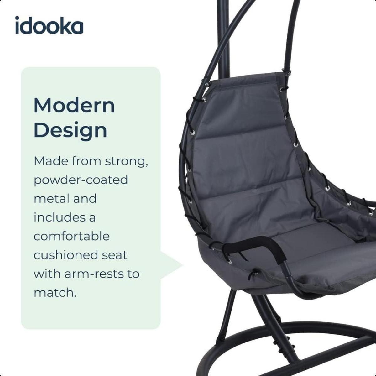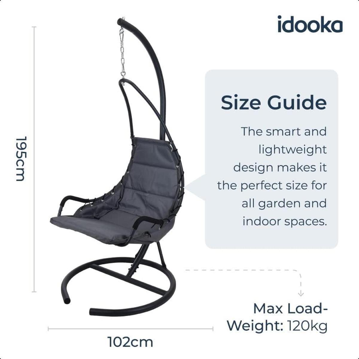 Get ready to relax with the revolutionary idooka garden swing chairs that provide unparalleled comfort. With padded polyester cushions and chair foam, these floating seat cushions will make you feel like you're drifting away. These black garden chairs have a powder-coated steel frame that adds to their luxurious look and feel. At 90cm x 102cm x 195cm, they're convenient and easy to fit into any space, making them ideal for balconies and gardens. With a weight capacity of up to 120kg, they're sturdy and durable. This grey armchair is perfect for outdoor or indoor use and comes with a single stainless steel chain for suspension. Whether you want to read a book or just relax, this garden hammock chair with stand is perfect for year-round use. Place it anywhere in your garden or home and enjoy the comfort it provides.