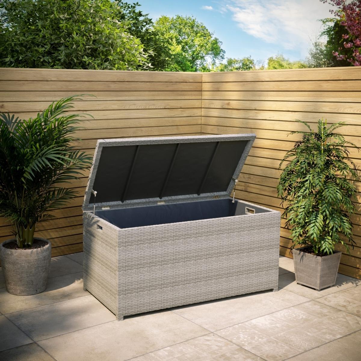 Keep your garden or conservatory clutter-free with this stylish rattan storage box. With ample space inside to hide away cushions from your garden set or even outdoor equipment, you need quick access to. The waterproof lining with a zipper helps keep them dust-free when not in use. Enhance the life of your garden furniture- This product has been designed to be used outdoors. To make the most of your furniture, we recommend that you store it indoors, move it in a sheltered position or protect it by covering it up in bad weather and over the winter period. Why not invest in one of our garden stores to help keep it dry and prevent any mould or mildew from forming.