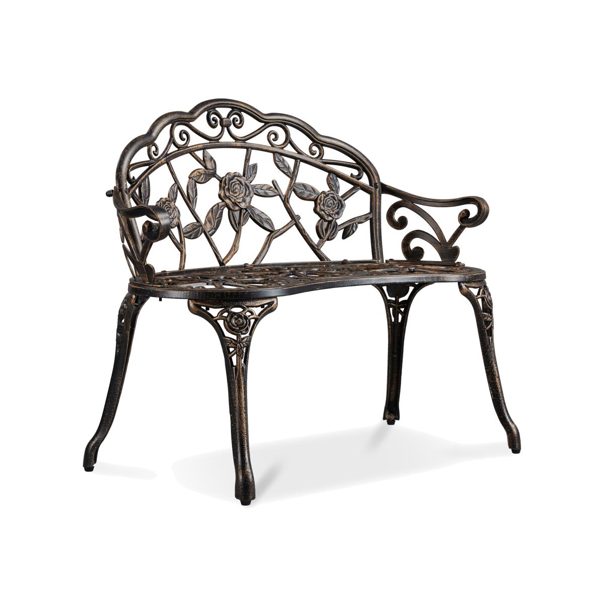 Classic rose patterns are crafted on the back of this outdoor metal bench, the back is shaped as floral rose petals, classic and antique design make this patio metal bench suitable for most outdoor settings. The cast aluminium bench is rust-resistant with a waterproof finish. Sleek and round edges are thoughtfully designed for safe sitting. Slant armrests and legs make users' sitting experience comfortable and durable enough to ensure long-term usage. Outdoor Patio Metal Bench with Rose Pattern - Bronze