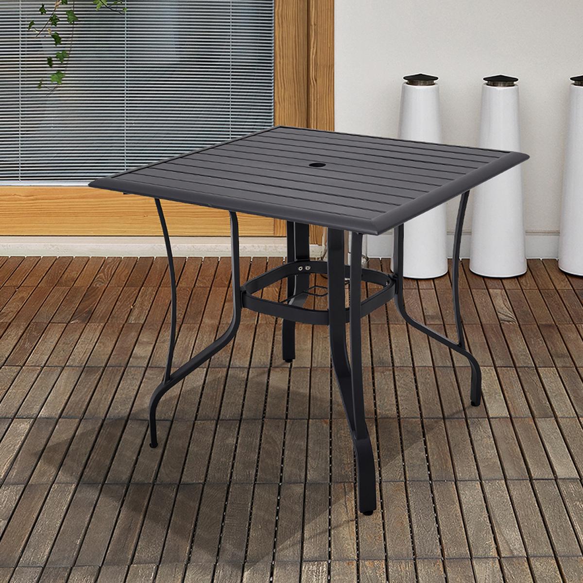Enjoy a refreshing morning or evening with friends around our Metal Slatted Coffee Table. Made from durable, corrosion-resistant metal, this sleek table is designed to endure the elements. Ideal for minimalist style lovers, it features a built-in parasol hole for easy sun and wind protection with a parasol. Outdoor Metal Slatted Garden Table - Black / 18kg
