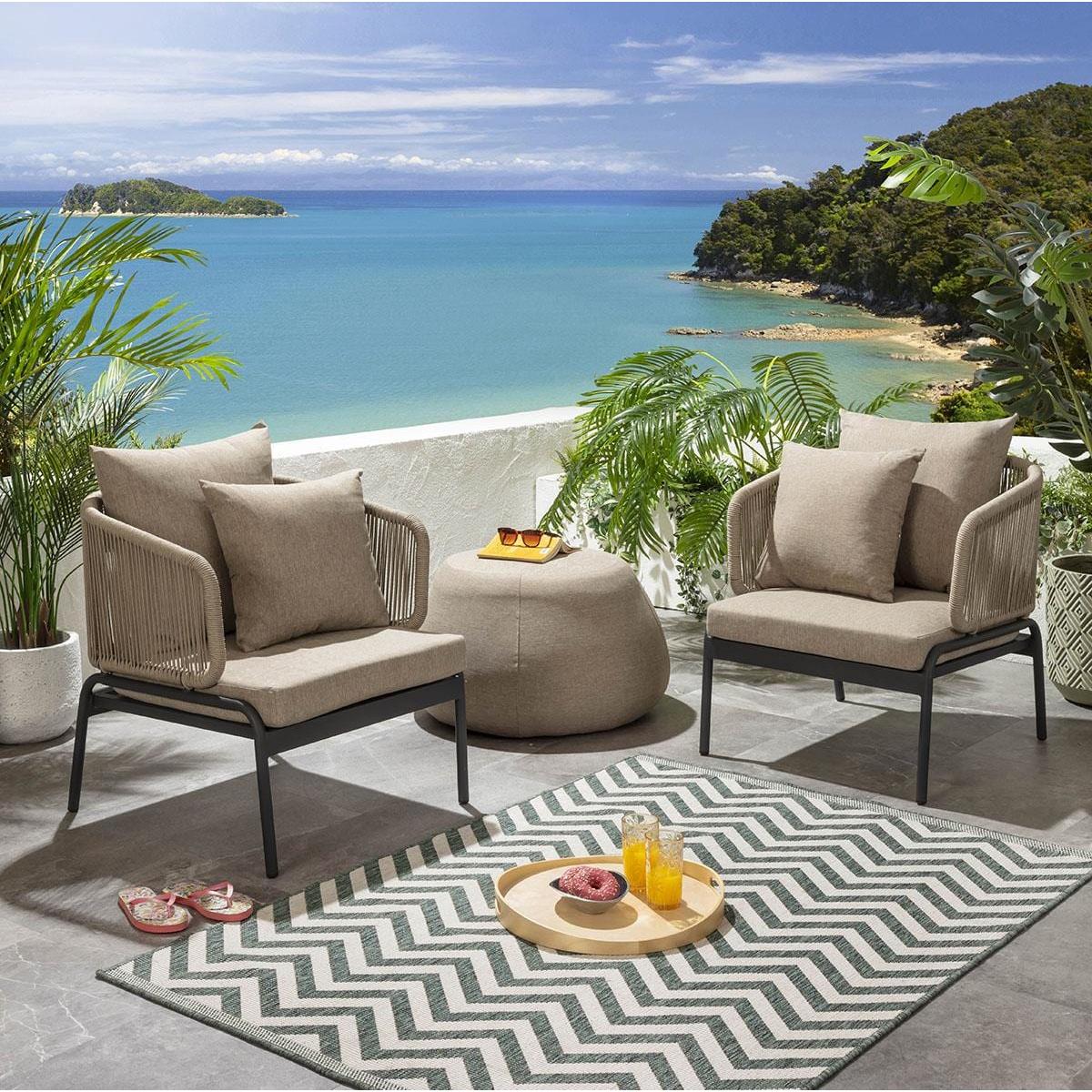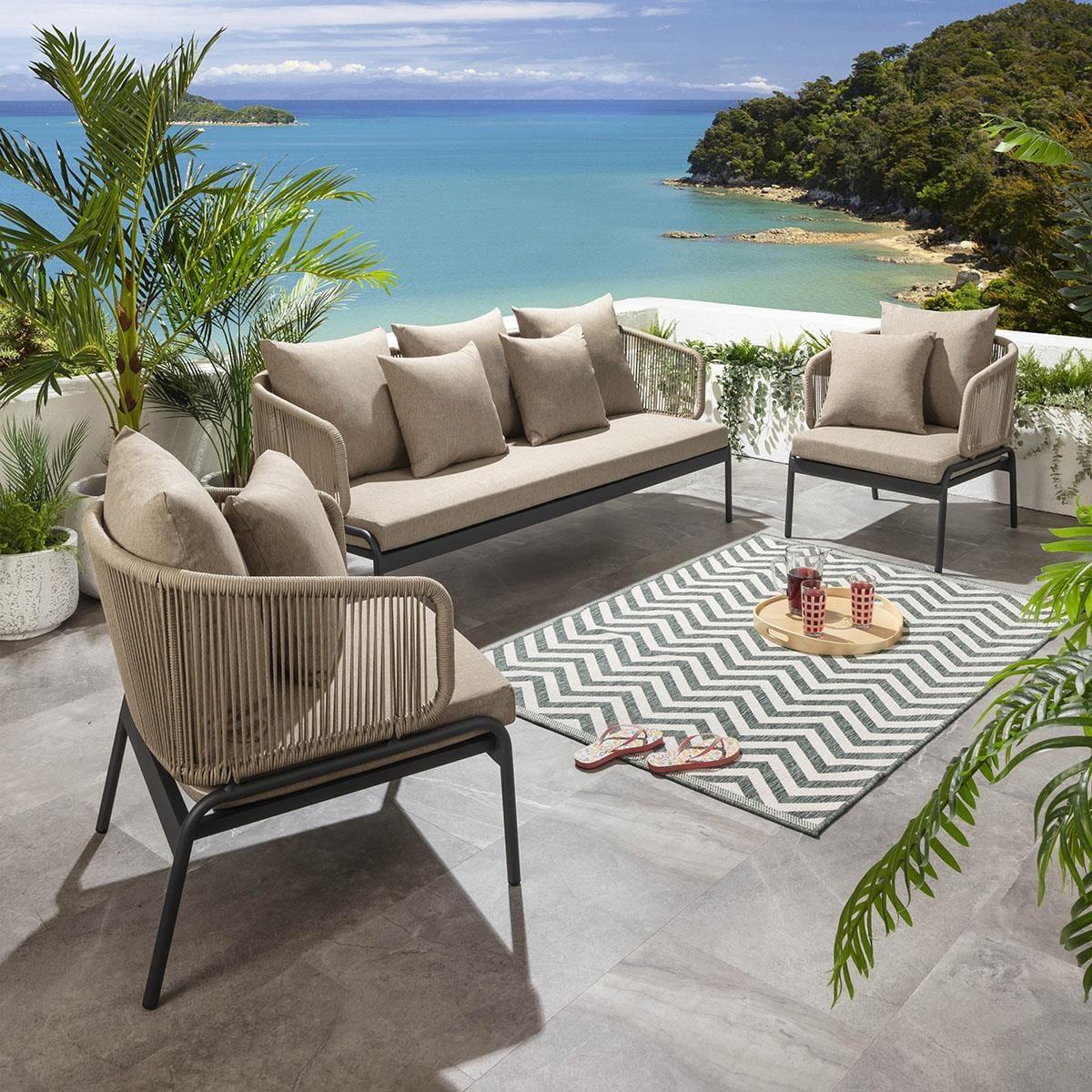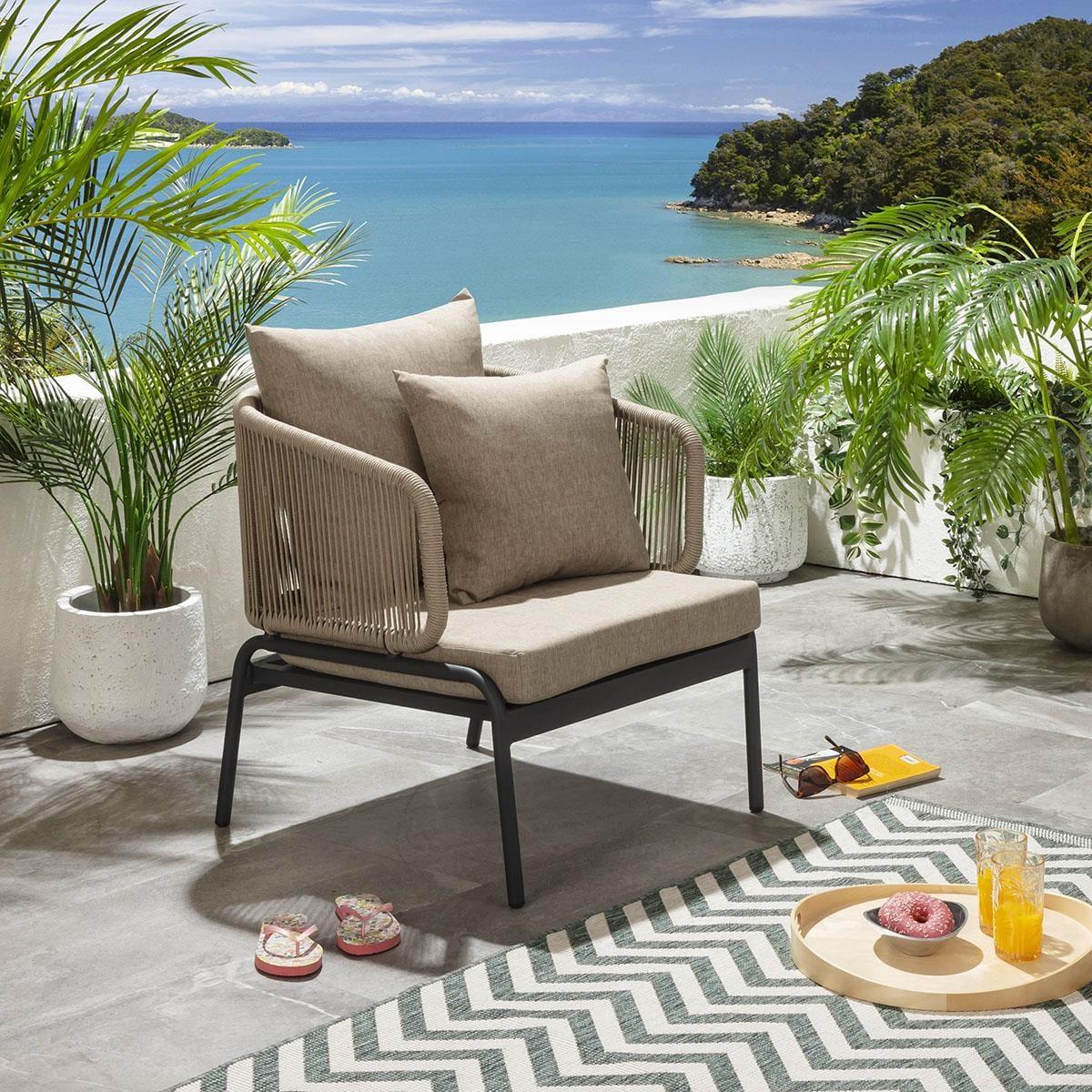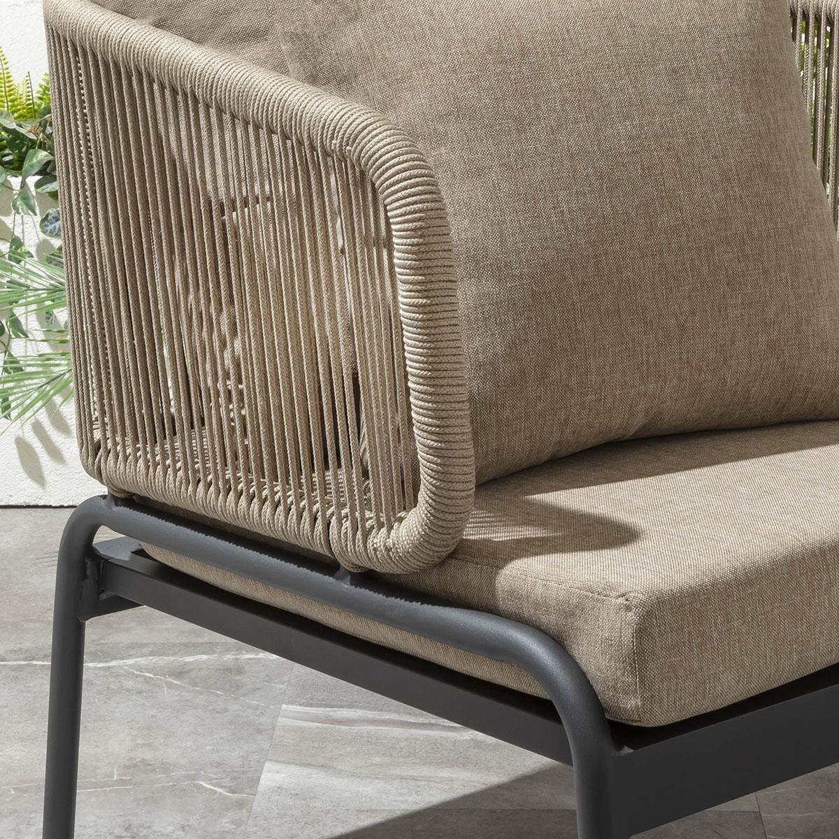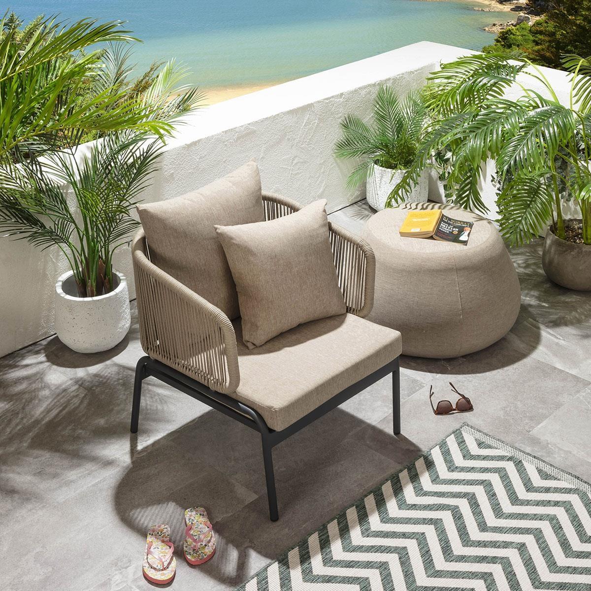 Our Jasmine outdoor armchair is perfect for garden lounging. With its high back and sides, it features a wrap-around backrest and arms for luxurious comfort. The garden chair boasts a full aluminium frame finished in a sleek grey paint, complemented by an intricate thin beige rope weave and cushions for added support. Designed with both style and durability in mind, this garden armchair boasts a modern aesthetic that elevates any outdoor patio space. The high back and sides provide ample support, while the wrap-around design ensures a cosy and inviting feel. The full aluminium frames not only offer stability but also add a touch of sophistication with their premium grey paint finish. Crafted for luxurious relaxation, the cushions of this outdoor patio chair are made with high-quality foam and upholstered in durable beige outdoor fabric. Whether enjoying a sunny afternoon or hosting evening gatherings, these cushions provide the perfect combination of comfort and durability, ensuring lasting enjoyment for years to come. We recommend storing the cushions when not in use to protect them from the elements. Additionally, weather covers are included with the armchair to further safeguard it against rain, sun, and other outdoor elements, ensuring that your garden chairs remain in pristine condition season after season. W69cm D72cm H75cm Seat Height 39cm Available with matching sofa