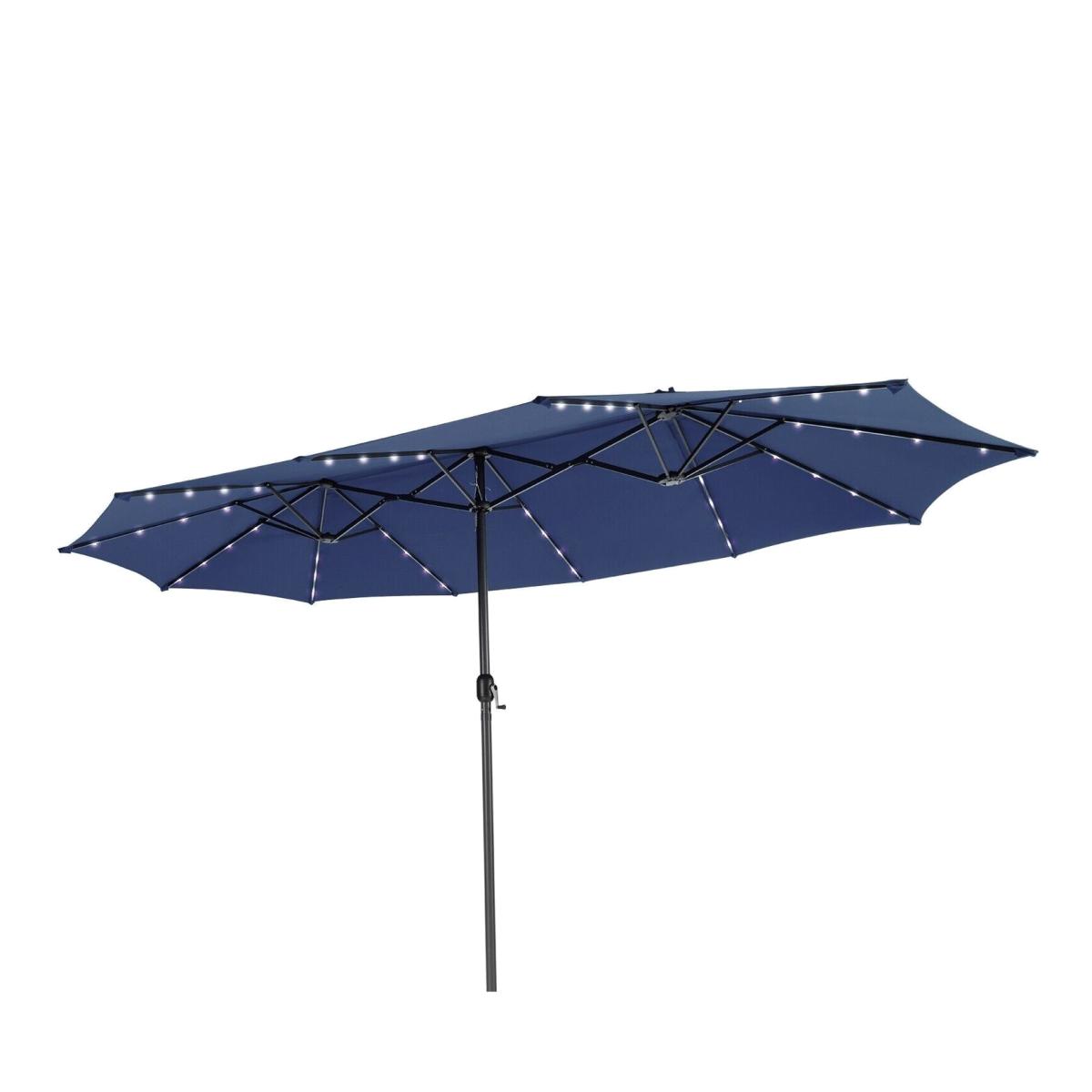 Do you need a large sun shelter to spend tea time with friends in the garden Our double-sided patio umbrella brings both visual decoration and daily practicality to your home, outdoor market and cafe. Extra-large canopy provides spacious shady space for a set of outdoor furniture. And the high-quality fadeless fabric well withstands long-term use. The 12-rib metal structure ensures excellent sturdiness and lasting durability. With 48 solar LED lights on the ribs, this patio umbrella will bring charming brightness to the night garden, and there is a design to place a standby battery for extra power supply.