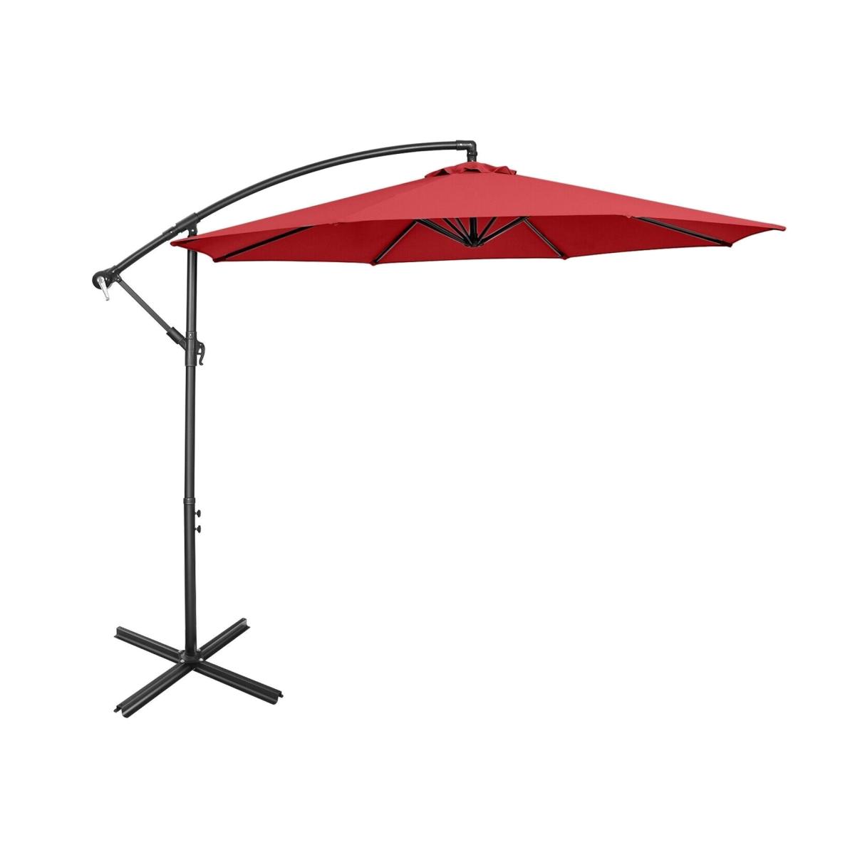 Are you still looking for an appropriate patio umbrella for your yard Come and see ours! This whole umbrella frame is mainly made of solid iron which highly improves overall sturdiness. There is a cross base and a weighted base(not included) is needed to keep our umbrella stable. Plus, 8 iron ribs further ensure that the patio umbrella will stay stable all the time. Apart from the sturdy structure, the workmanship of the umbrella is also very exquisite. Outdoor Parasol Offset Banana Hanging Umbrella with Crank Handle - Red