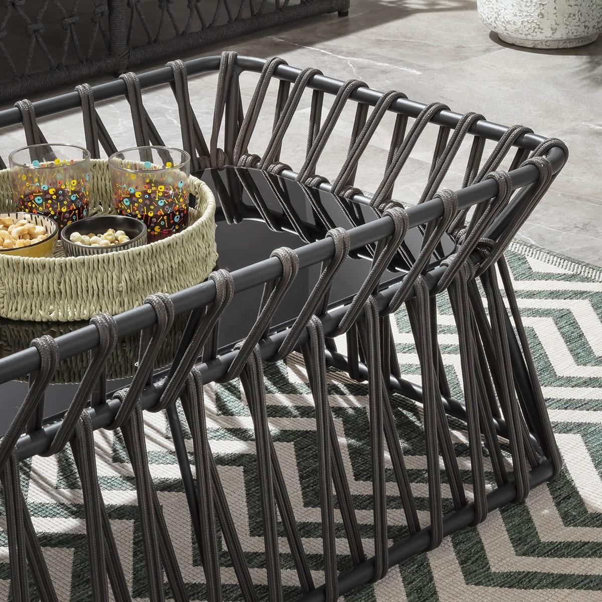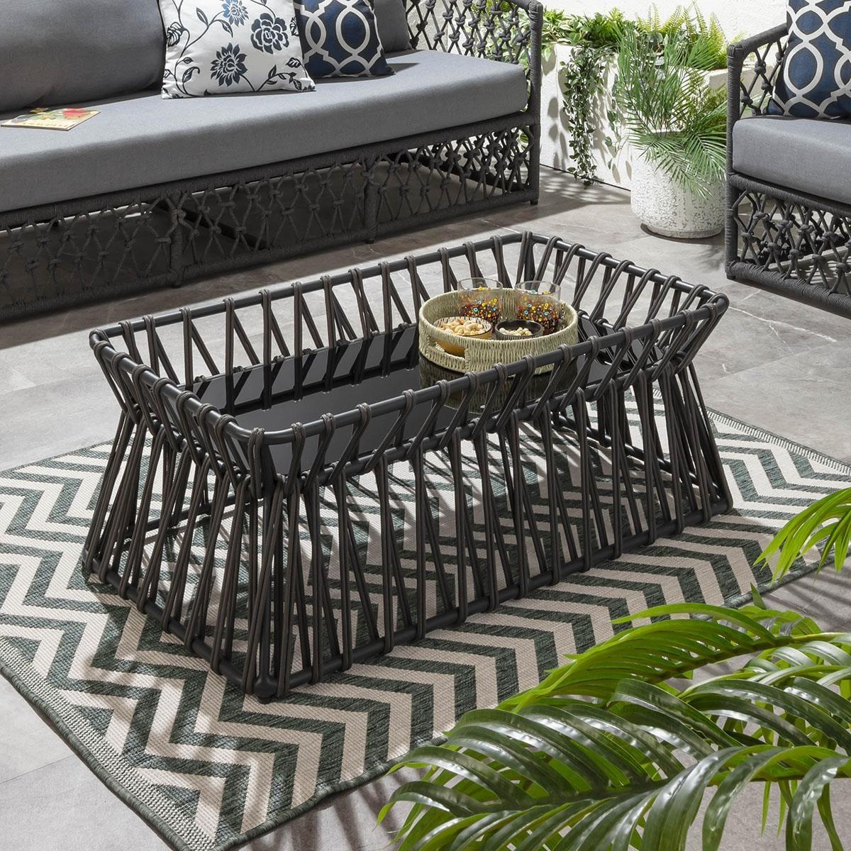 Spanning a spacious 110cm wide, this modern outdoor coffee table features an aluminium frame with rope weave detailing. Its grey hue complements any setting, with a durable gloss black glass top. Designed with functionality in mind, the small garden table has a raised edge to prevent items from sliding off. Our exterior coffee table combines modern aesthetics with practical design. The sleek aluminium frame offers contemporary elegance, while the wide 110cm top provides ample surface space. Its minimalistic design seamlessly integrates into any outdoor setting, making it perfect for gardens, patios, and balconies. Adding a touch of texture, the rope weave detailing around the frame enhances the table's visual appeal. Crafted with precision, the intricate weave adds depth and dimension to the overall design, creating a striking contrast against the smooth aluminium frame. This subtle yet sophisticated feature elevates the table's aesthetic charm. Designed for convenience, our outdoor coffee table is lightweight and easy to move, allowing you to effortlessly rearrange your outdoor space. For added convenience, weather-resistant covers are included, ensuring that your table stays protected from the elements when not in use W110cm D60cm H40cm Aluminium frame Weather covers are included