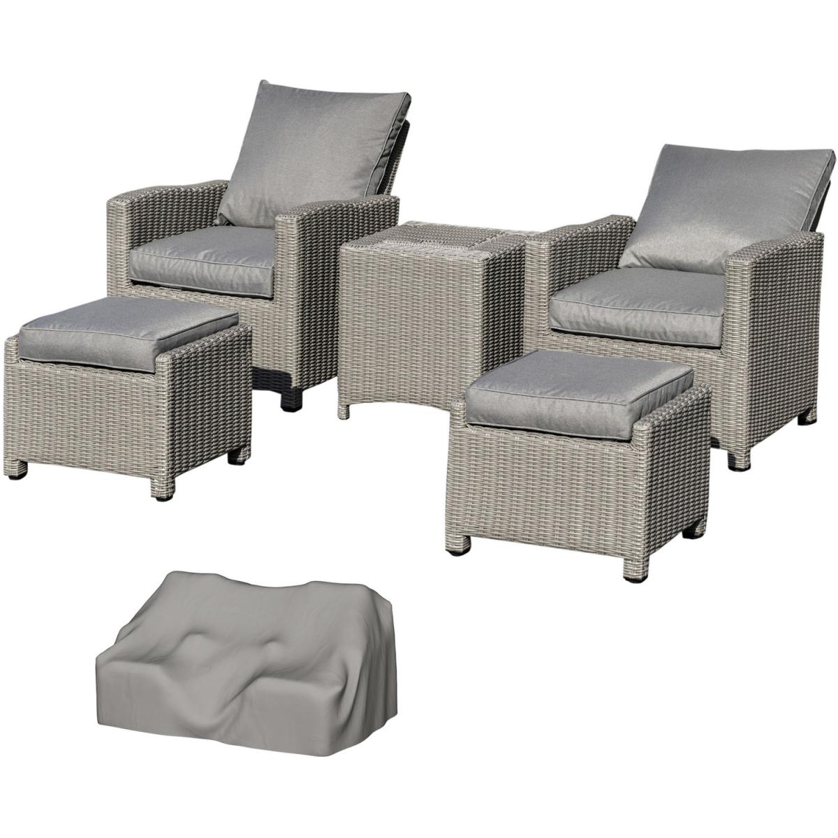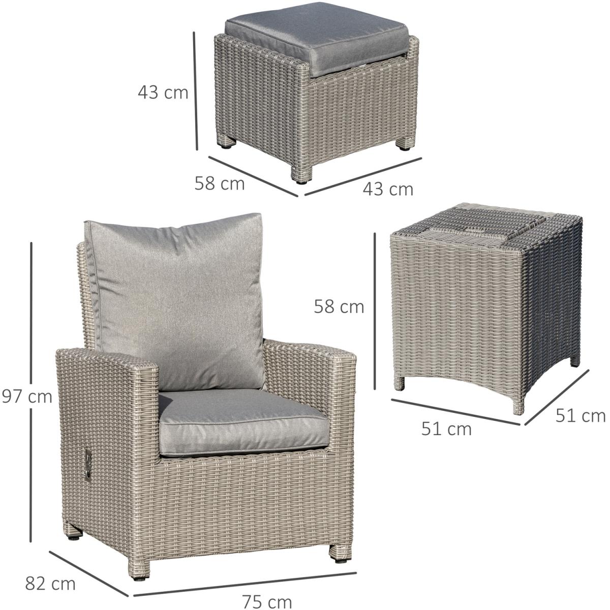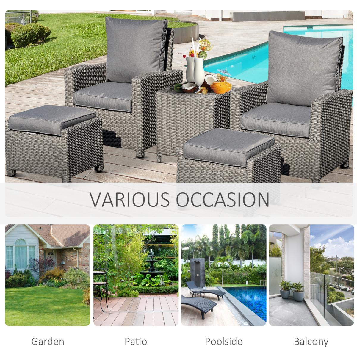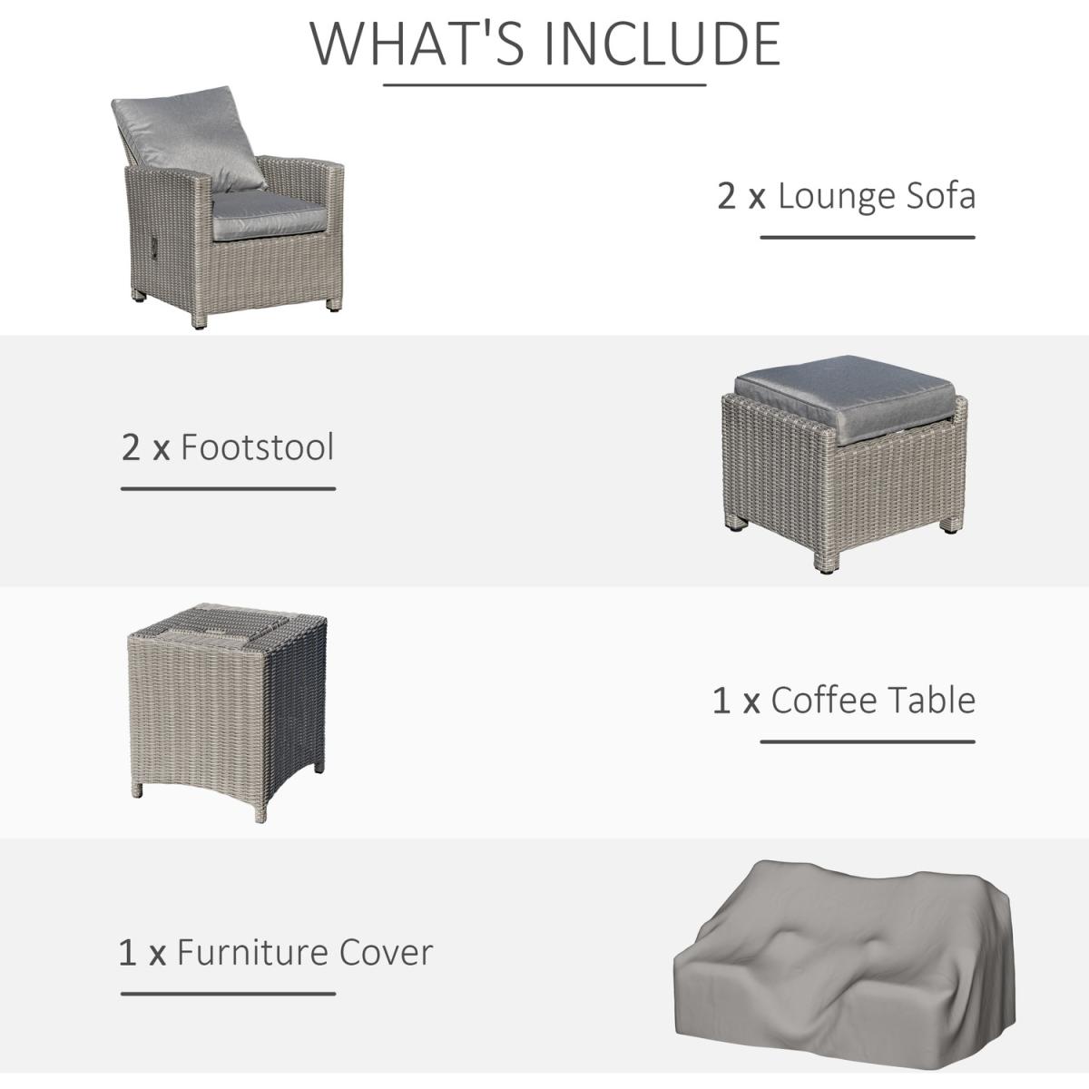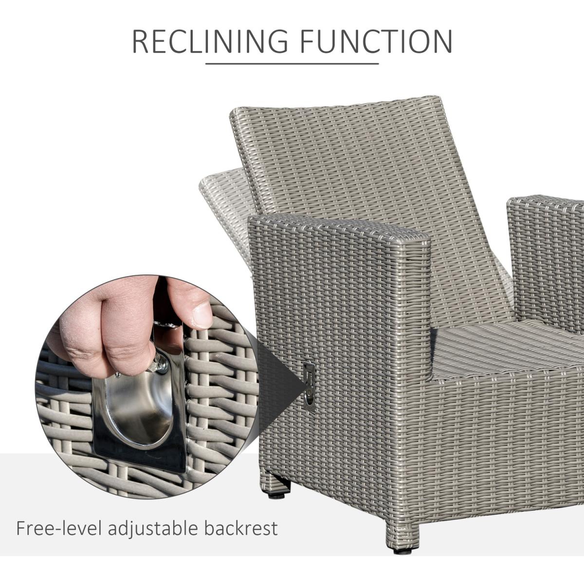 Sit back and relax in complete comfort with this rattan chair and stool set from Outsunny. Formed of five pieces, the set includes two reclining armchairs, two footstools, and a matching coffee table. Made from hand PE rattan with aluminium frame, each piece is sturdy, weather-resistant, and low maintenance. The table comes with an inner cooler to keep food and drink fresh and away from pests. The cushions ensure comfort for long periods. Each piece is finished with adjustable feet for balance.
