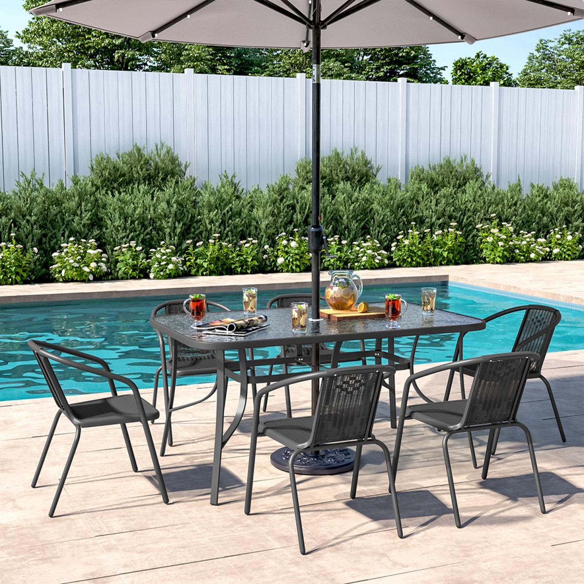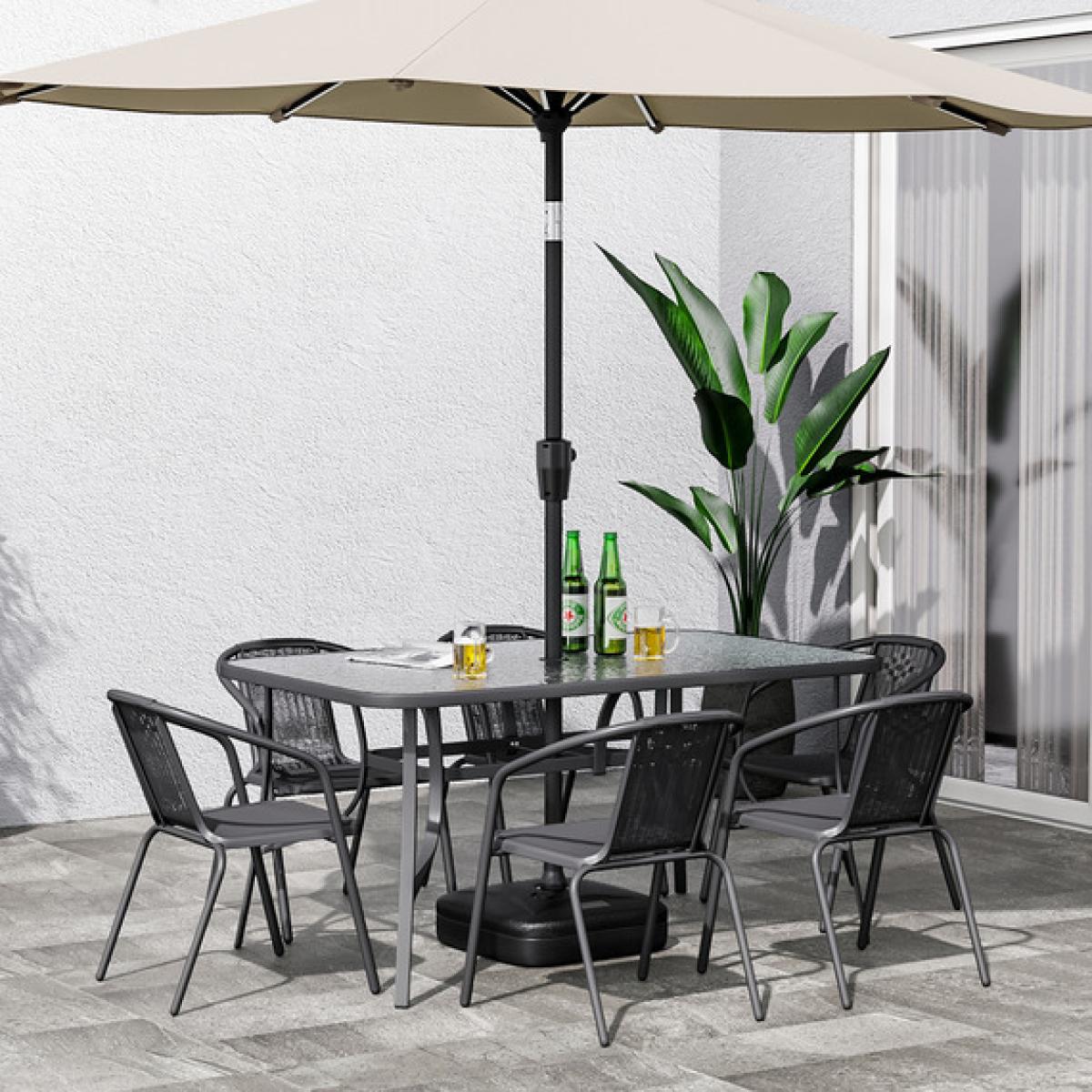 Our patio bistro dining set will be perfect for your outdoor, indoor life. Made of solid steel frame with durable, weather-resistant material for years of use. The chairs are completely weatherproof with UV protection. Matched with a coffee table that has a tempered glass top for you to put snacks, drinks, brunch, and magazines on it. All edges of chairs and table are rounded-corner to protect you from being injured. This patio bistro furniture is the best choice for you to enjoy yourself with your friends or families in your garden, poolside, backyard or balcony.