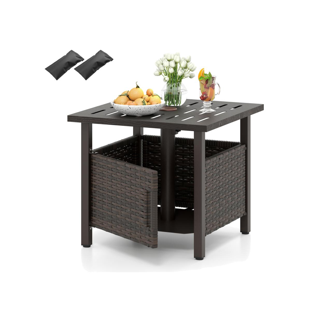 This sturdy patio side table is built with a rustproof zinc-iron alloy and galvanized iron frame, capable of supporting up to 120kg. It features a 4.9cm umbrella hole with an adjustable screw for your poles, ensuring shade and protection perfectly blend into your setup. For added stability, this outside umbrella table includes 2 weighted sand bags, each holding up to 5kg of sand, seamlessly stored via an accessible front door. The inner space also allows you to store items conveniently. Additionally, Adjustable foot pads maintain balance, making this the quintessential addition to your porch, garden, deck, or poolside.