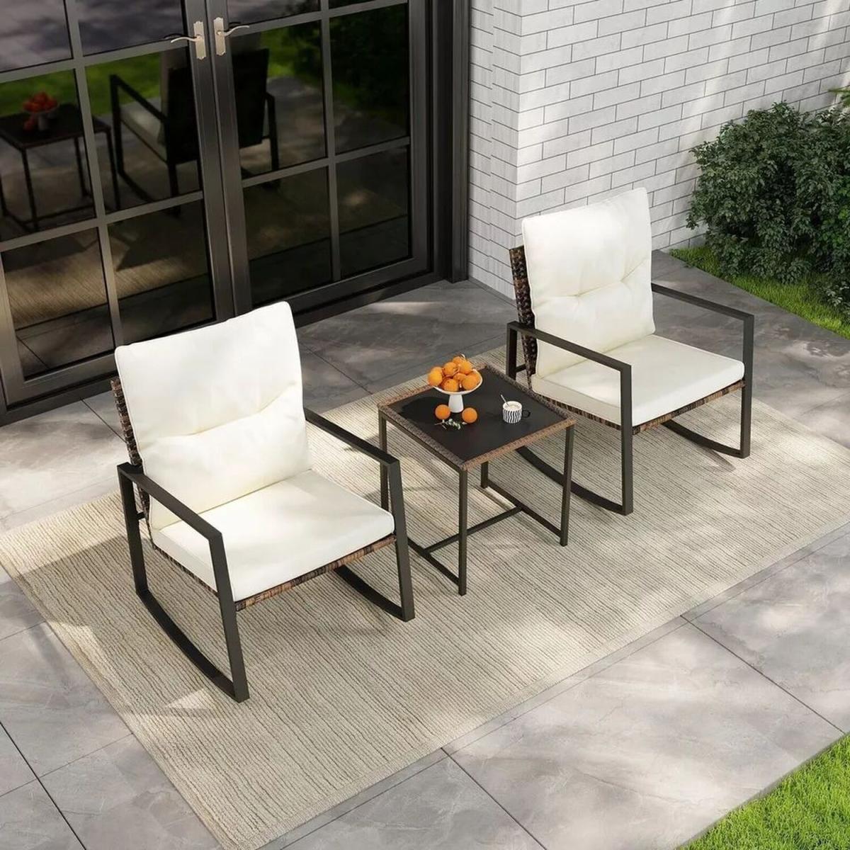 Upgrade your outdoor space with this 3-piece patio wicker chair and table set. Made from durable rattan, it's weather-resistant and stylish, perfect for relaxing mornings or evening gatherings in your garden or patio. Outdoor Wicker Rocking Bistro Set and Cushions - White