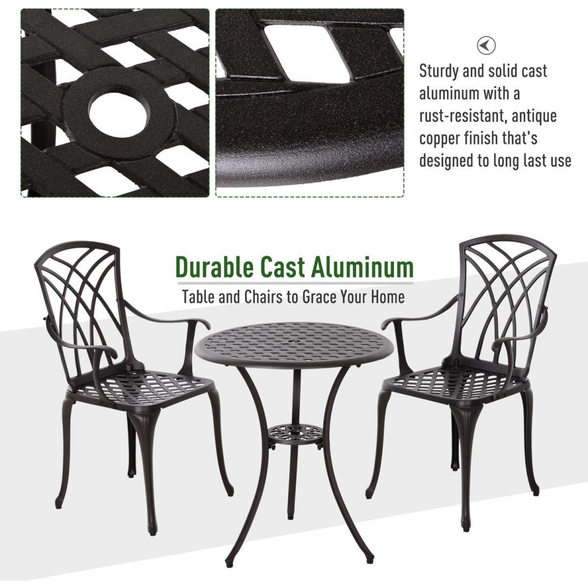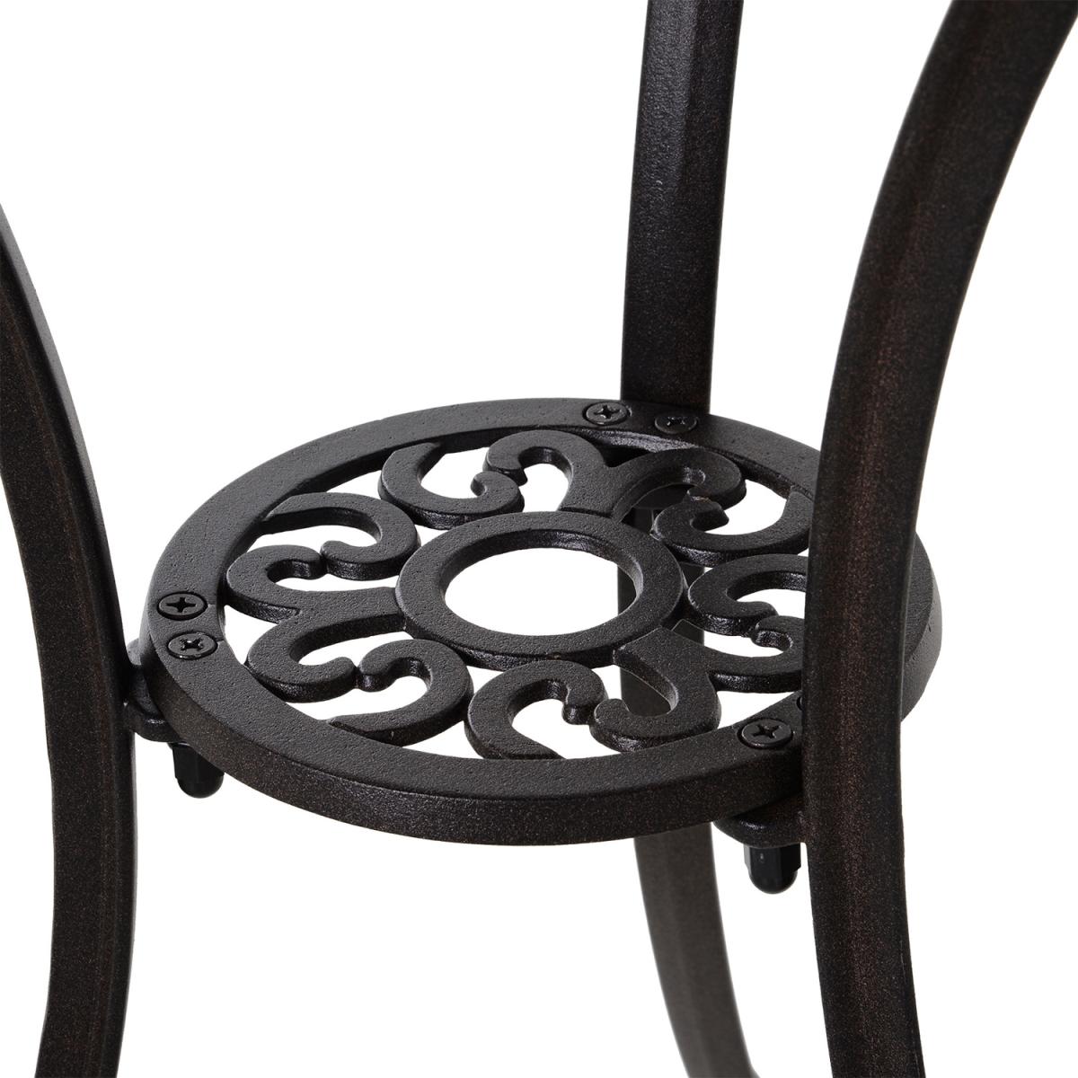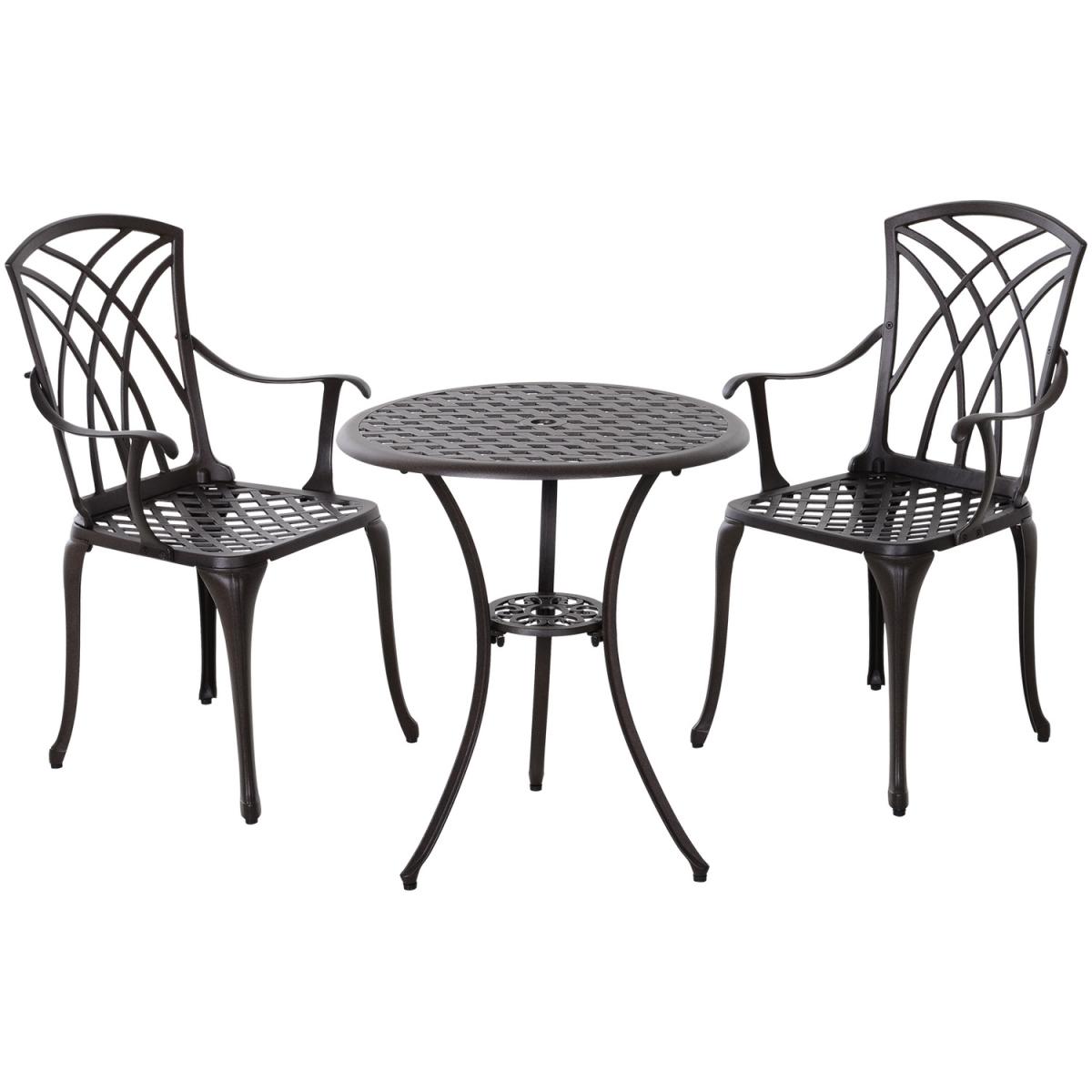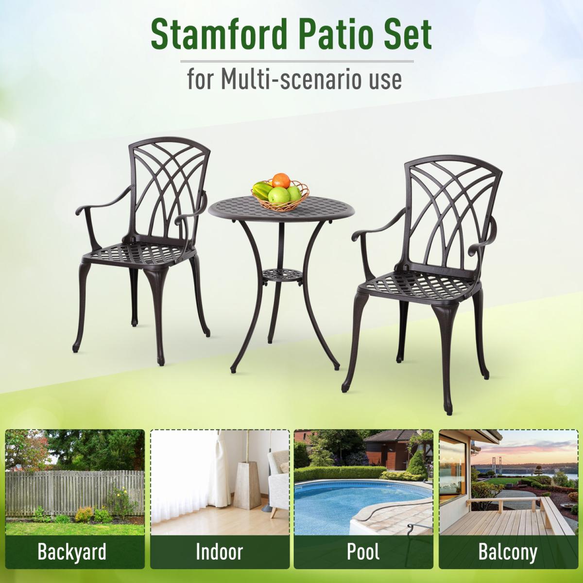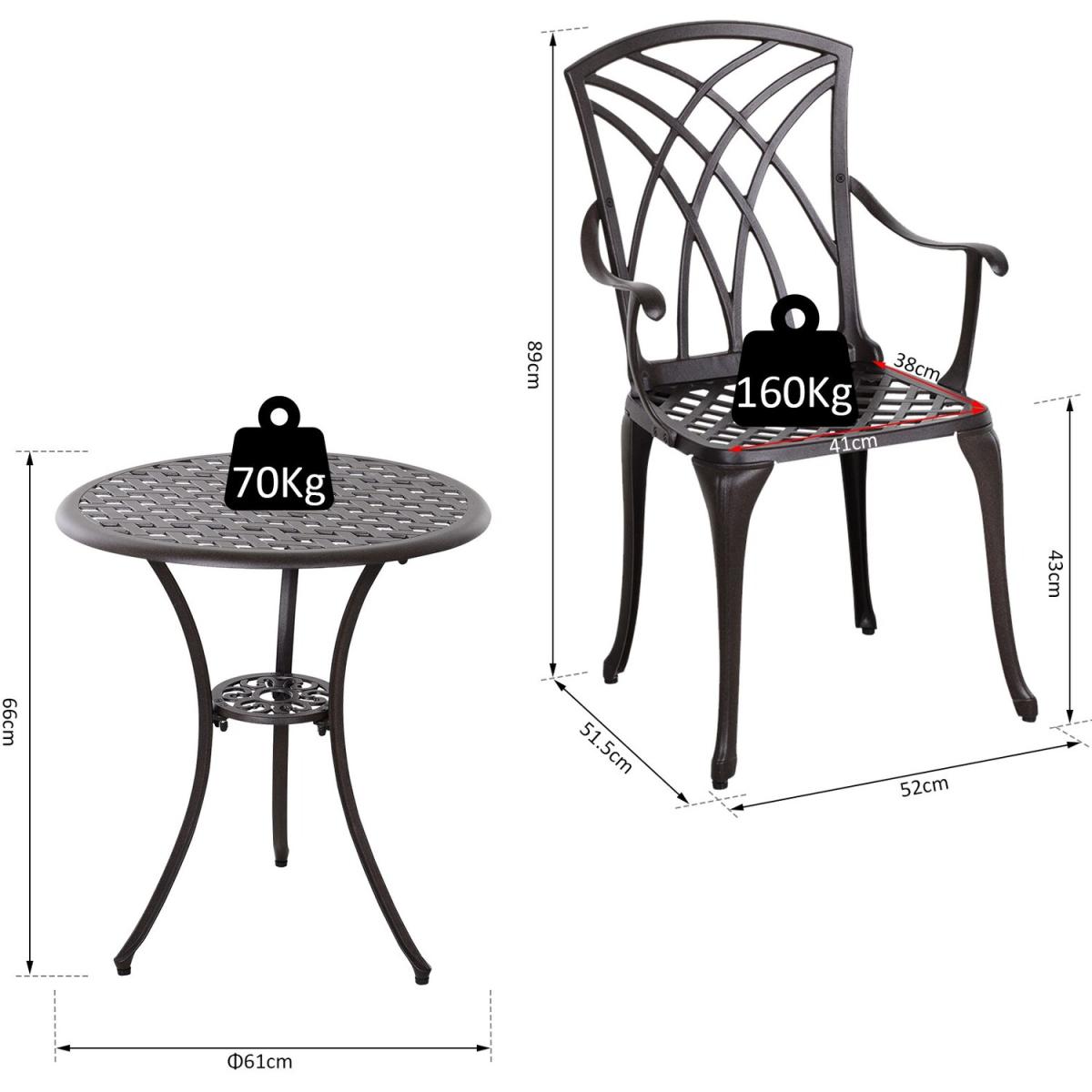 No matter how short you are on space in your home and outdoors, this three-piece Stamford set from Outsunny will give you the perfect spot to dine and relax. It's formed of two bistro chairs and a matching table, with cast aluminium forming the frame of all three pieces to ensure they are sturdy and tough, as well as being resistant to rusting and mild everyday wear-and-tear. Round in shape, the table features a middle hole to keep a sun parasol securely in place, with the back of the chairs showcasing a cut-out design for an attractive finish whether seated or not. Ideal for flats and apartments with balconies.