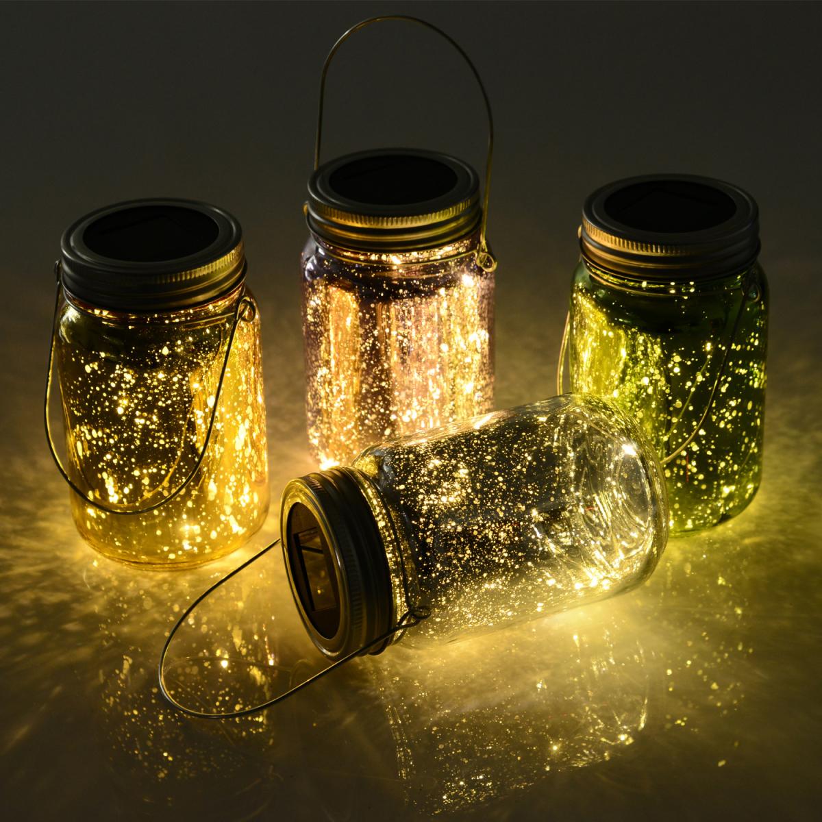 Give your home an extra touch of sparkle with this set of four glass jar lights from Outsunny. In different colours - golden, silver, pink, green, with ten LEDs in every piece, each light uses a classically shaped glass jar, allowing it to be safe to use outdoors all year round. Matte grey in colour to allow the colours to take centre stage, the lid is fitted with a solar panel on the top, meaning each light will charge in the day for it to take effect once the night draws in - saving you money on batteries. Each jar is finished with a swing handle on the top, making it easy to carry up and hang. A simple way to create a beautiful atmosphere in your garden at night. Set of four lights in the following colours: golden, silver, pink, green, with ten LED lights in each jar.