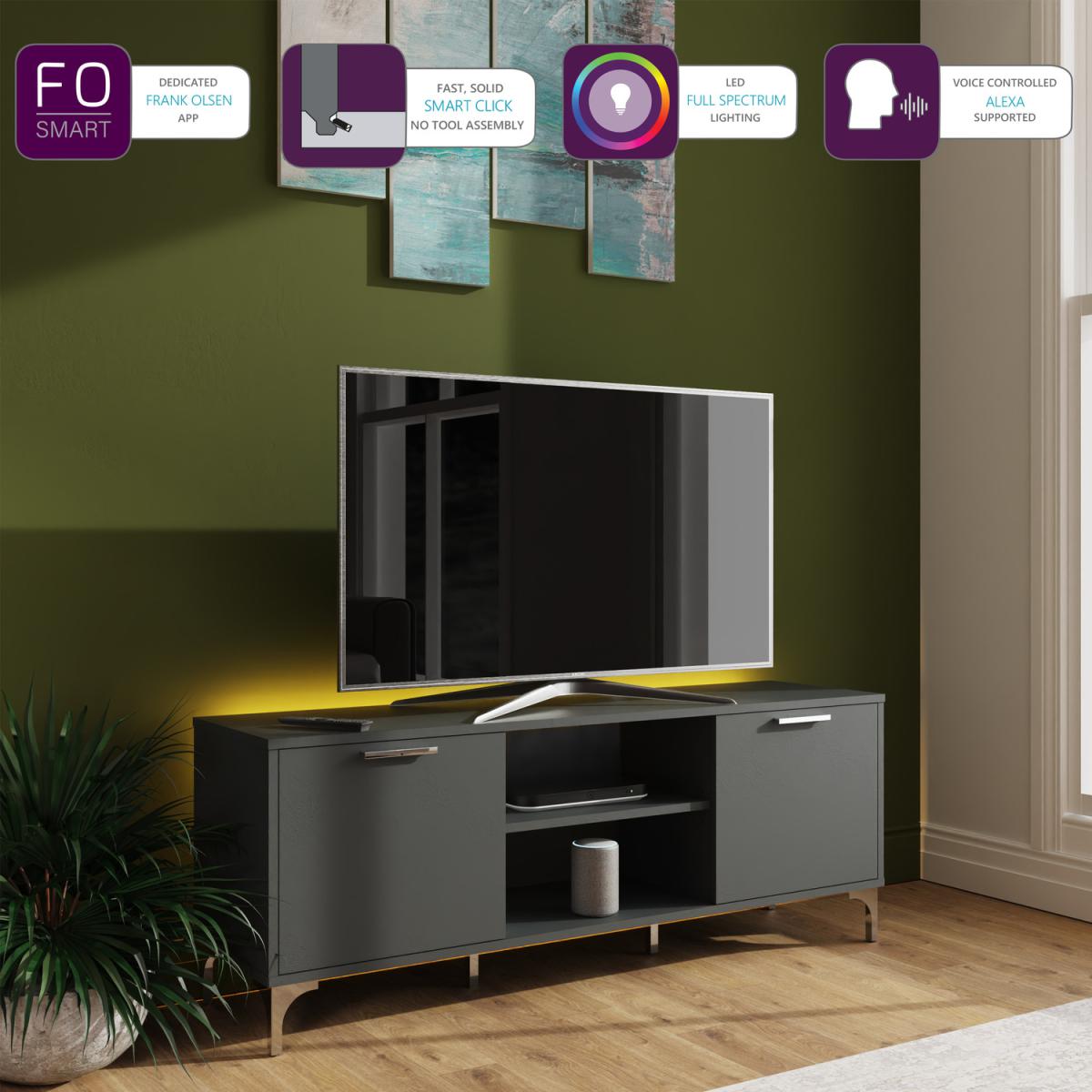 Introducing the LED mood-lit Ouverte TV unit from Frank Olsen Intelligent furniture. This sleek new TV unit is one of the latest designs from the innovative design team at Frank Olsen Furniture, seamlessly integrating app or smart speaker controlled full-colour spectrum LED lighting and contemporary design. Demonstrating that intelligent interior design does not have to cost the earth. The Ouverte TV with a striking satin finish and partially open cabinet design brings a sleek, contemporary style. The TV unit rests on elegant chrome legs to complete the look and give added height.