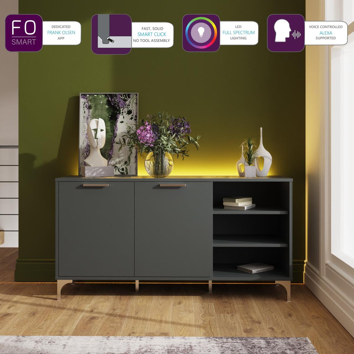 Impress your guests with the touch of your finger or sound of your voice with this Ouverte SMART LED Sideboard. This sideboard can be easily customised thanks to its full colour spectrum LED mood back lighting, operated by the free Frank Olsen app or voice control via a smart speaker. Featuring soft close doors with internal shelving to store away all your bits and bobs as well as open storage, this contemporary table has a satin painted finish with high shine chrome legs that's sure to look great in your home. Please note: deliveries not included are Remote Scotland, Highlands, Ireland, Isle of Man, Channel Islands etc.