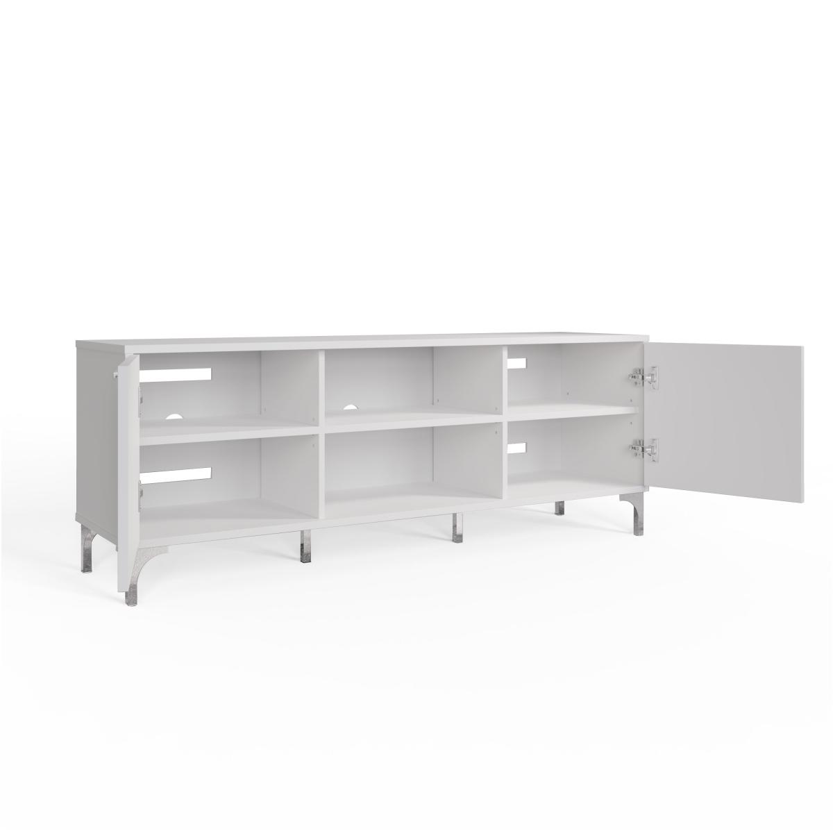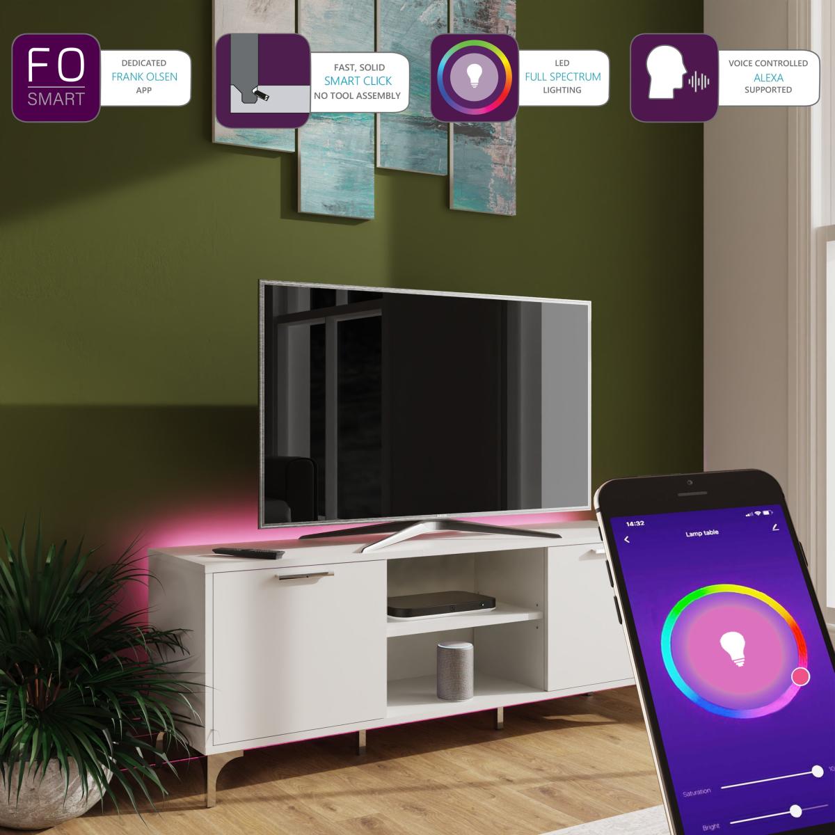 Impress your guests with the touch of your finger or sound of your voice with this Ouverte SMART LED TV unit. This TV unit features a full colour spectrum LED mood back lighting that can be operated by the free Frank Olsen app or voice control via a smart speaker, so you can really show off to your guests. Featuring soft close doors with internal shelving to store away all your bits and bobs, this contemporary table has a satin painted finish with high shine chrome legs. Please note: deliveries not included are Remote Scotland, Highlands, Ireland, Isle of Man, Channel Islands etc.