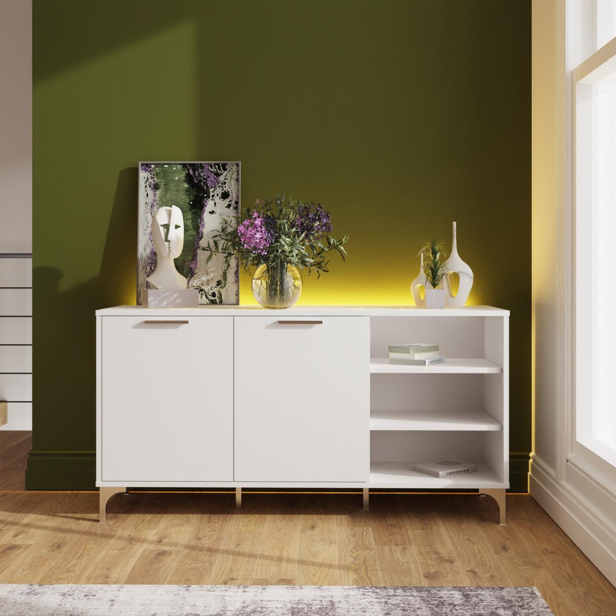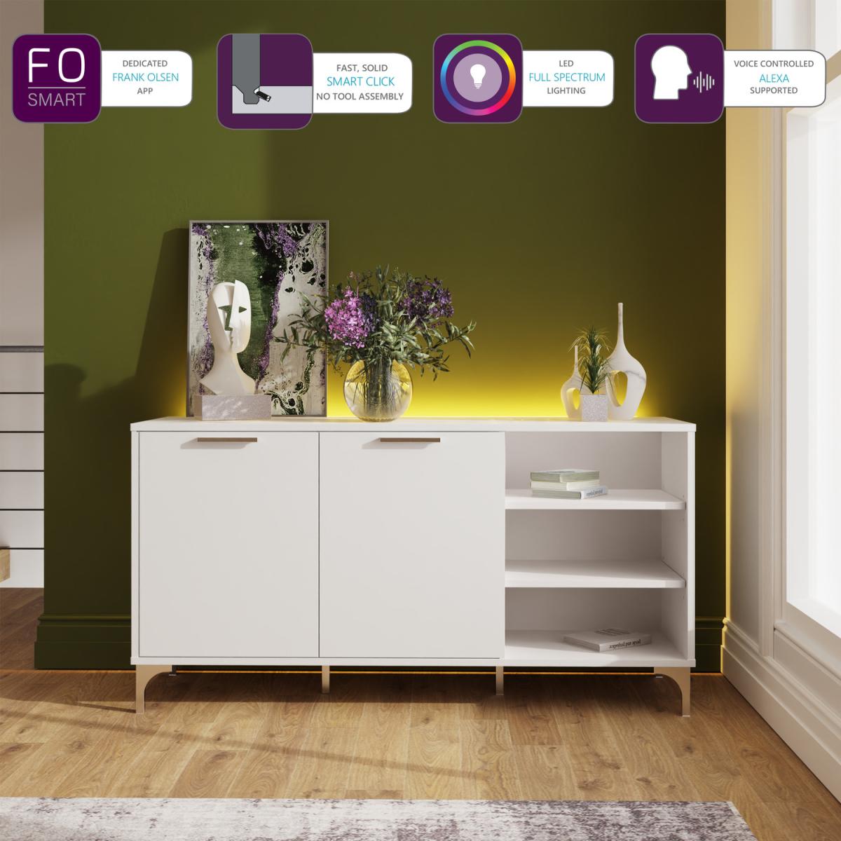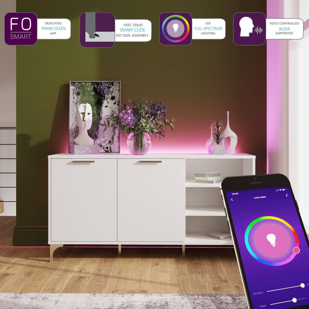 Introducing the LED mood-lit Ouverte sideboard from Frank Olsen Intelligent furniture. This sleek new sideboard is one of the latest designs from the innovative design team at Frank Olsen Furniture, seamlessly integrating app or smart speaker controlled full-colour spectrum LED lighting and contemporary design. Demonstrating that intelligent interior design does not have to cost the earth. The Ouverte sideboard with a striking satin finish and partially open cabinet design brings a sleek, contemporary style. The sideboard rests on elegant chrome legs to complete the look and give added height.