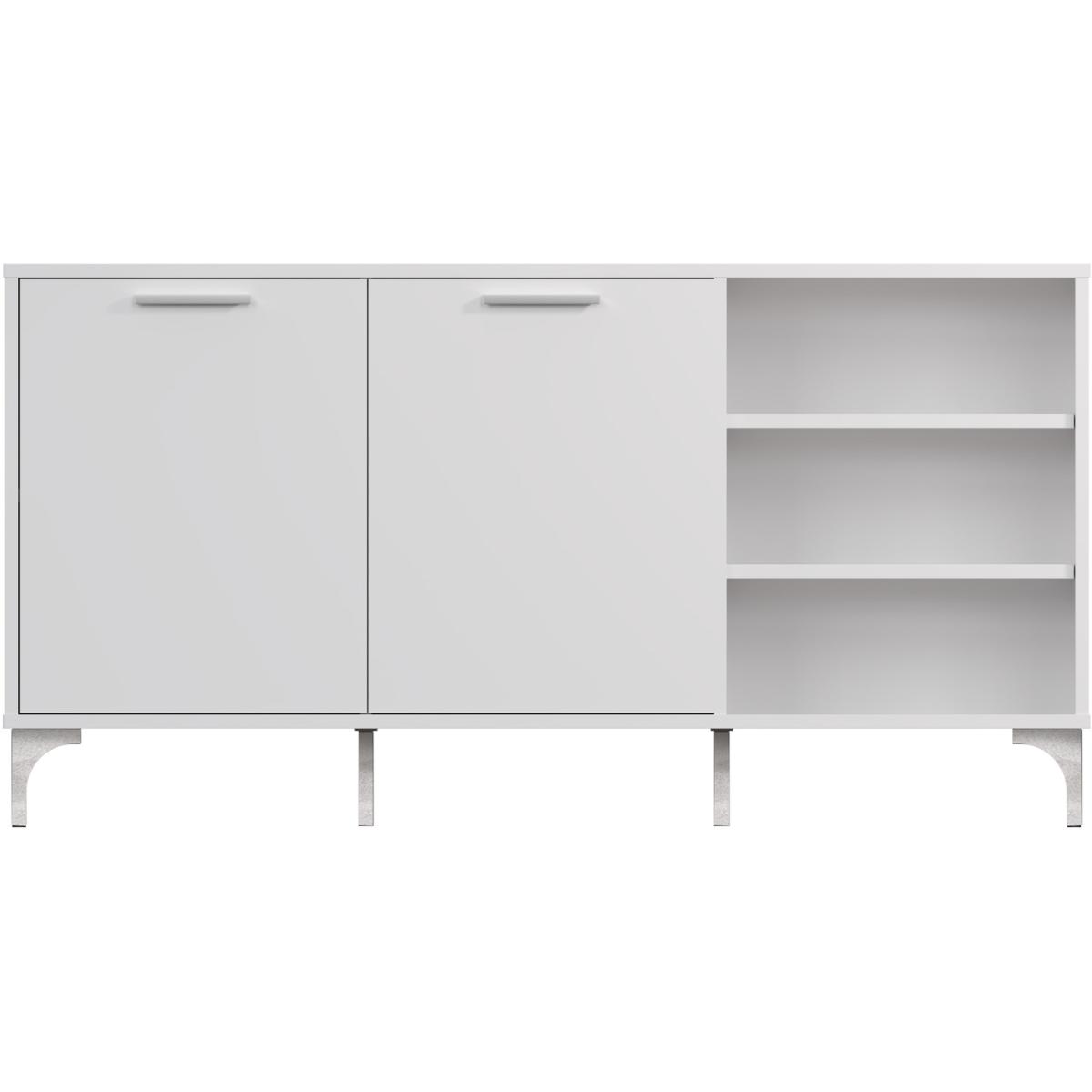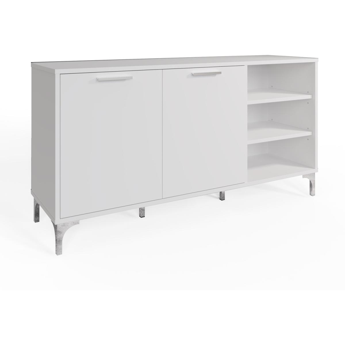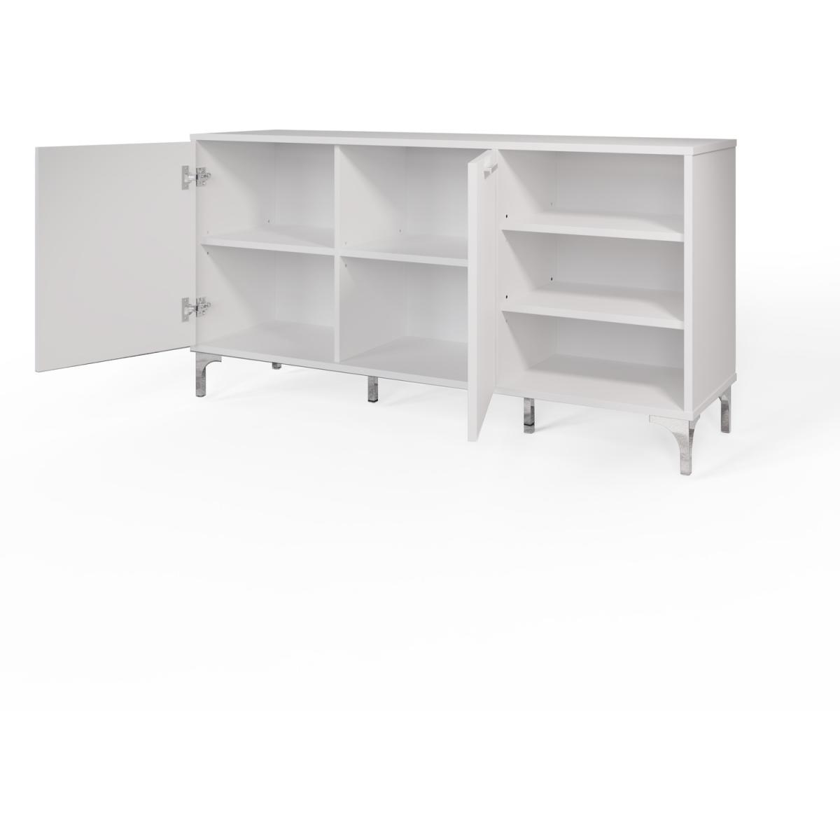 Introducing the LED mood-lit Ouverte sideboard from Frank Olsen Intelligent furniture. This sleek new sideboard is one of the latest designs from the innovative design team at Frank Olsen Furniture, seamlessly integrating app or smart speaker controlled full-colour spectrum LED lighting and contemporary design. Demonstrating that intelligent interior design does not have to cost the earth. The Ouverte sideboard with a striking satin finish and partially open cabinet design brings a sleek, contemporary style. The sideboard rests on elegant chrome legs to complete the look and give added height.