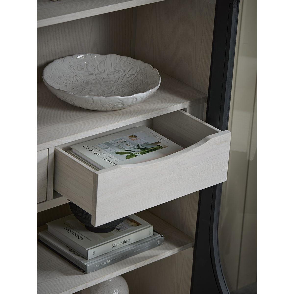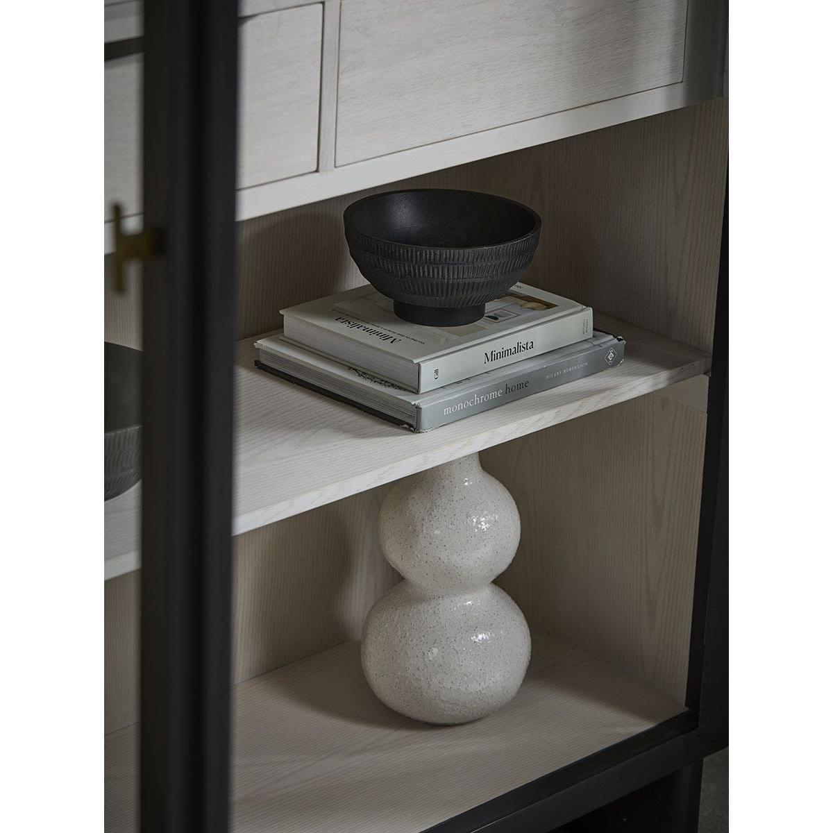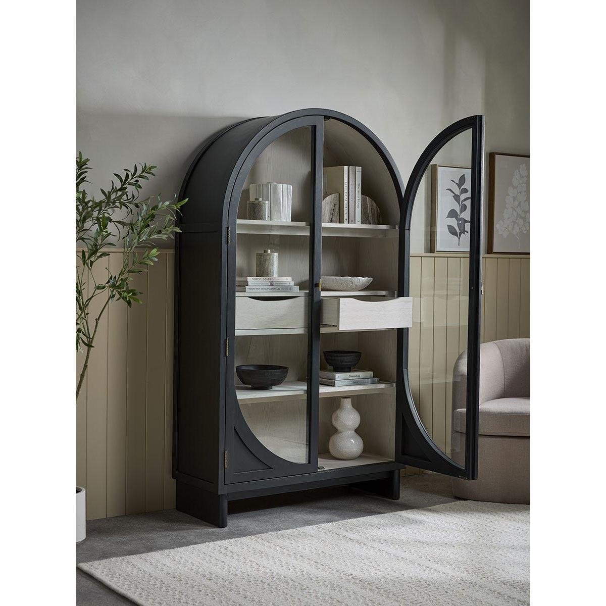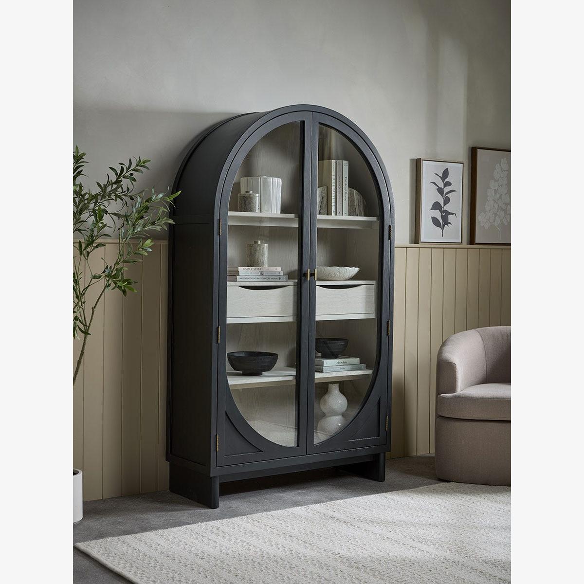 A beautiful blend of striking contemporary tones and a soft, curved frame, our Oval Display Cabinet houses decorative ornaments perfectly. Glass-pannelled doors allow accessories to be kept safe while also looking lovely on display. A drawer sits in the middle of the shelf to keep little bits and bobs all in one place, and your home looking tidy.