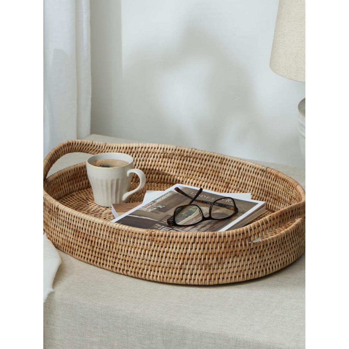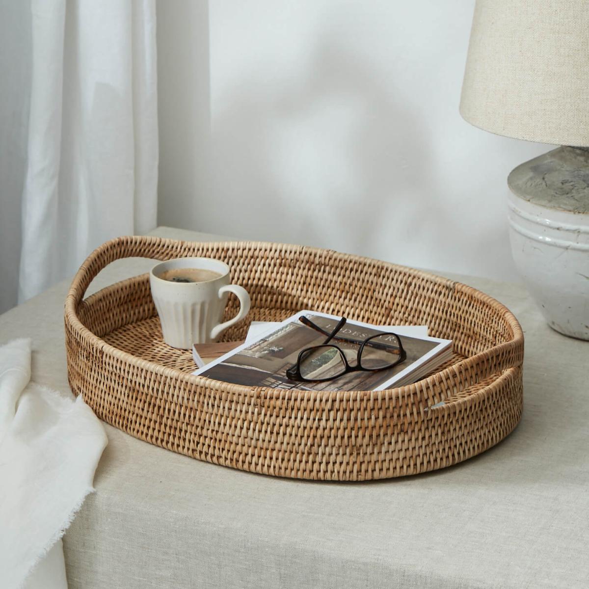 In our new favourite natural tone, this oval rattan tray is a substantial tray with deep sides. Which means you can use it to gather together larger styling pieces on your shelf or coffee table or take your breakfast to bed!