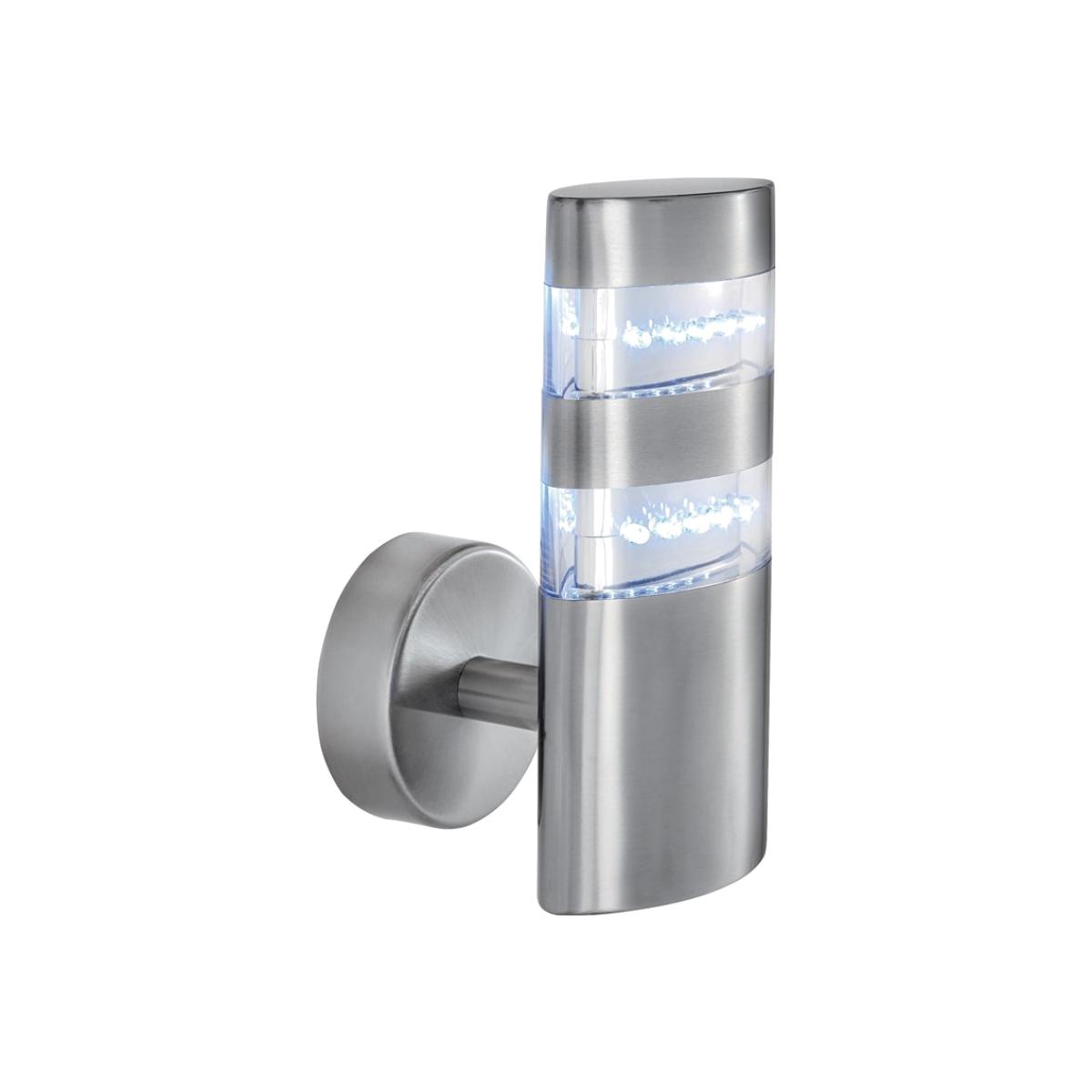 Dimensions H20cm x W10cm x D10cm. This India LED outdoor light uses the latest LED technology to light your outdoor walls and areas to stunning effect. The sleek satin silver fitting has rounded edges and a circular wall attachment as well as 24 energy saving LED's across two stylish strips of light. It provides an attractive and practical source of light and is IP44 rated and fully splashproof to protect against the elements. LED's use up to 75% less energy and last up to 20 times longer than incandescent bulbs. Features. Modern outdoor wall lamp Stylish and sleek designLE. D lightIP4. 4 rating. Perfect piece to freshen up your porch or outdoor area Assembly required..