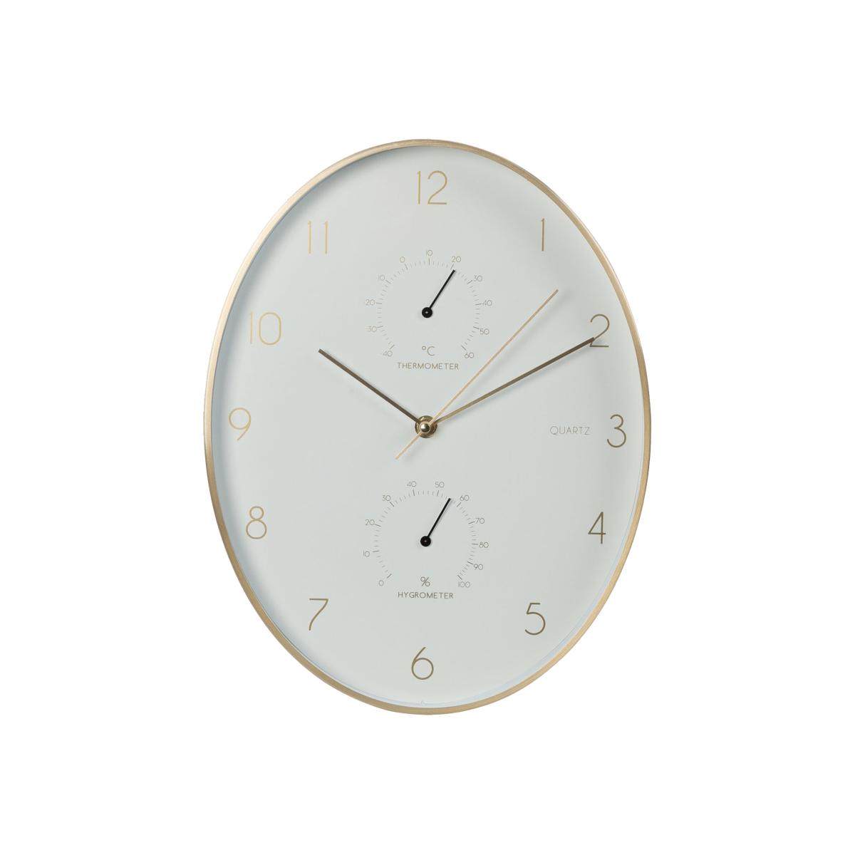 Elevate your space with our Oval Gold Rim Wall Clock, a stunning combination of style and functionality, including a thermometer and hygrometer. Featuring a sleek white dial with a sophisticated golden rim, this clock adds a touch of luxury to any room. Crafted with high quality aluminium alloy, it is both durable and lightweight. The clock's refined design is complemented by golden hands and numbers, ensuring both elegance and readability. Along with the time, monitor the temperature and humidity levels while enjoying the stylish aesthetic.