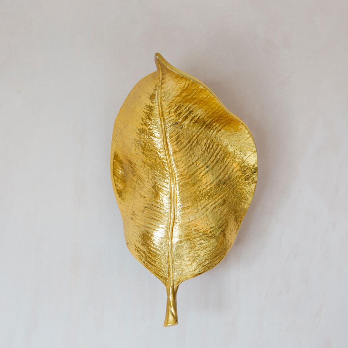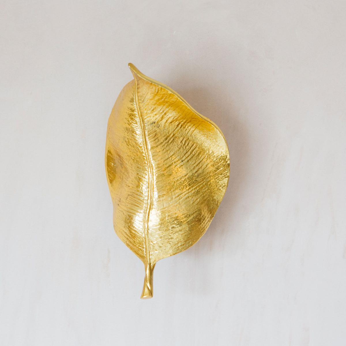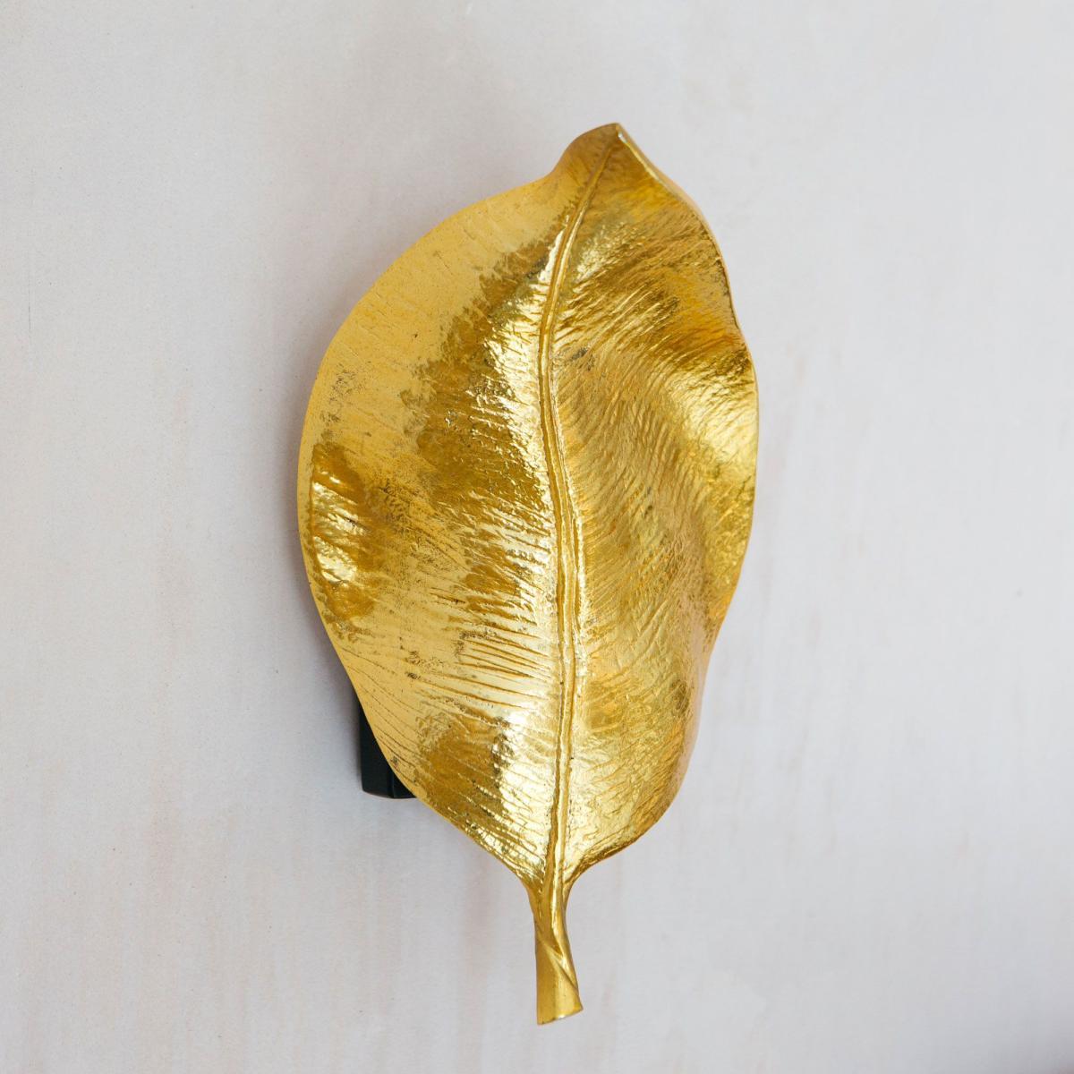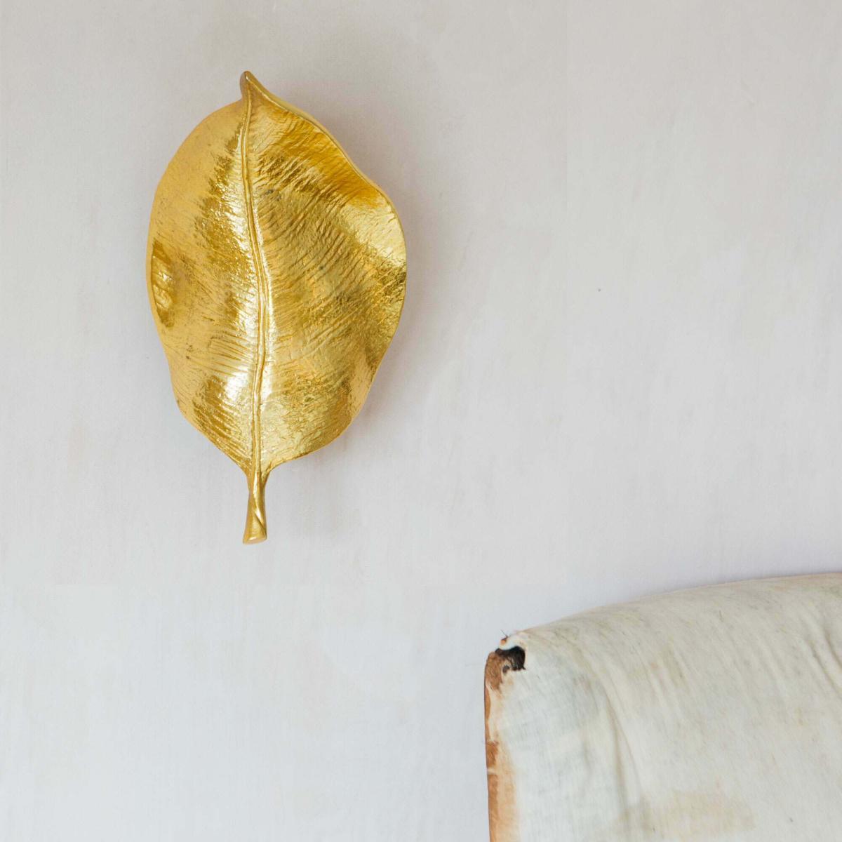Handcrafted from aluminium and brass with an opulent gold finish, this unique leaf-shaped wall light is inspired by the beauty of nature.