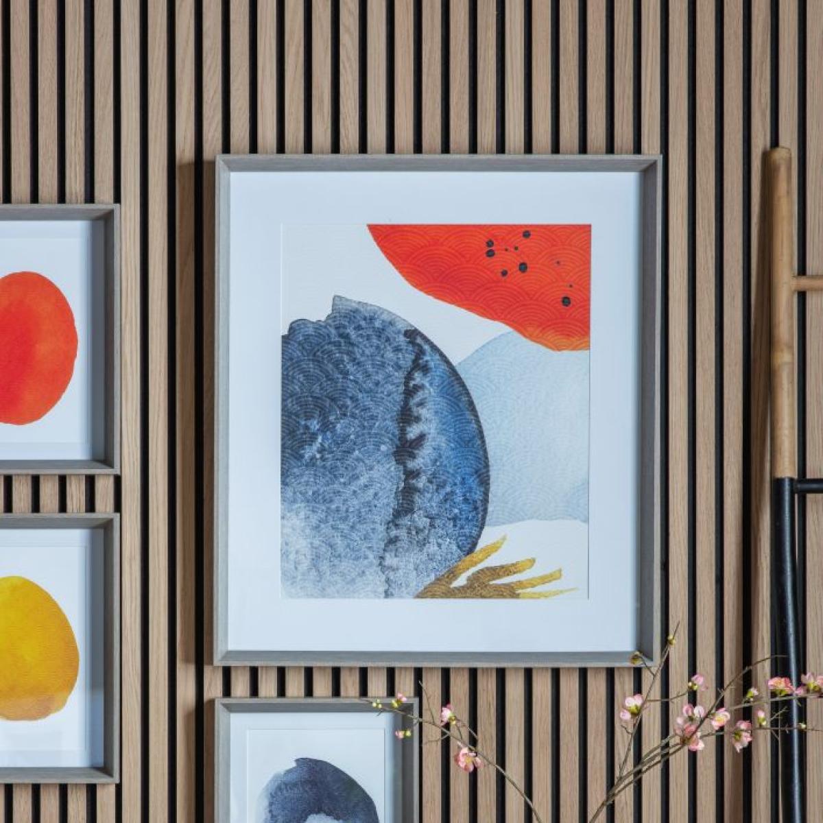With a primary colour palette, this abstract framed art brings a touch of Japandi style. It is finished in a simple wood effect frame with simplistic white mount to complete the look. Orientation: Portrait. Fixing Type: Sawtooth. Framed:Yes. Colour: Blue.
