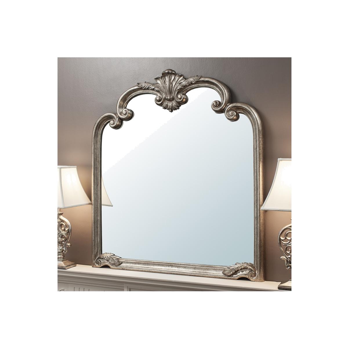 Dimensions W104cm x H115.5cm. Stately shaped over mantel mirror in a lightly aged silver leafed finish. Elegant ornate frame. Silver finish. Best situated in a living room bedroomhallway or bathroom. Stunning classic design..