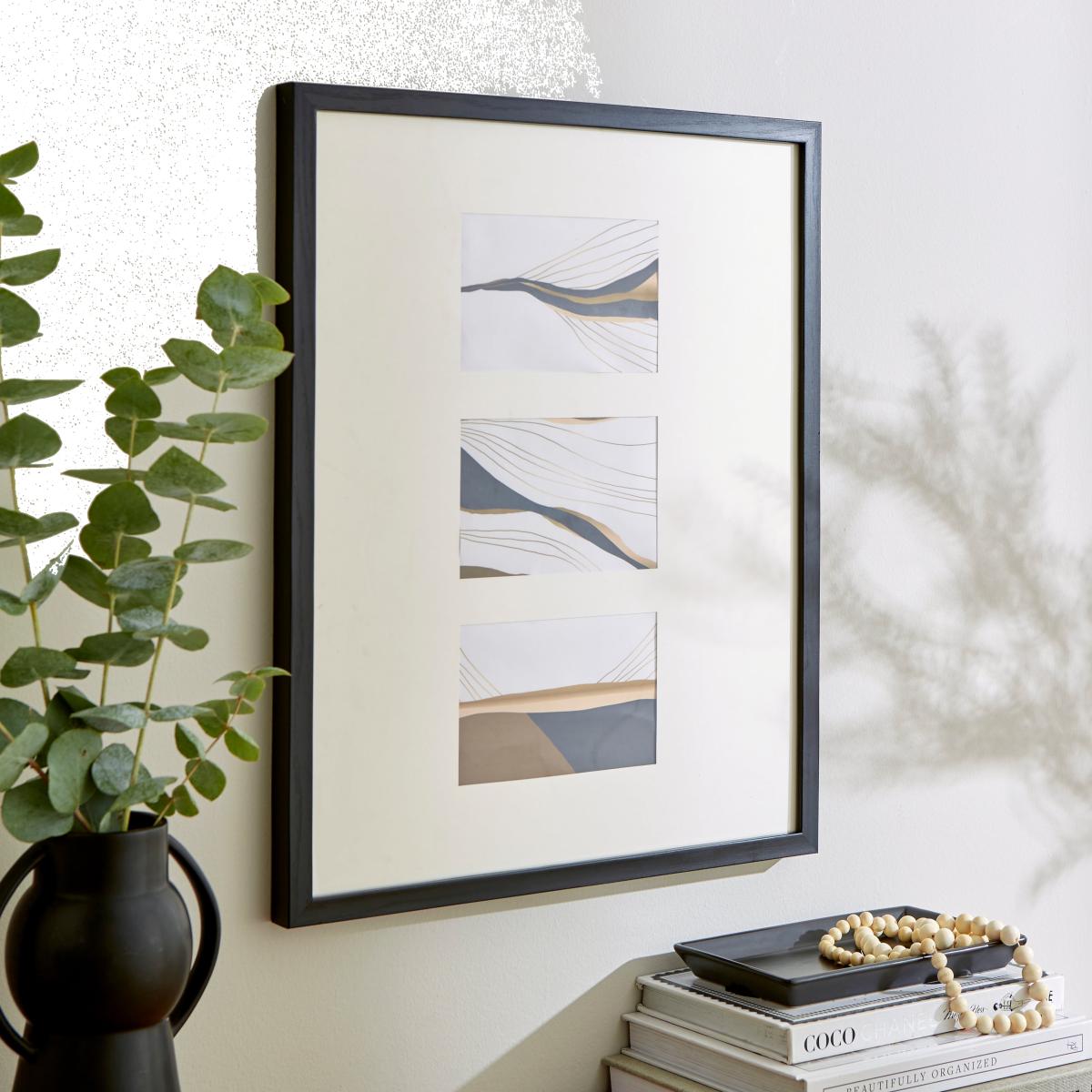 I really like this oversized black mount triple photo frame for its bold, modern look that adds impact without overwhelming a space. It works particularly well in contemporary or minimalist interiors, where clean lines and statement pieces are key. I’d suggest pairing it with monochrome or neutral tones to let the artwork or photos it frames stand out. Practical styling tips include placing it above a console table or sofa to create a focal point, and mixing it with smaller frames or artwork for a layered effect. Its sizeable presence makes it perfect for creating a striking gallery wall, or as a standalone feature in a larger wall area.