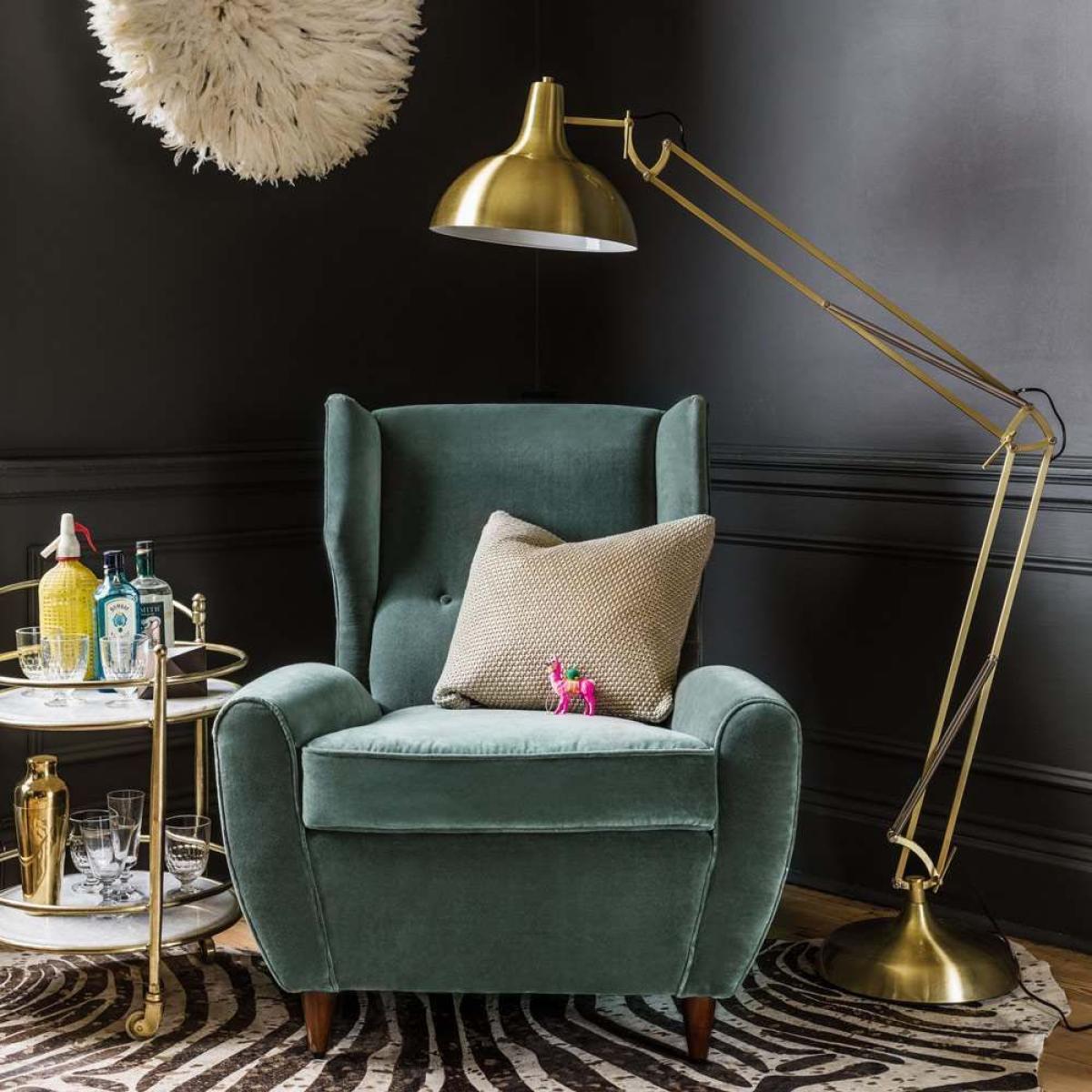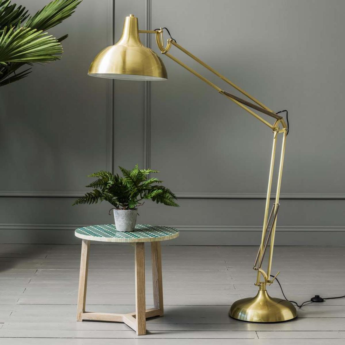 Our oversized brass angle floor lamp has a classic angular shape and a metallic brass finish. With a gold shimmer, this lamp is a subtle statement piece. Angle over your favourite living room reading seat or home office desk for some stylish illumination.