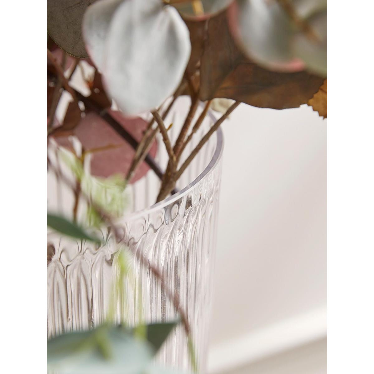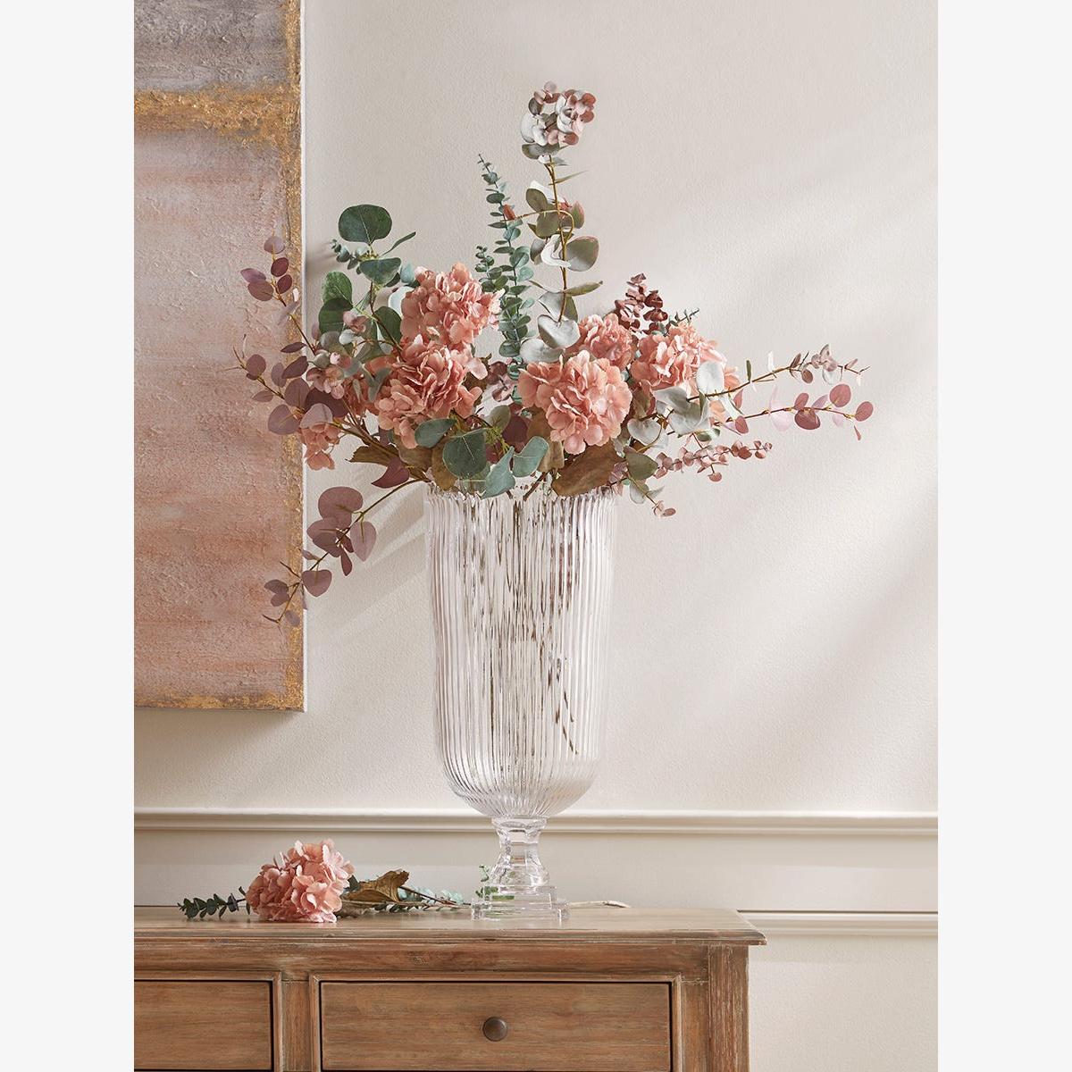 I love this piece because of its bold, oversized shape that instantly elevates an interior. The fluted glass adds subtle texture without overwhelming, making it versatile for both classic and contemporary spaces. It works well as a standalone statement on a sideboard or table, or styled with fresh or dried flowers for added visual interest. For practical styling, consider pairing it with sleek narrow greenery or minimalist blooms to highlight its shape, or go more dramatic with large, sculptural floral arrangements for impact. Its transparency also makes it ideal for use in open-plan areas, as it enhances the sense of space and light.