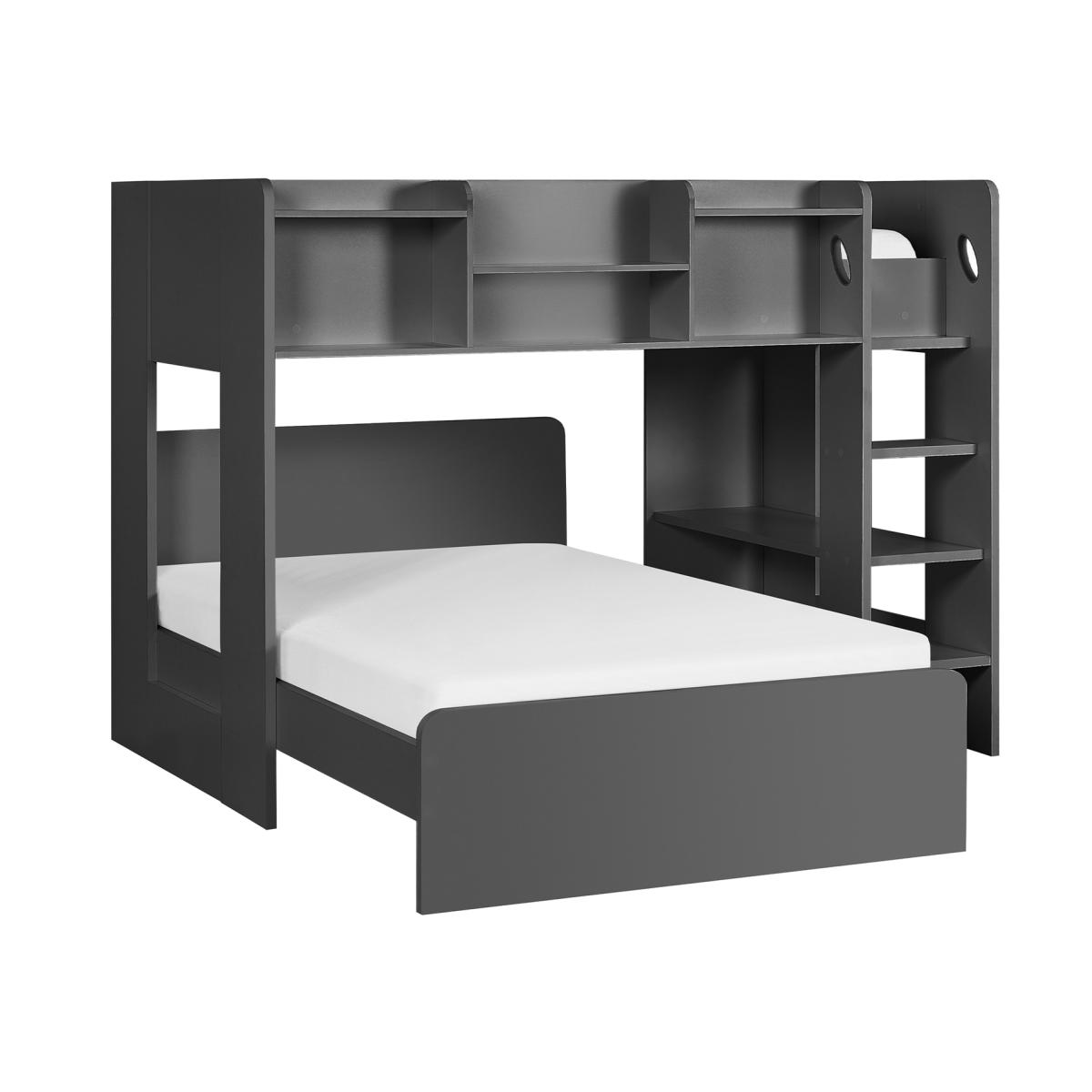 Experience the perfect blend of style, functionality, and fun with the Owen Bunk Bed in Anthracite. This versatile piece features a cosy single bed perched above a removable small double underbed, offering flexibility for sleepovers or extra lounging space. The built-in shelving, both inside and on the front, provides ample room to showcase decorative items, books, and toys, keeping your child's room organised and vibrant. The study ladder ensures easy access to the top bunk while adding a touch of modern design. Transform any room into a stylish haven of creativity and comfort. Mattress sold separately.