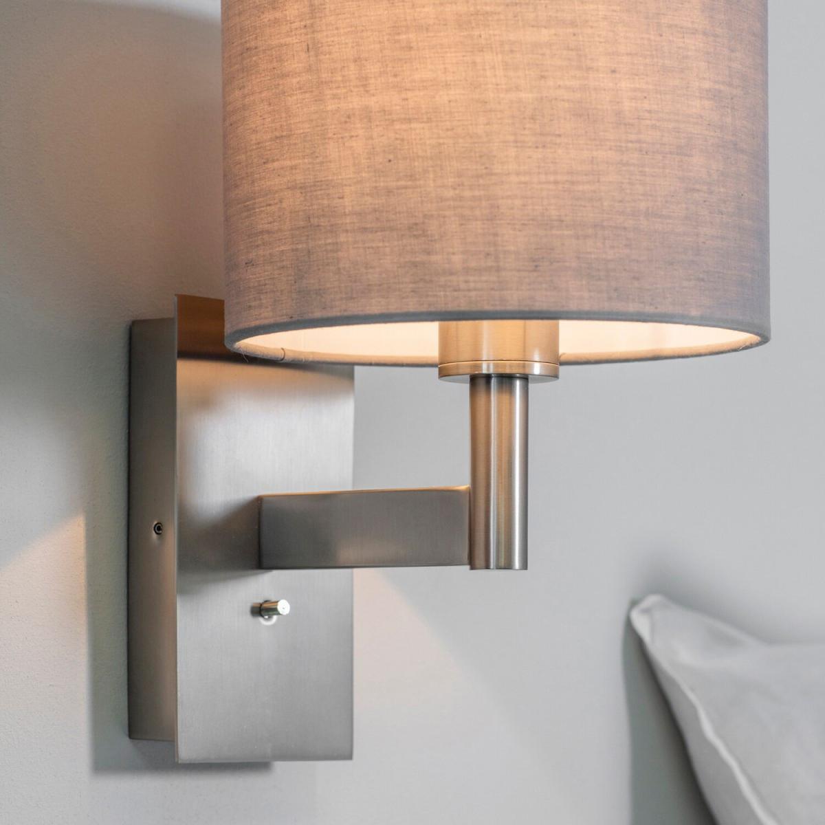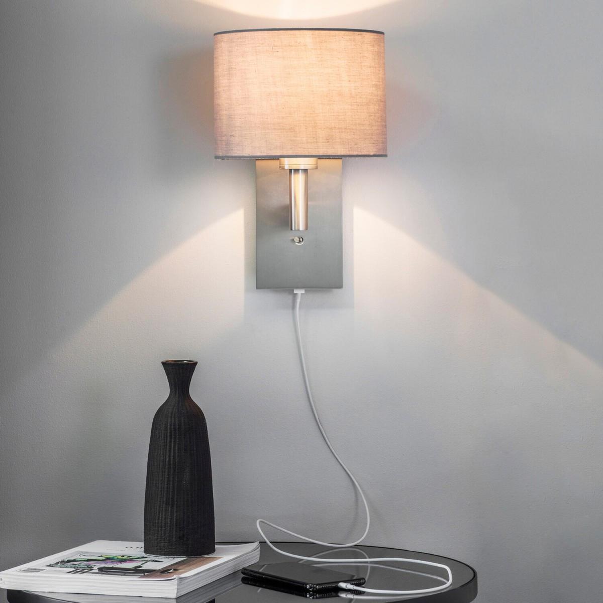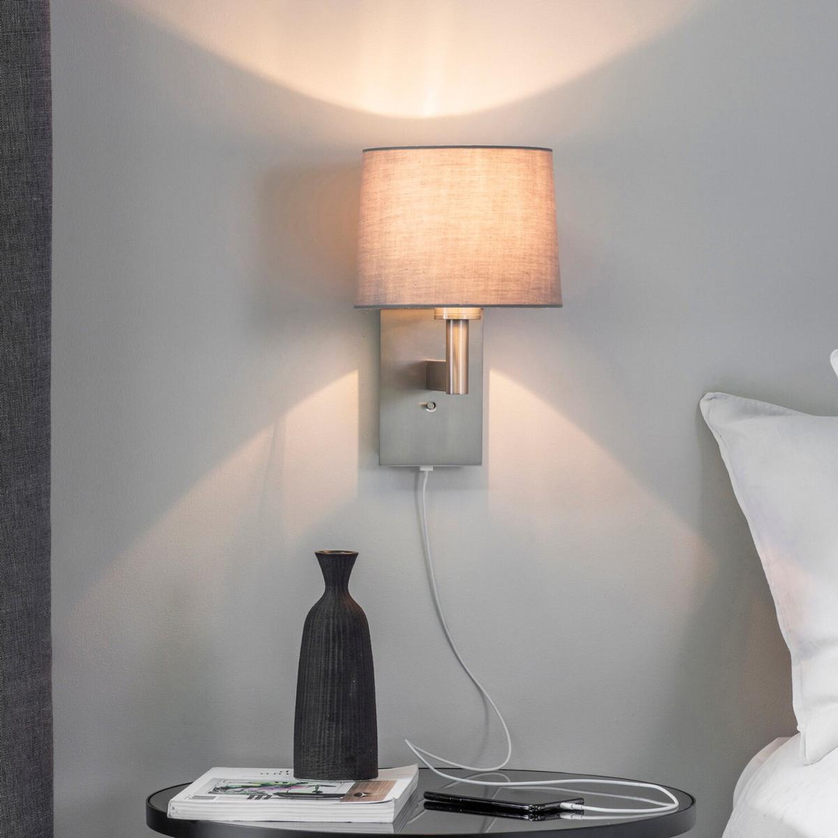 This wall light is a timeless, modern, clean line design. The perfect addition to boutique style bedrooms, finished in smart matt nickel plating. Featuring an easily accessible onoff switch and integrated USB socket for versatile mobile device charging by your bedside or wherever you need it. Supplied excluding shade for you to tailor the design to your requirements, options are cylinder, ellipse, rectangular and tapered shapes finished in vintage white, taupe or cool grey cotton fabric.