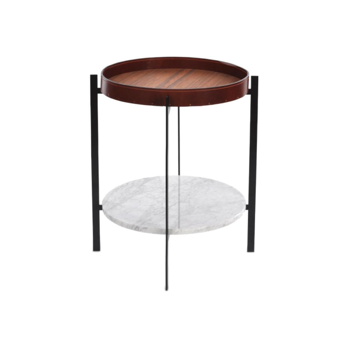 OX Denmarq Deck tray table teak. black stand. white marbleshelf