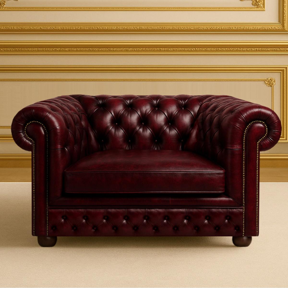 The Chesterfield 1 Seater Sofa in Natural Grain Leather embodies British craftsmanship and timeless style. Handcrafted in the UK, it features full-grain leather with natural variations for a unique finish. Classic deep button-tufting, scroll arms, and hand-applied studs highlight its traditional elegance. A 6" foam cushion ensures lasting comfort, while the solid hardwood frame and turned bun legs provide enduring stability. Over time, the leather softens, revealing a rich, vintage patina. An icon of comfort and sophistication, the Chesterfield 1-Seater is more than a chair its a piece of British design heritage. Complete with a 1-year manufacturers warranty. Dimensions, 30" Height, 38" Width, 38" Depth. Available in Blue, Tan, Red, Brown, and Green.