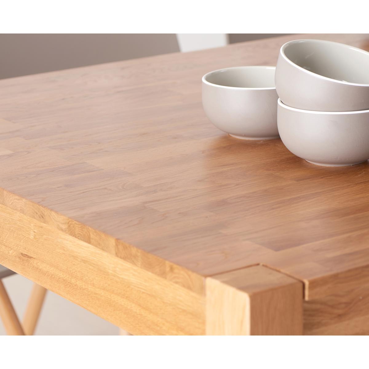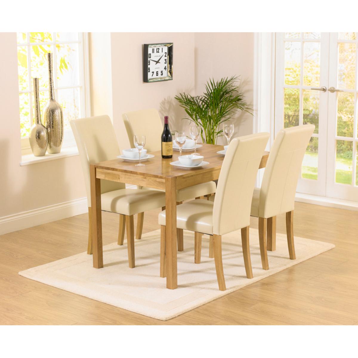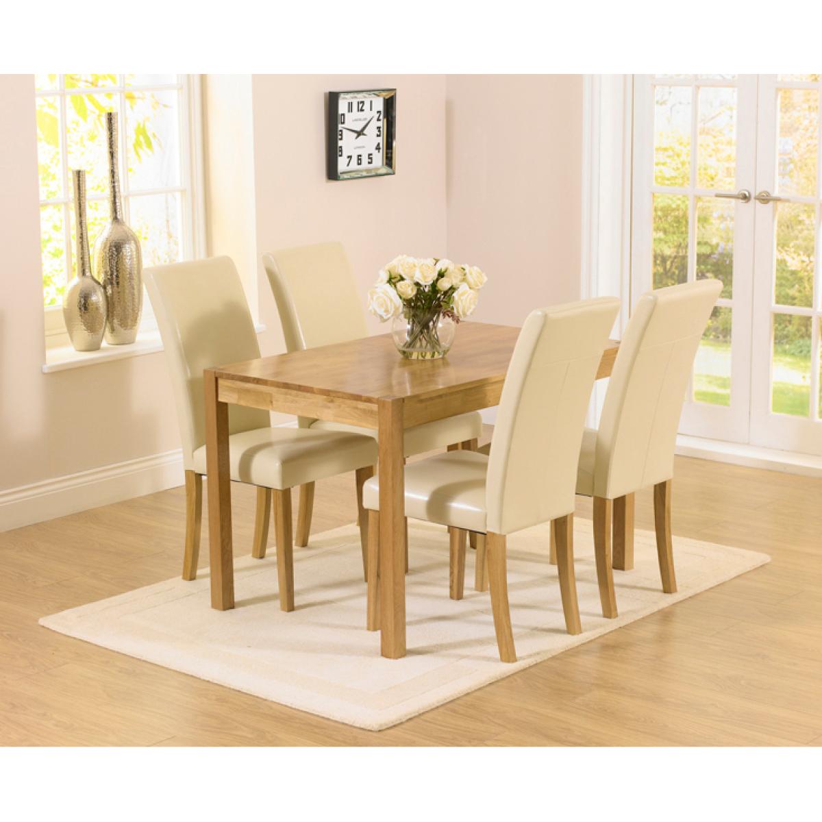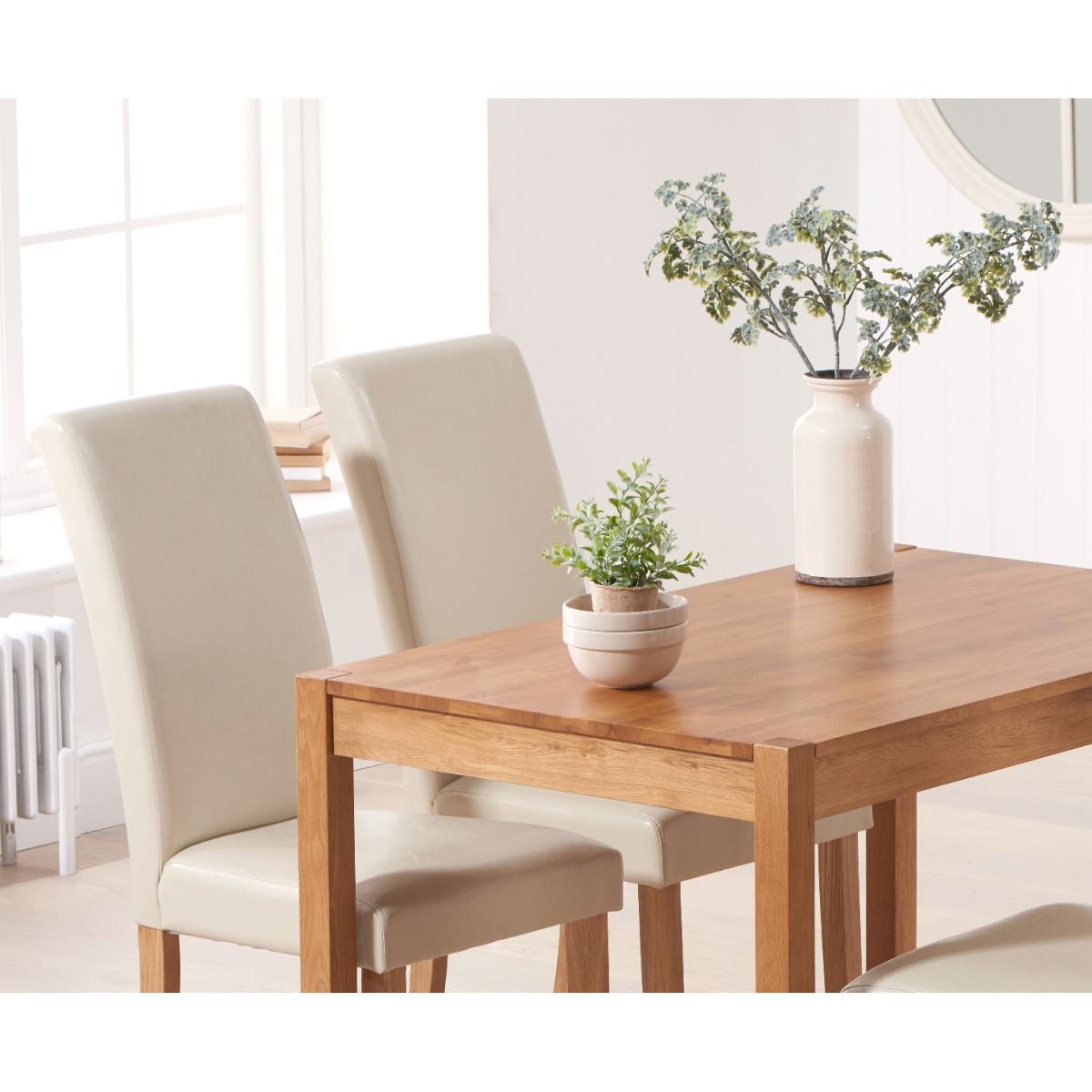 A beautiful combination of timeless elegance and contemporary design, the Oxford 120cm Solid Oak Dining Table comfortably seats up to 6 people, making it perfect for everyday dining and special occasions alike. Carefully crafted from solid oak, the Oxford Table features a beautifully smooth table top with a subtle, modern finger jointed design and elegant yet sturdy legs that support the table without taking away from its graceful character. The Oxford Table is complete with a clear protective lacquered finish that protects the wood and allows the true beauty and depth of the oak to shine through. Upholstered in cream faux leather the Albany Chairs complement the Oxford Dining Table beautifully and provide faultless support thanks to their solid oak legs. Further Items in the Collection: Oxford 80cm Solid Oak Dining Table, Oxford 150m Solid Oak Dining Table and Oxford 70cm Solid Oak Extending Dining Table.