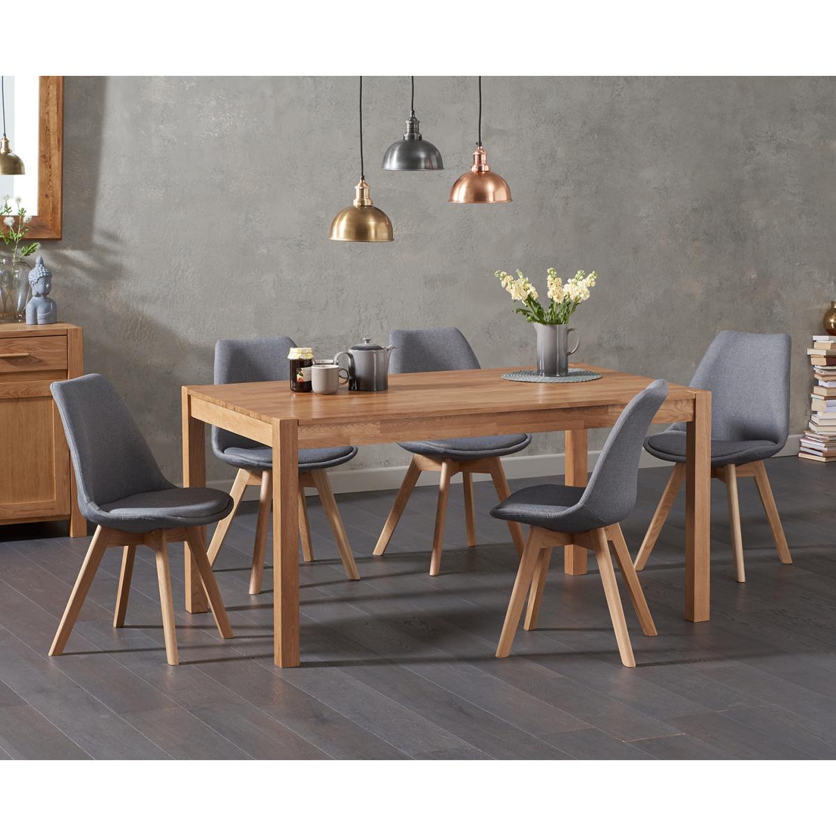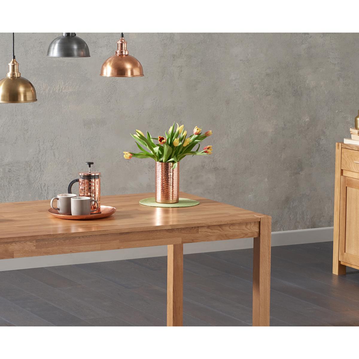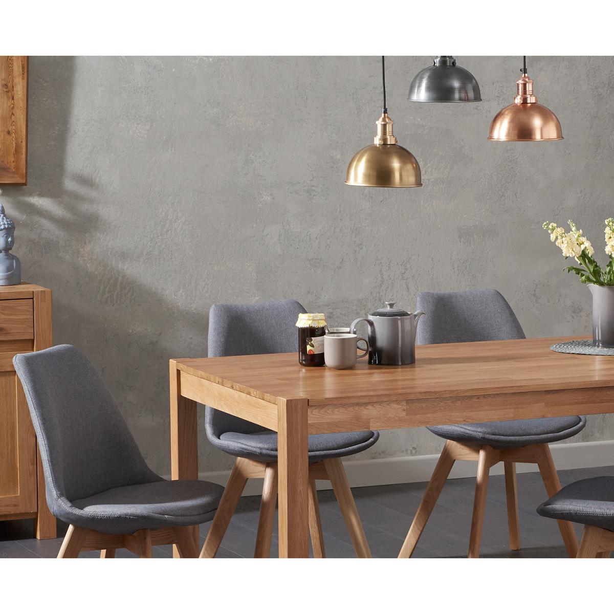 Stylish and sophisticated, the Oxford 150cm Solid Oak Dining Table with Duke Fabric Chairs combines traditional materials with contemporary design to stunning effect. This oak dining set with fabric dining chairs seats up to 8 people. Crafted from solid oak with a subtle finger-jointed design, the Oxford 150cm has been designed in a streamlined and timeless design that means it works well with existing décor and colour schemes. A clear lacquer finish accentuates the natural grain of the wood while protecting it from scuffs and scratches. Our Duke Fabric Chairs add modern Scandi-inspired style to this set thanks to their sleek, contemporary look. They comprise comfortably curved seats supported by angled hardwood legs, and are available in cream, light grey and dark grey.