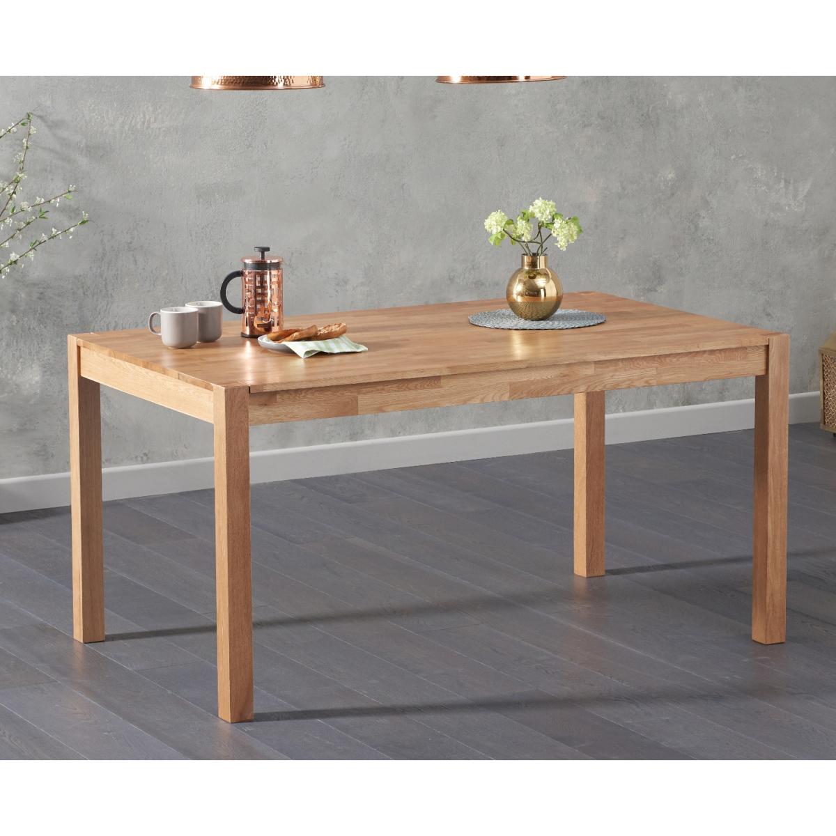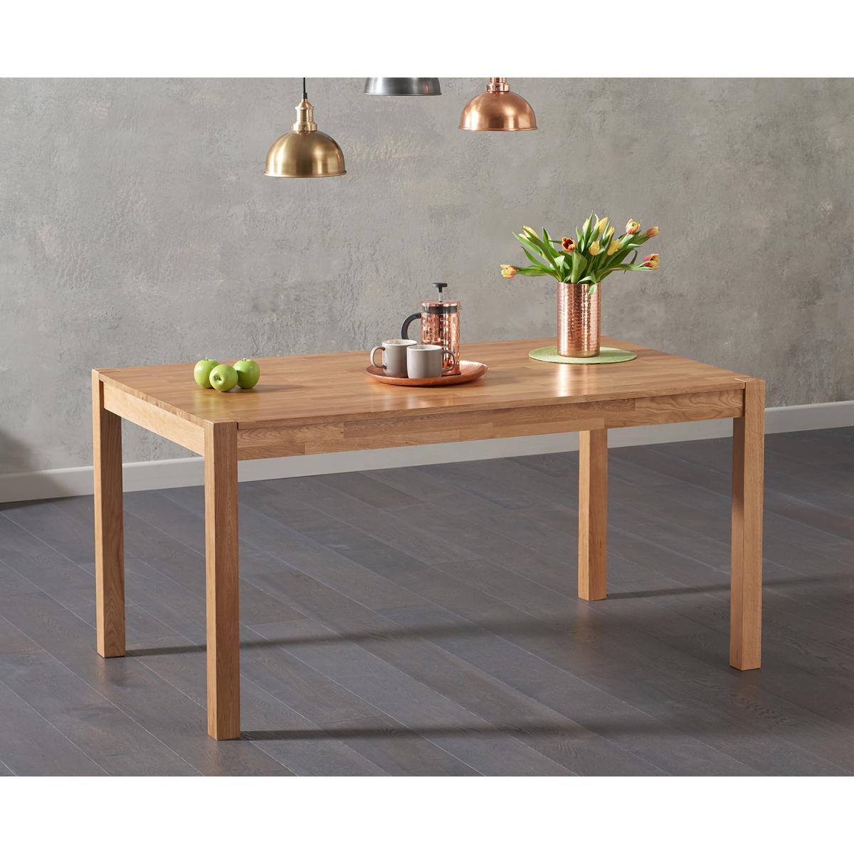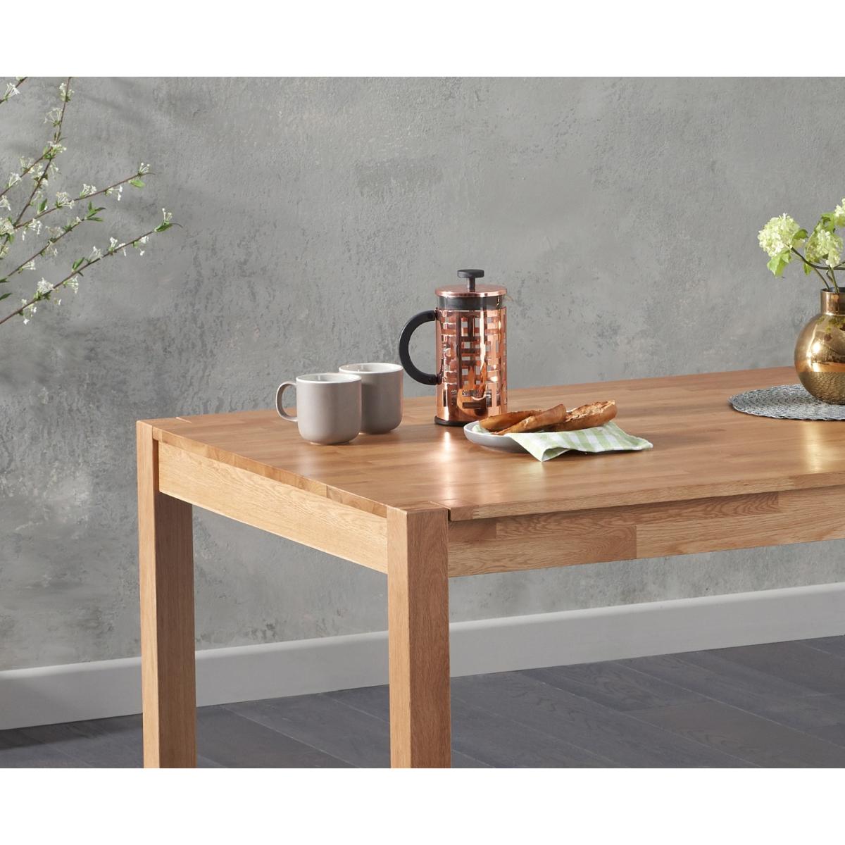 Stylish and sophisticated, the Oxford 150cm Solid Oak Dining Table with Duke Fabric Chairs combines traditional materials with contemporary design to stunning effect. This oak dining set with fabric dining chairs seats up to 8 people. Crafted from solid oak with a subtle finger-jointed design, the Oxford 150cm has been designed in a streamlined and timeless design that means it works well with existing décor and colour schemes. A clear lacquer finish accentuates the natural grain of the wood while protecting it from scuffs and scratches. Our Duke Fabric Chairs add modern Scandi-inspired style to this set thanks to their sleek, contemporary look. They comprise comfortably curved seats supported by angled hardwood legs, and are available in cream, light grey and dark grey.