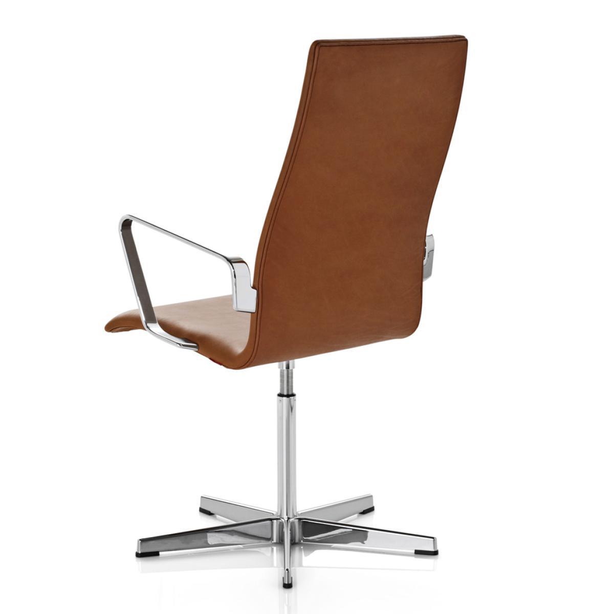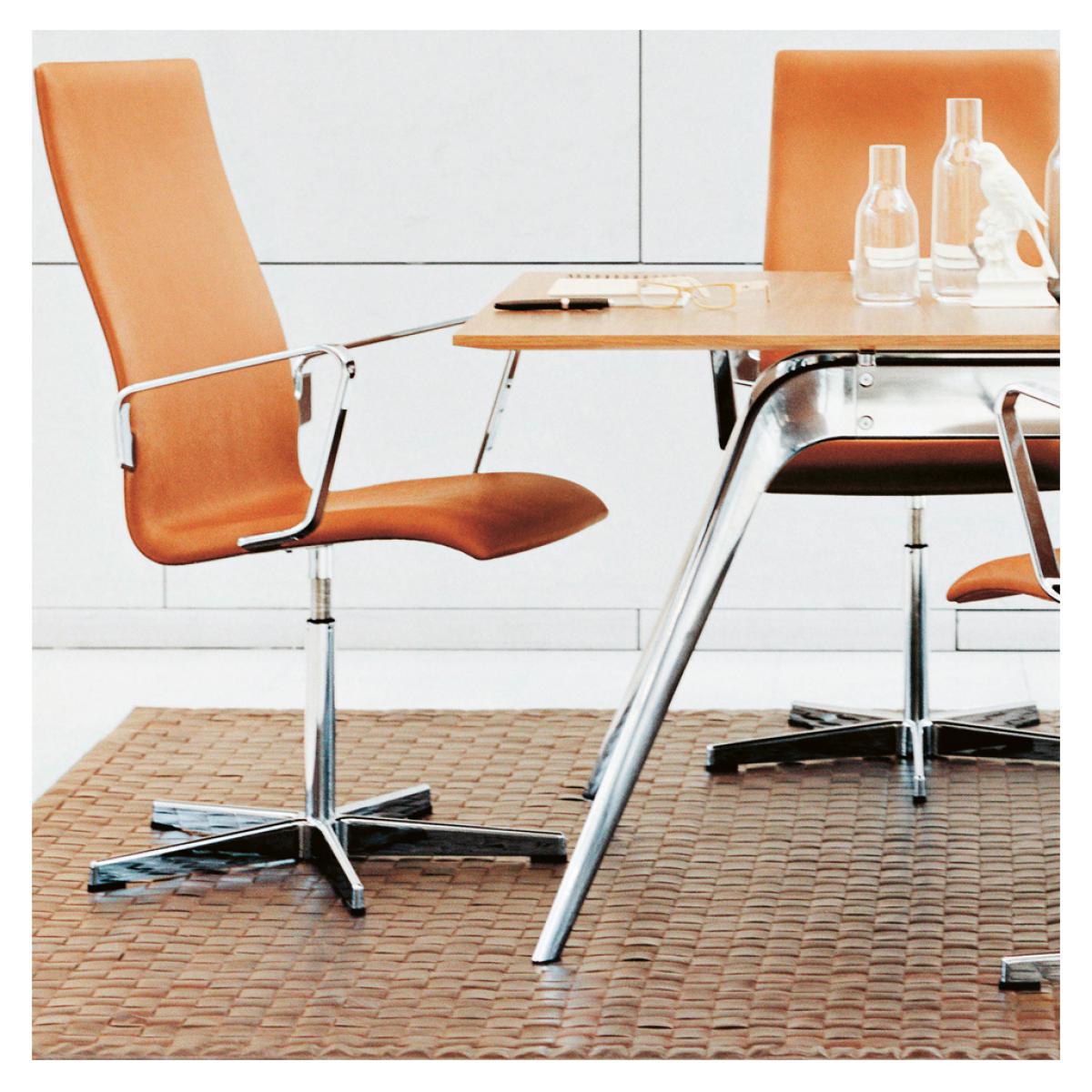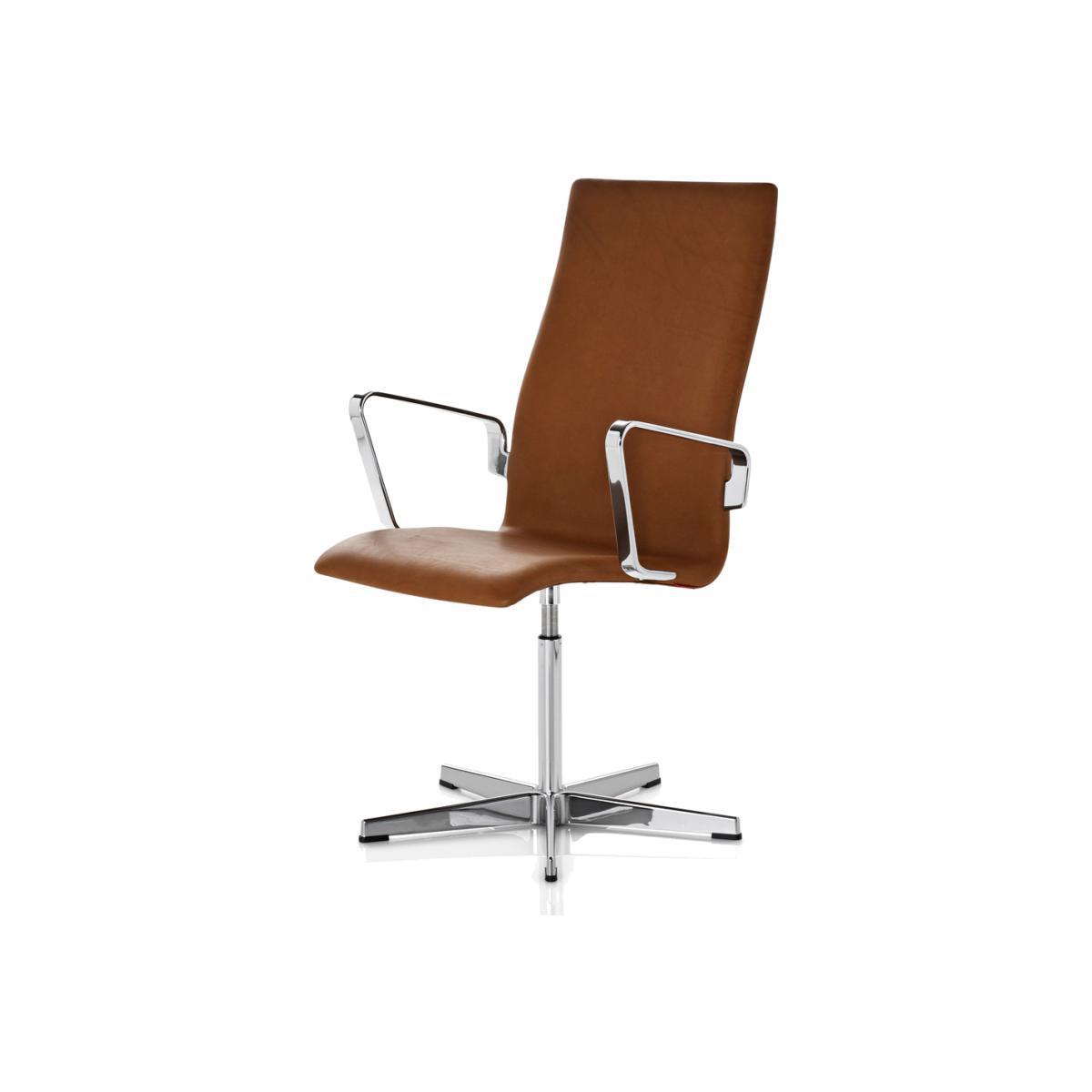 Originally designed for the professors at St. Catherine's College, Oxford, the eponymous Oxford Chair was created by Arne Jacobsen and boasts a high back and intuitive armrests, all upholstered in finest Grace Leather. Crafted to exacting standards by Fritz Hansen, the Oxford Chair instantly commands presence in a room, with a shell crafted from laminated veneer and upholstered in Grace Leather. Meanwhile the Oxford Chair features a tilting, height-adjustable, satin-polished aluminium base that offers freedom of movement and superior comfort. This edition of the Oxford Chair is upholstered in Sorensen's beautifully soft and smooth Grace Leather, a firm yet flexible aniline variety crafted from the finest European rawhide from Alpine cattle, with visible, natural markings that only get better with age.