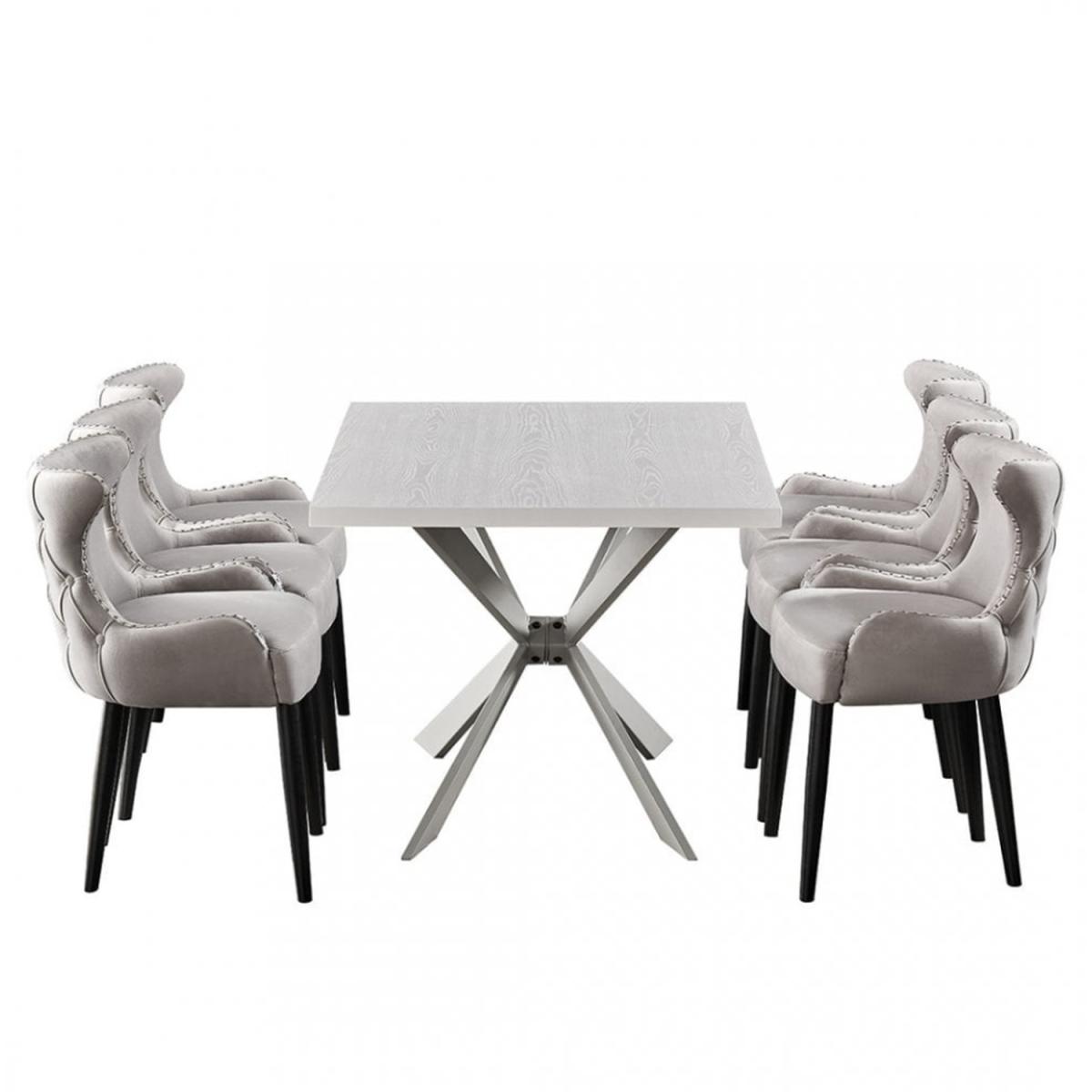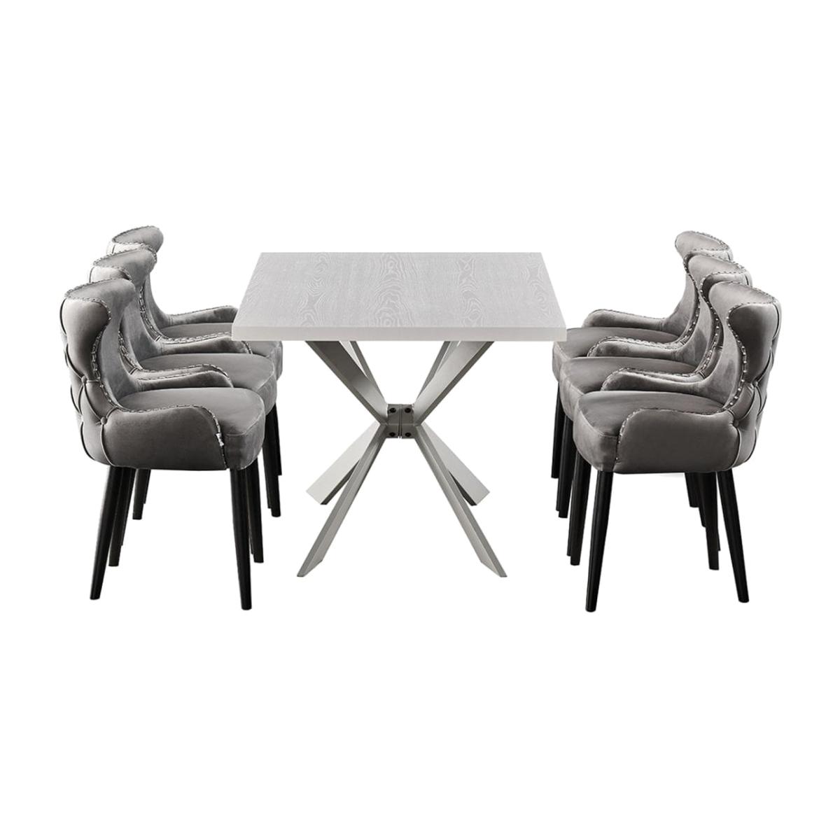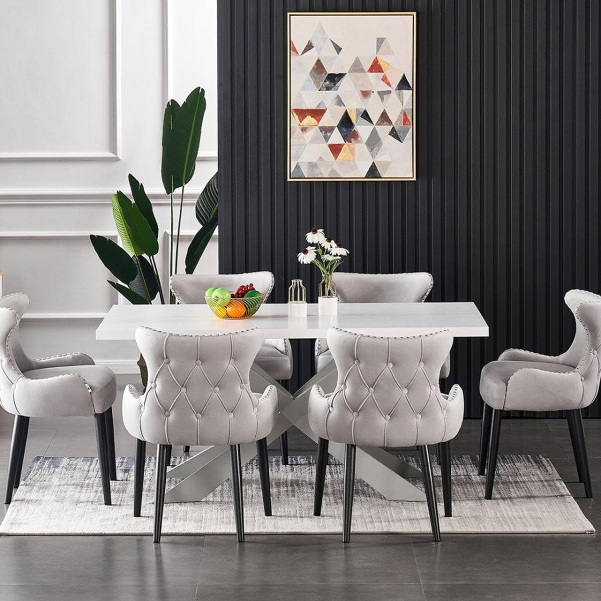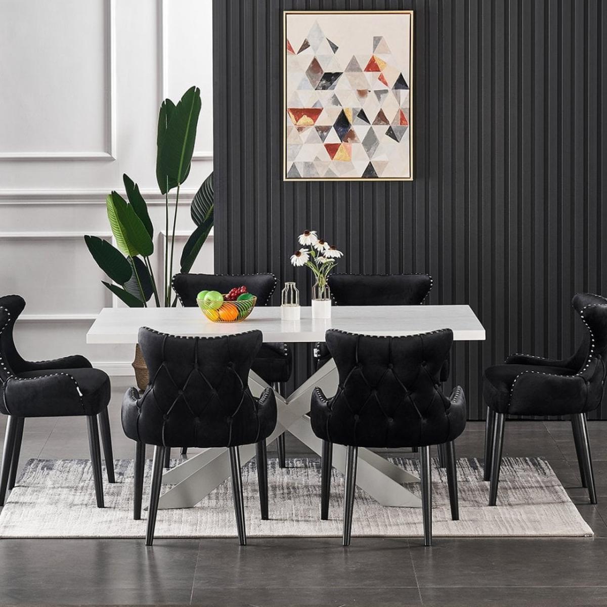 The Oxford Duke LUX Dining set offers an exceptional impression of the dining beauty with both typical and fashionable decoration. This dining set will deliver an excellent dose of charm to your dining room. Combined with a duke Table that is simplistic and versatile in design with a twist! The striking metal base demands attention all eyes on me. The cross metal legs provide, not just sturdy support but, a stunning and unique design feature that will get your guests talking. The legs feature floor protectors to avoid scratching your floors. The Oxford Velvet chairs, high-quality LUX furniture, featuring a padded quilted back and finished with amazing stud work and piping nestled on top of hard-wearing rubber wood legs, these design-led chairs will definitely be the life of the party if not steal the show! Upholstered in plush velvet and a high-quality density foam and fibre seat ensuring comfort levels are premium. A gentle curve to the back of the chair can fit your spine or back and provide you unparalleled comfort with each use.