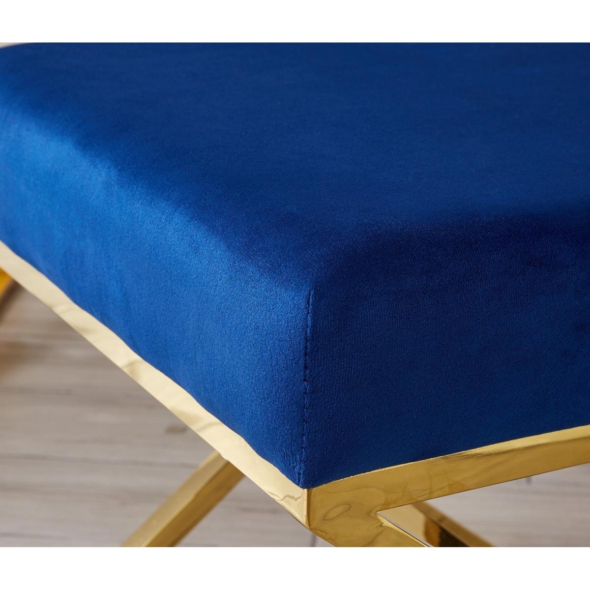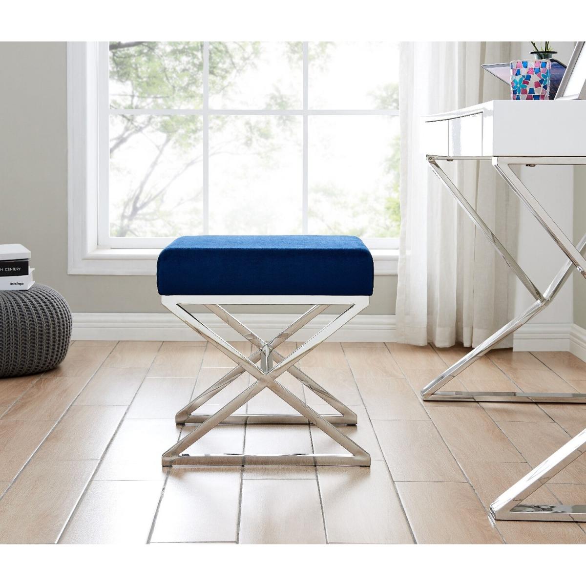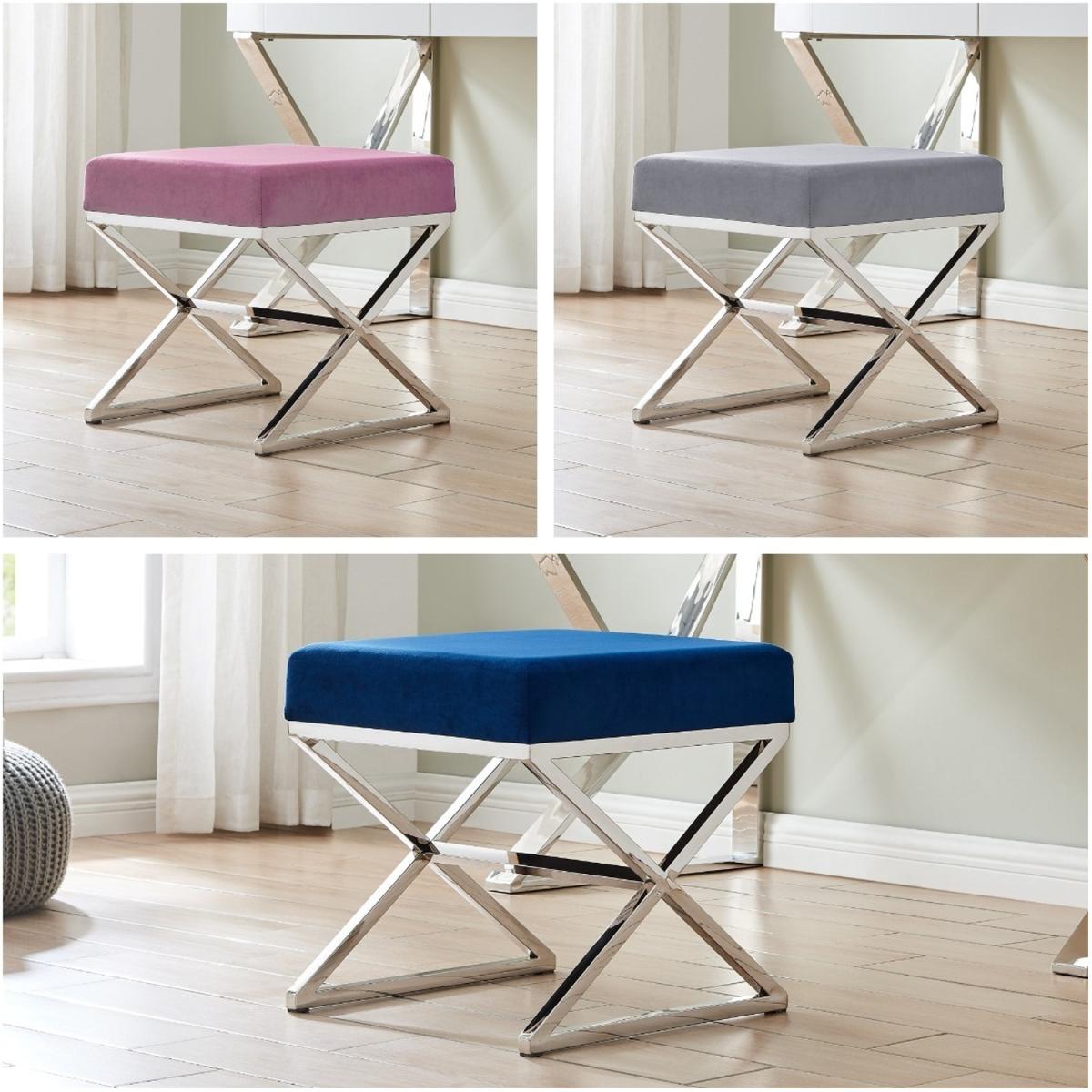 Introducing the Oxford stool bench, an on trend, velvet upholstered stool standing at 45cm tall on striking cross design chrome or gold-effect legs. The sumptuous velvet seat pads are soft to the touch and offer a little bit of luxury and glamour at an affordable price. The Oxford Stool is available in royal blue, blush pink or grey seat colours with a choice of chrome or gold legs and will make a statement wherever you decide to put it! This adaptable item can be used throughout the home as a footstool in the living room, a seat for the dressing table in the bedroom, in fact anywhere you want to add an extra pop of style! The dimensions are 45x45x45cm.