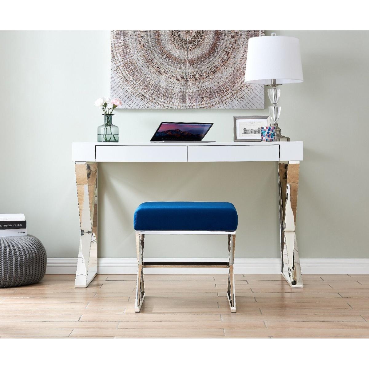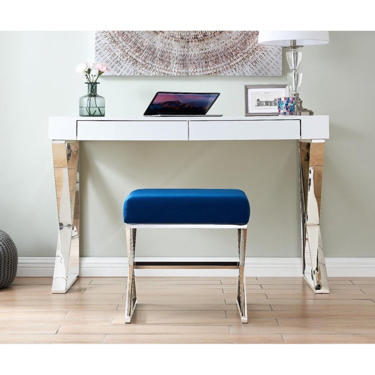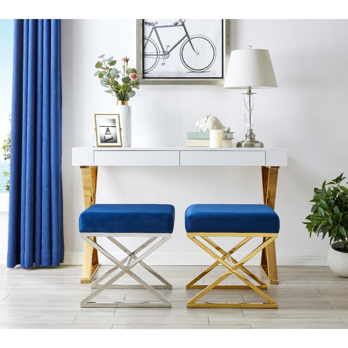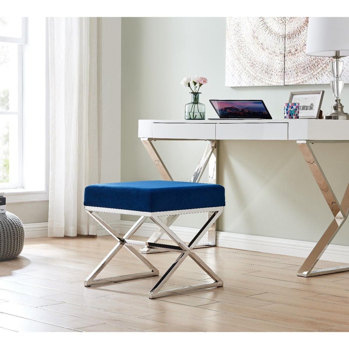 Introducing the Oxford stool bench, an on trend, velvet upholstered stool standing at 45cm tall on striking cross design chrome or gold-effect legs. The sumptuous velvet seat pads are soft to the touch and offer a little bit of luxury and glamour at an affordable price. The Oxford Stool is available in royal blue, blush pink or grey seat colours with a choice of chrome or gold legs and will make a statement wherever you decide to put it! This adaptable item can be used throughout the home as a footstool in the living room, a seat for the dressing table in the bedroom, in fact anywhere you want to add an extra pop of style! The dimensions are 45x45x45cm.