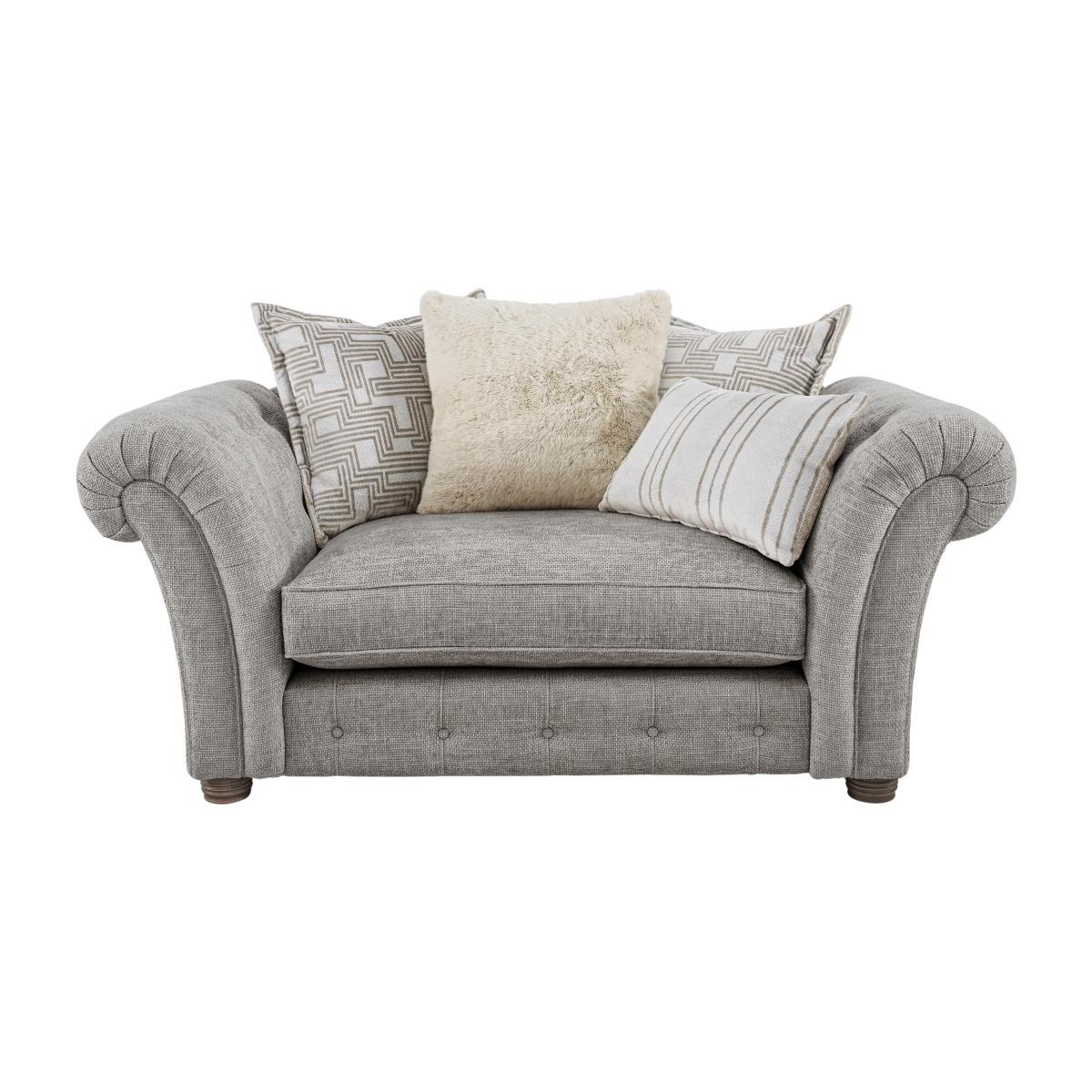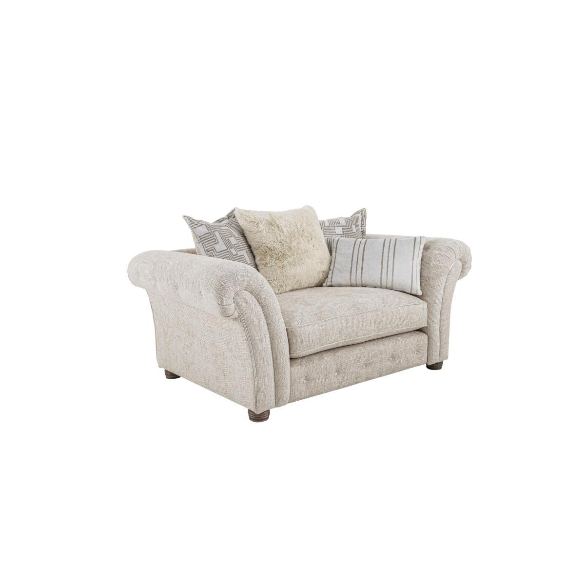 Whether you snuggle up or cuddle up, the Oyster Bay fabric scatterback snuggler will have you firmly in the chill zone. With its gorgeous scroll arms and deep seats, there’s nowhere else we’d rather be. Why you'll love it. A centrepiece snuggler, where elegant design meets luxe glam. Sink-into encore foam seat cushions with a 5-year plumpness guarantee. Extra-soft feather back cushions. Classic scroll arms. Soft chenille upholstery. Optional silver or gold trim detailing. (Not available with polar fabrics). Three scatter cushions and one bolster cushion included. Stylish round lime wash feet. Handmade in the UK, exclusively for Furniture Village. What you need to know. Supportive zig-zag spring seats. Solid hardwood rails. Some fabrics can show wear on areas of more use or in direct sunlight. Plump, turn and rotate seat and back cushions regularly if possible. Please read our upholstery care guide for more advice. Part of the refined yet glam Oyster Bay range.