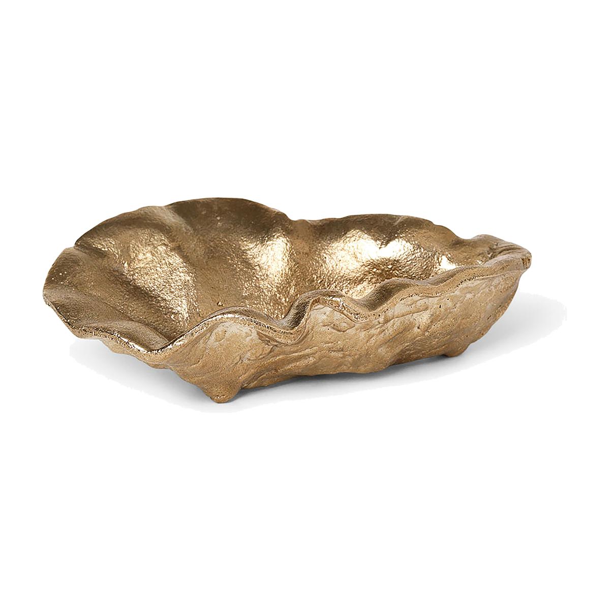 Oyster decoration bowl 10. 5 cm from Ferm Living is made of brass and was designed to mimic one half of an oyster. The irregular form of the bowl adds a personal aesthetic to your interior decoration and the glossy finish creates beautiful reflections when hit by the light. Place the Oyster decorative bowl as it is on a bookshelf or let it be a practical place to hold keys or other small items on a sideboard in the hall.