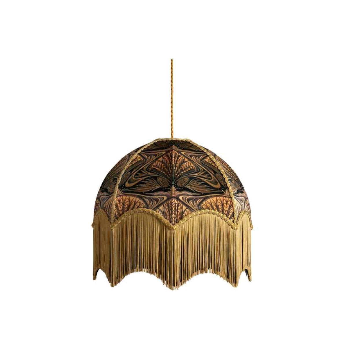 About The Anna Hayman Designs Oyster Lamp ShadeThe Anna Hayman Designs Oyster Lamp Shade exudes a gorgeous Art Nouveau design in four functional sizes and two plush fabrics. Showcasing a detailed, complex print in an array of soft black, gold and subtle purple hues, this unique lamp shade transports you back to the roaring ‘20s with its luxurious colourway and embellished design. Elevating the piece with show-stopping style, this statement lamp shade features an intricately embroidered trim with a shaggy long gold fringe that’s reminiscent of glamorous flapper dresses. Marvellously handcrafted by Anna Hayman Designs in Sussex, these shades are fully lined with a choice of white or gold lining. We also offer a choice of lamp or hanging pendant attachments so you can style this quirky lamp shade as the focal point of a room or as an accent piece on a side table or bedside table. With the option between two plush fabrics, Duchess Satin or sumptuous Velvet, this elegant lamp shade will make for a luxurious statement in your home. Available in XL, L, M & S, you won’t be disappointed with the shade you receive, it is truly a piece of art!Why We Think You’ll Love The Art Deco Lamp ShadeWhy not treat yourself to a divine piece of artistry! This glamorous interior treasure exudes a burst of luxury that will inject instant wow-factor into your scheme. This extraordinary lamp shade is carefully handcrafted by high skilled artisans in the UK who carefully cut and stretch the fabric over the frames with extreme care. Serving as an opulent showpiece, the Duchess Satin fabric radiates a brighter radiant glow than the soft velvet, as does the white-lined interior compared to the gold. If you prefer the thicker velvet fabric we recommend opting for a high voltage bulb so the glow emits through the luxurious fabric. Where To Style The Satin Lamp ShadeEmbrace the magnificent charm of the Art Deco era by displaying this extra-large size of this decorative lamp shade with the pendant attachment in a living room or dining room scheme. Its boldly beautiful designs exudes extreme grandeur that will steal the show in your interior scheme. Alternatively, if you prefer to opt for the lamp attachment, this velvet lamp shade will be a ravishing bedside table lamp in a bedroom scheme.