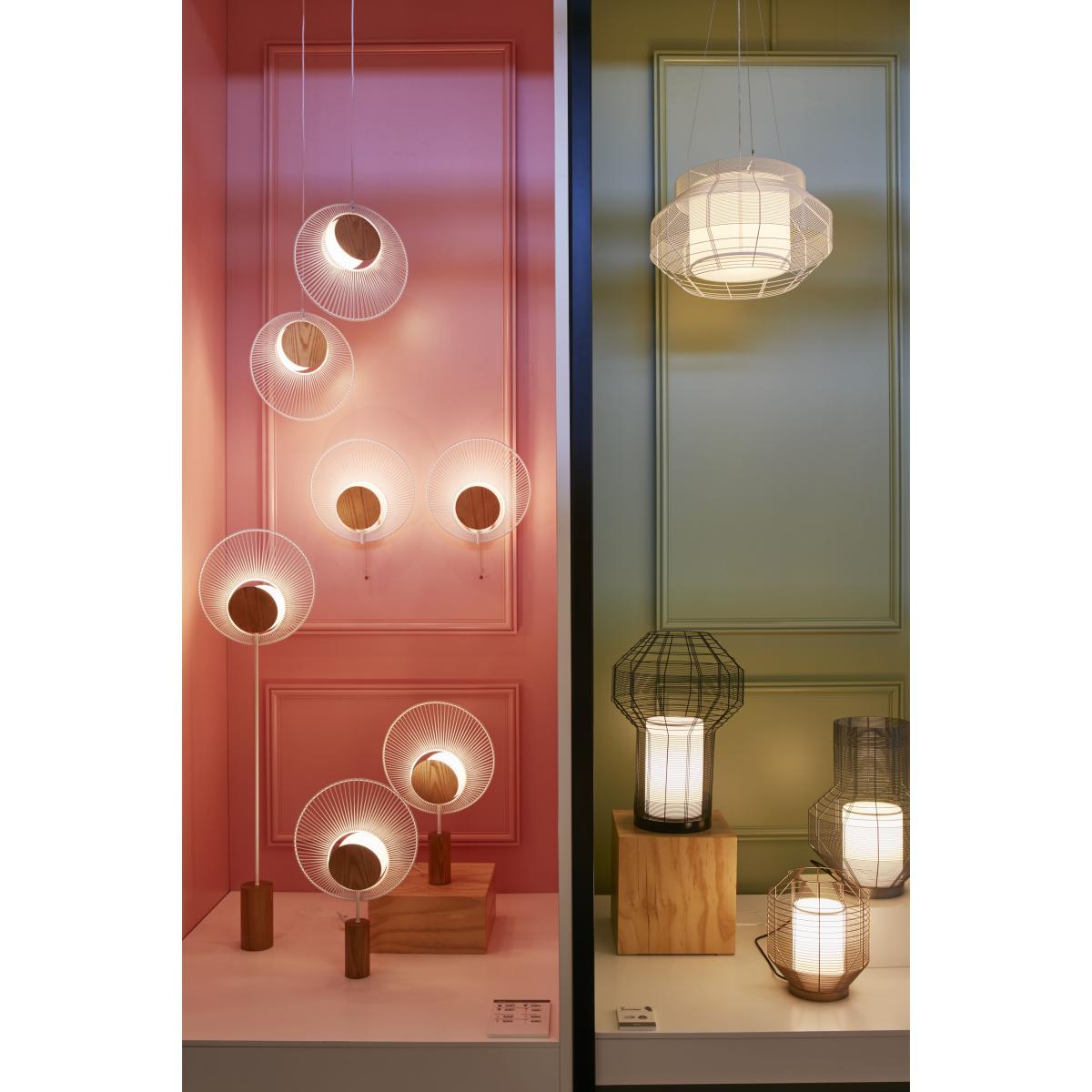 Elegance and graphic lines come together in this sublime collection of Oyster lights by Jette Scheib. Their design reminds us of an oyster containing a pearl that diffuses a precious light. Oyster offers a tasty mix of materials. The base is oak. The large, flat, round lampshade is made of cotton thread braided on a thin metal frame. At the centre of the lampshade is the bulb, hidden behind an oak disc. The bulb diffuses an indirect light, soft and geometrical thanks to its original form.