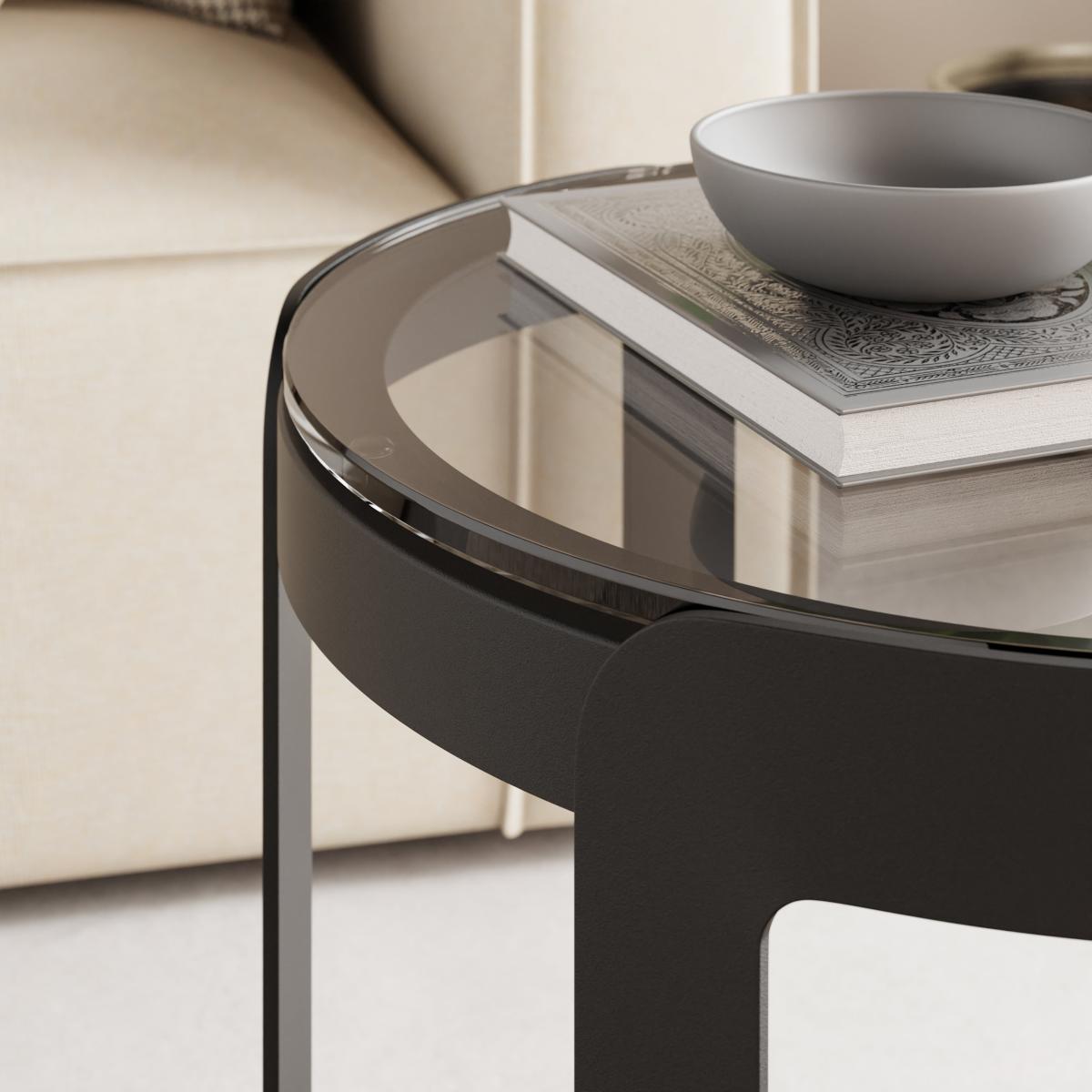 This side table is a sleek and versatile addition to your living space. This compact yet stylish side table is designed with sophistication in mind, featuring a sleek finish that perfectly complements the smoked glass top. It's the ideal solution for holding coffee table books and setting the ambiance with candles.